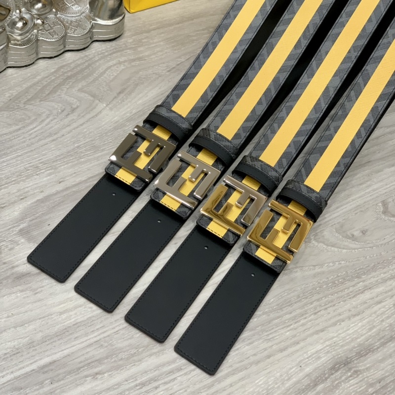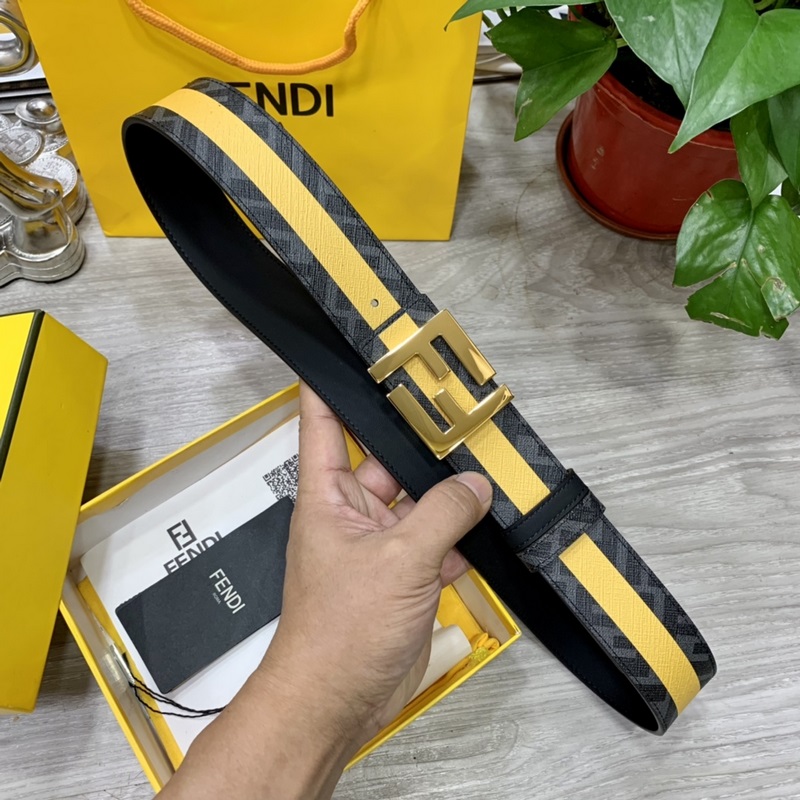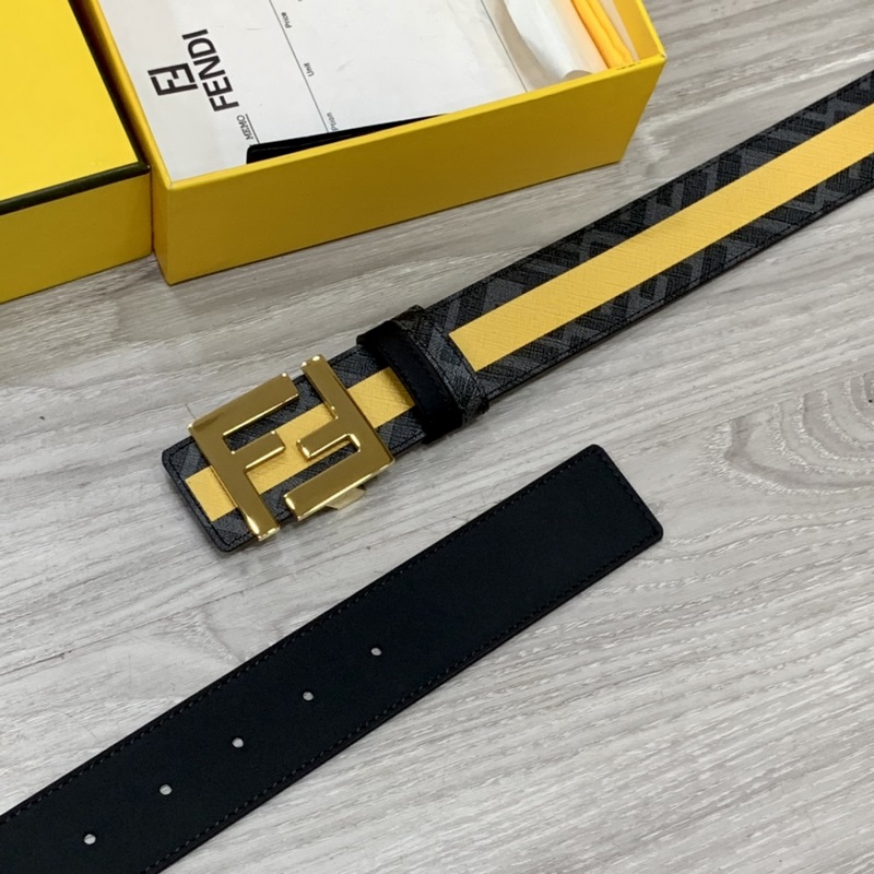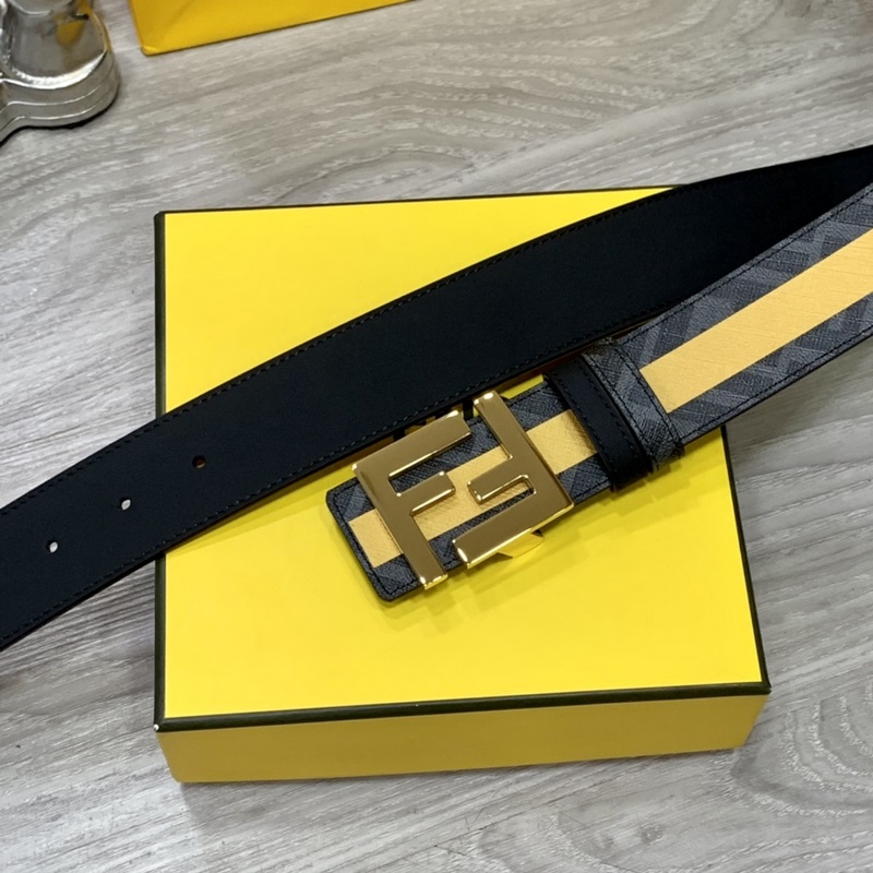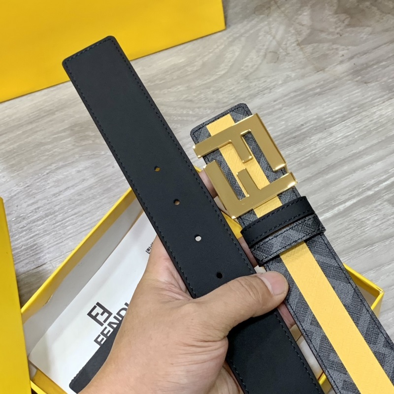 FENDI vastatyyli 4,0 cm leveä kaksisilmukkainen käännettävä vyö FF-solki Musta Cuoio Romano nahkamateriaali Tupakankeltainen ja musta FF-kuvio kääntöpuolella Neliönmuotoinen timanttimetalliviimeistely Muodikas ja klassinen All-match-tyyli
