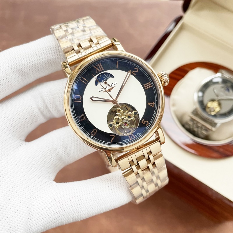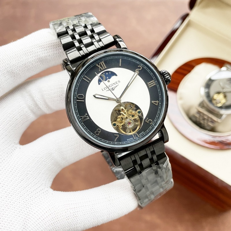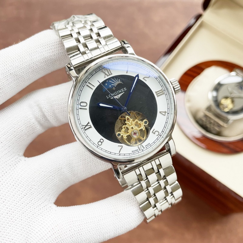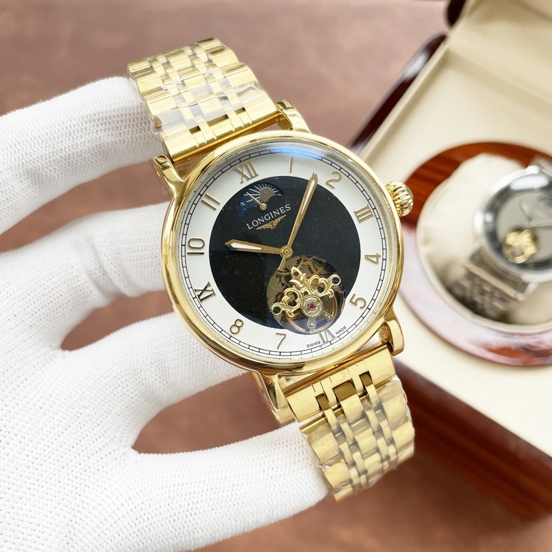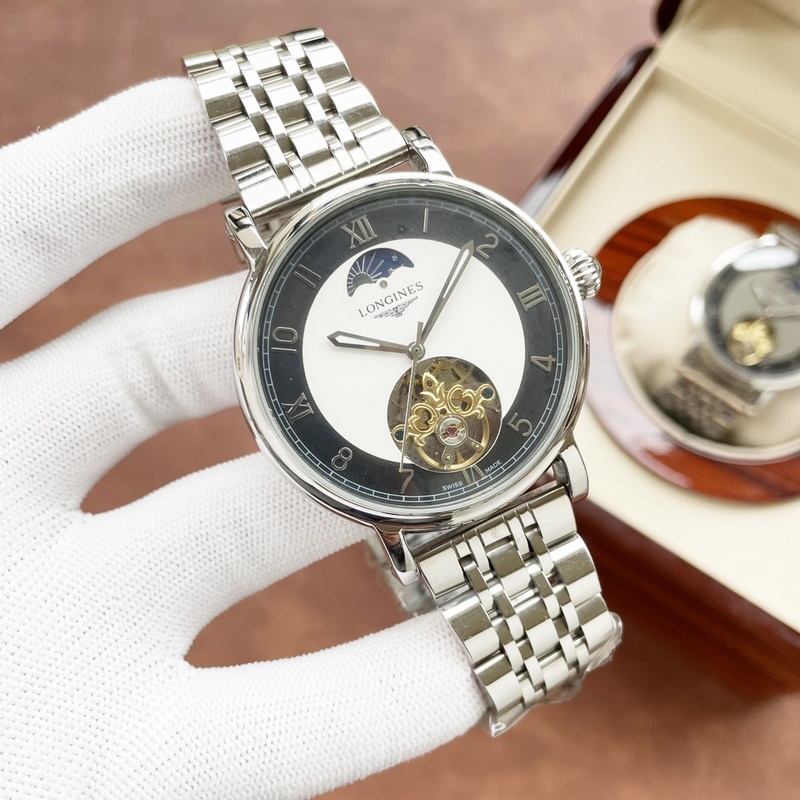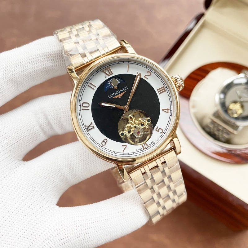 Longines miesten kello, iso vauhtipyörä kuuvaihesuunnittelulla, hienoa ammattitaitoa, omaperäisyyttä, jaloa ja herrasmiesmäistä. Se ottaa käyttöön täysin automaattisen mekaanisen liikkeen, top 316 ruostumattomasta teräksestä valmistettu kotelo ja hihna, mineraalinen superpeili, koko 42 * 13