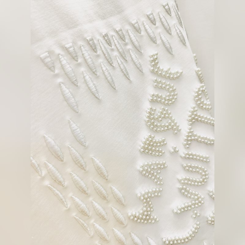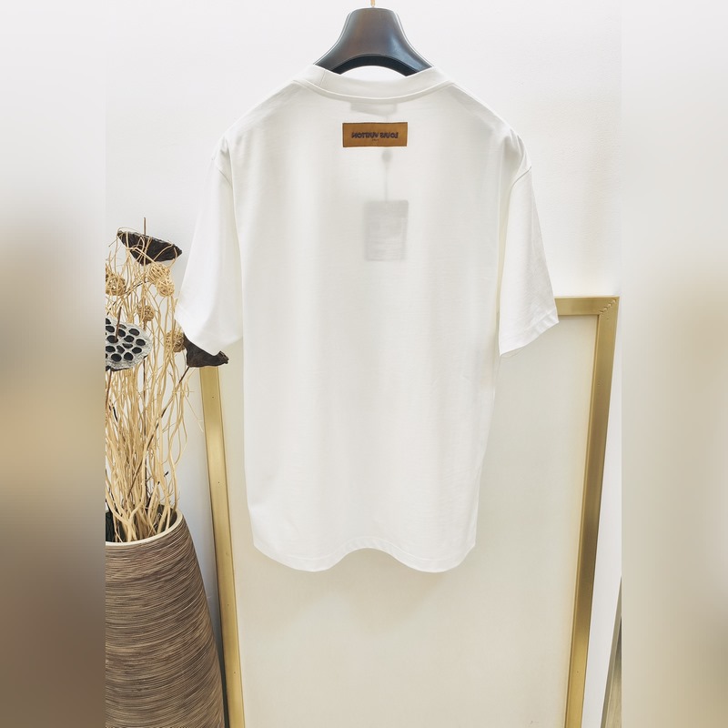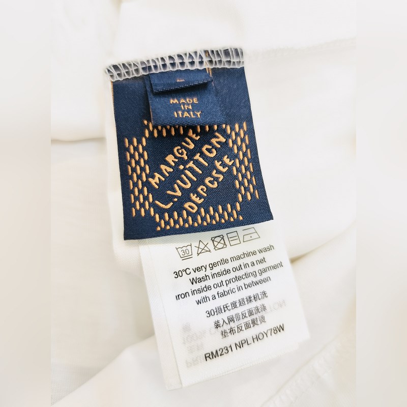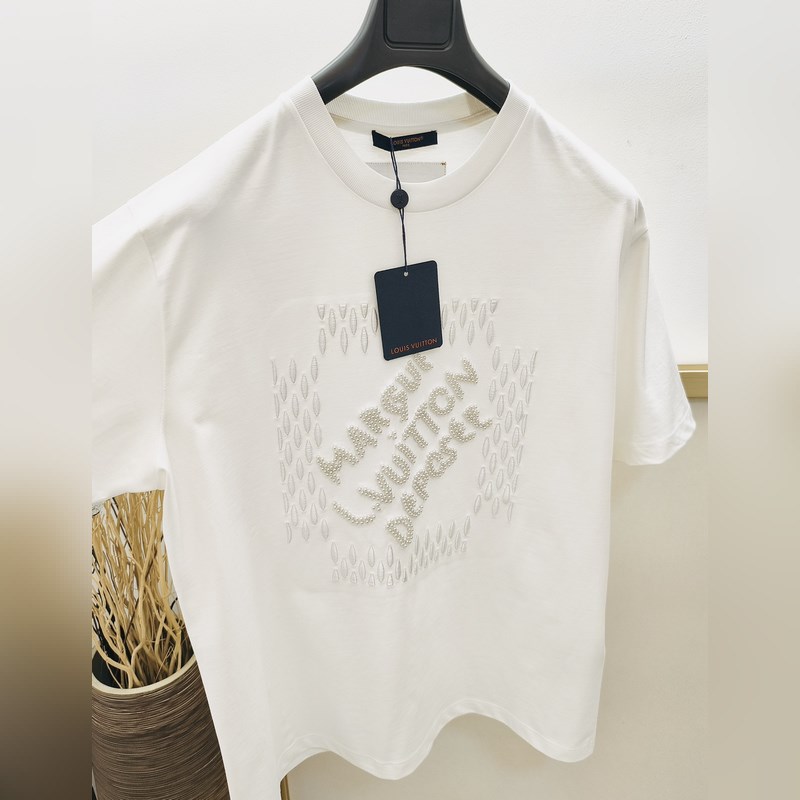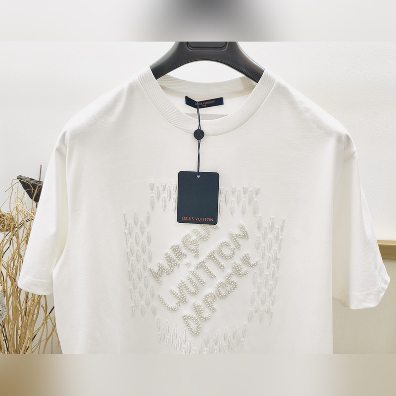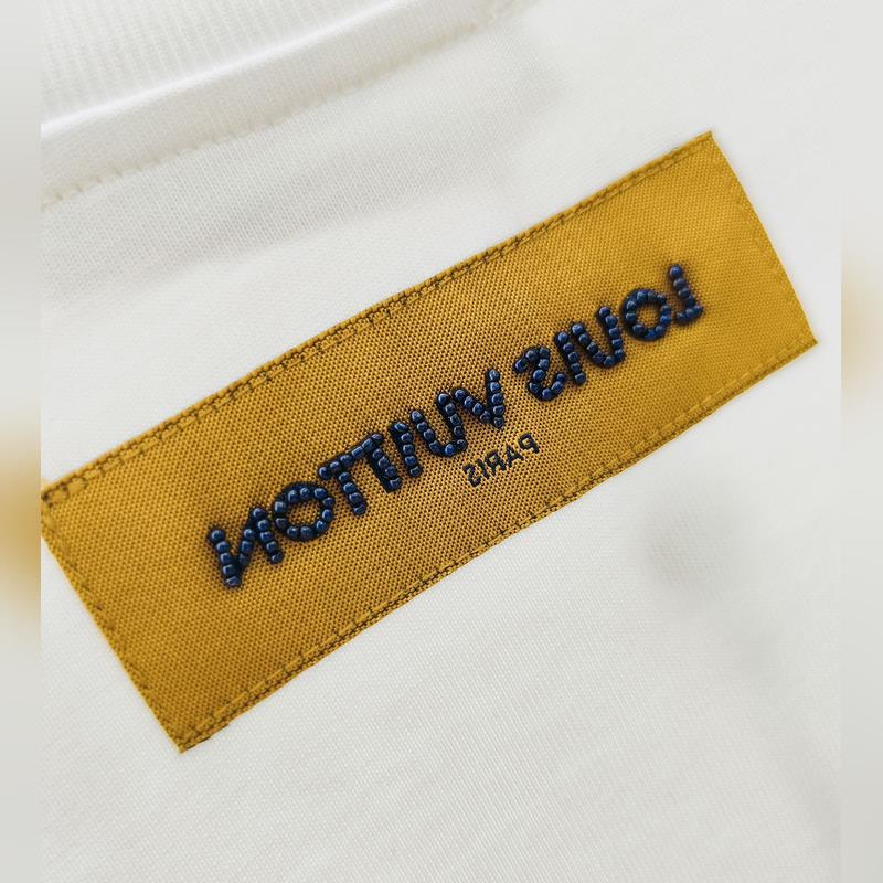 1V Louisin historian kallein brodeerattu/helmihelmillä koristeltu lyhythihainen T-paita Tässä puuvillaisessa T-paidassa on Marque L. Vuitton déposée -logo, jonka on luonut uusin suunnittelija Pharrell Williams/Pharrell, joka viittaa brändiin archi. Helmikirjonta ja herkät silkkilangat korostavat kauden hienoa teemaa, ja helmillä brodeerattu etiketti, jossa on kääntövaikutelma selässä, tuo trendikkään tunnelman rennon ilmeeseen.