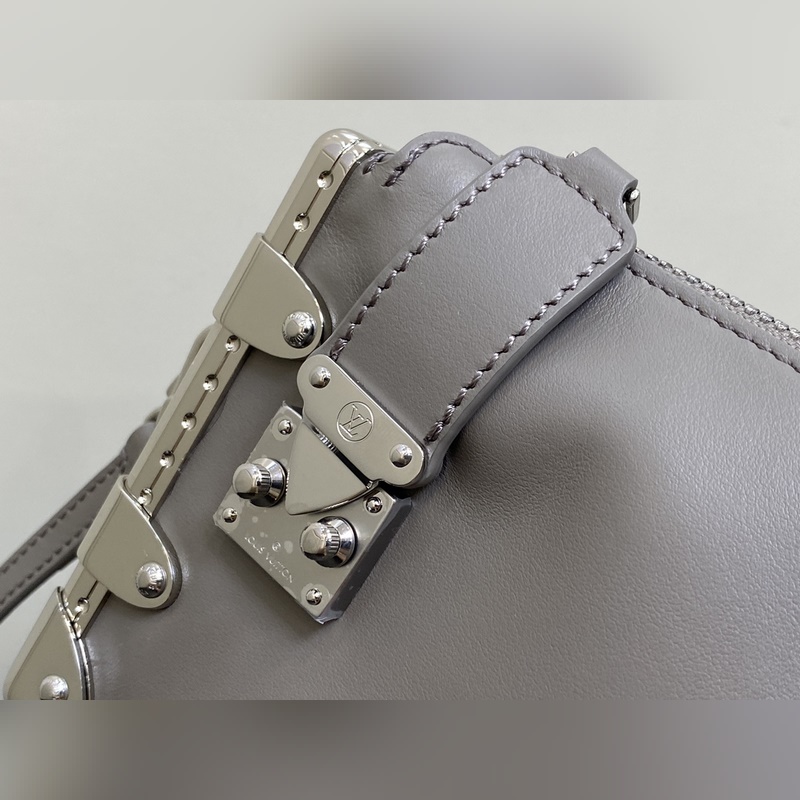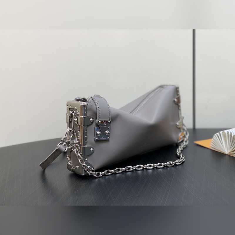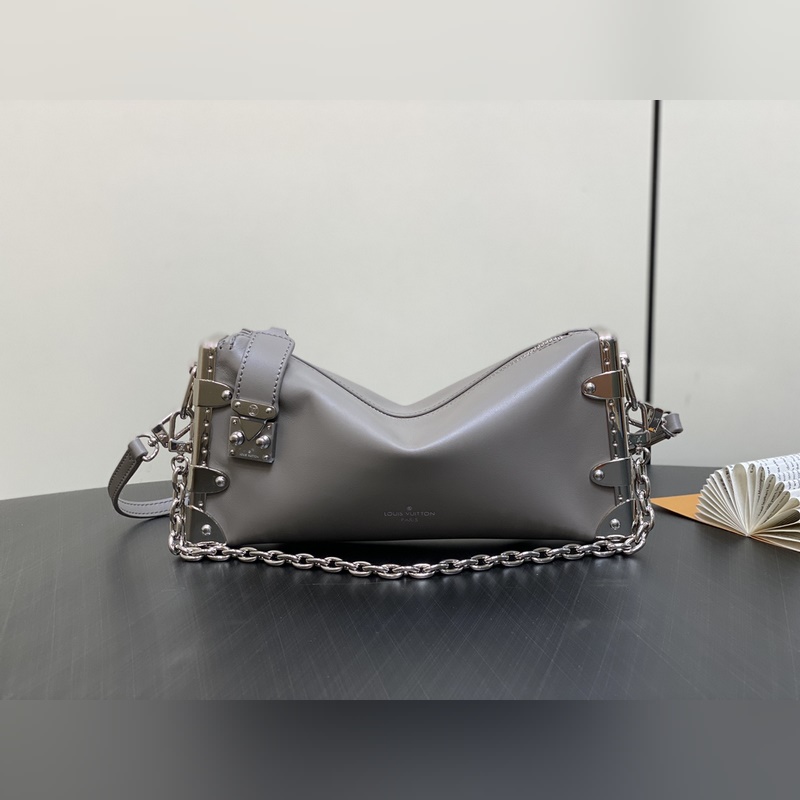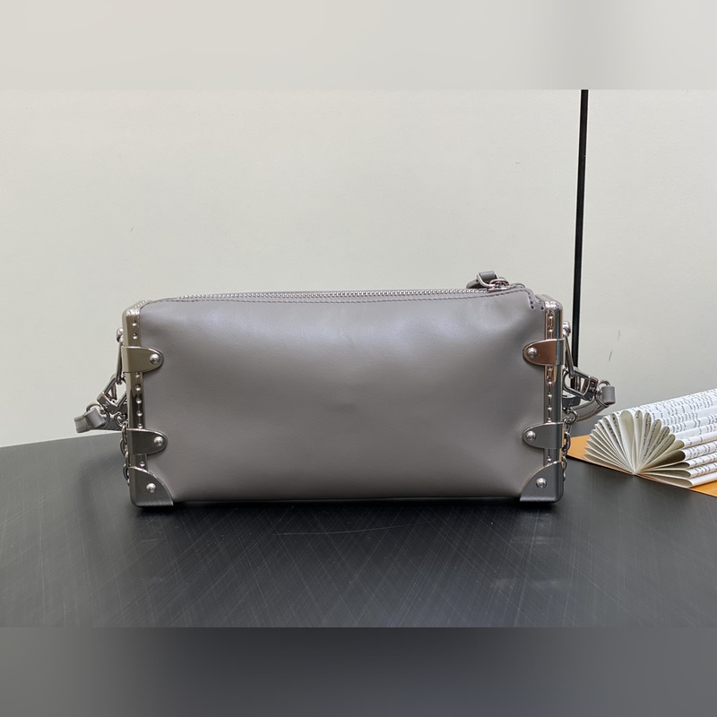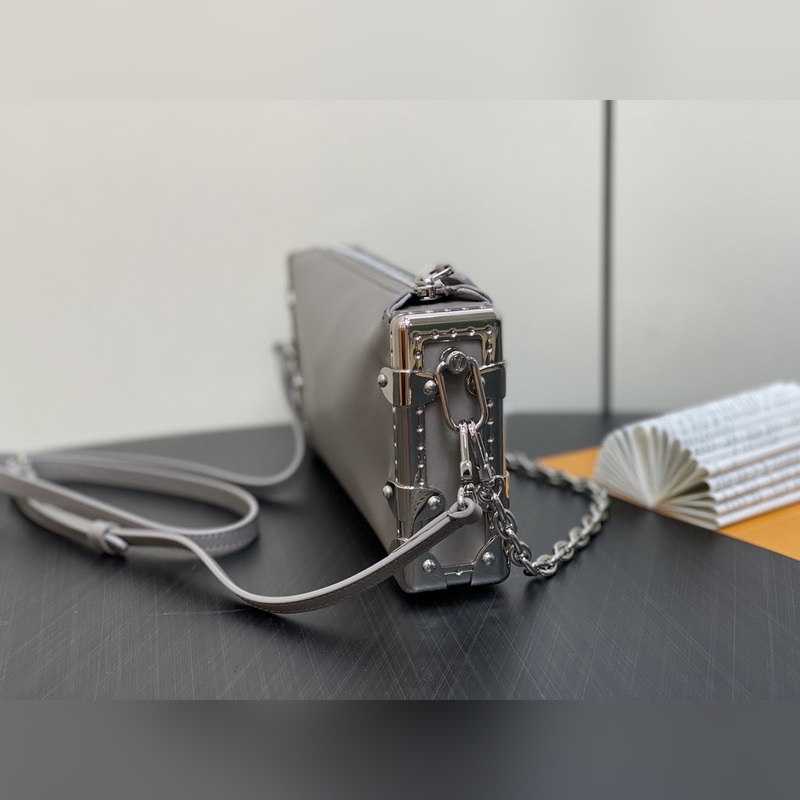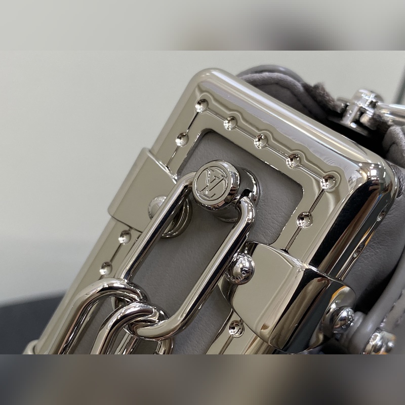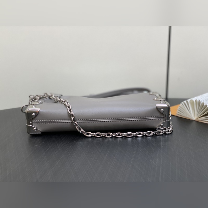 Huippualkuperäinen M25445 harmaa täysnahkainen Soft Box -sarjan SLIM TRUNK -käsilaukku Tämä Slim Trunk -käsilaukku saa inspiraationsa Louis Vuittonin perinteisestä kovasta kotelosta. Siinä on integroitu niittikehykset ja metalliset S-lock-soljet pehmeään lehmännahkaan korostamaan avantgarde rock -tyyliä. Kiiltävä ketju ja säädettävä nahkainen olkahihna ovat molemmat irrotettavissa, mikä tarjoaa erilaisia kantovaihtoehtoja. Koko: 23 x 12 x 4 cm (pituus x korkeus x leveys)