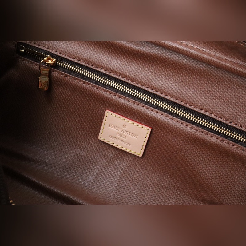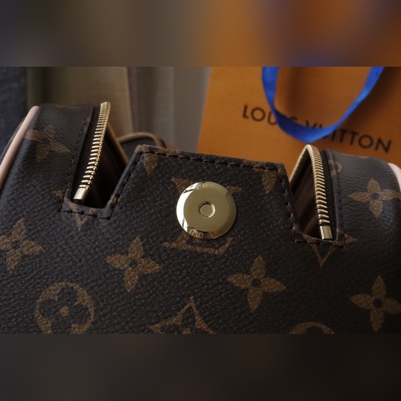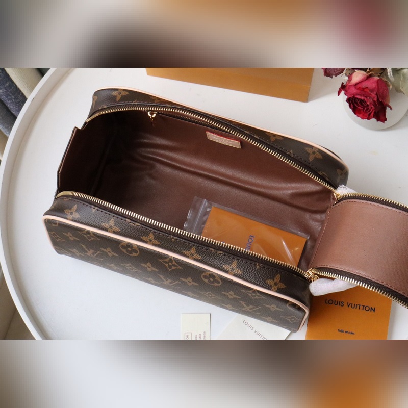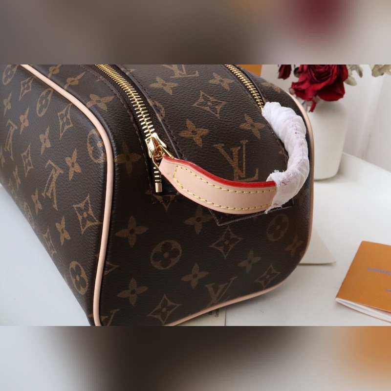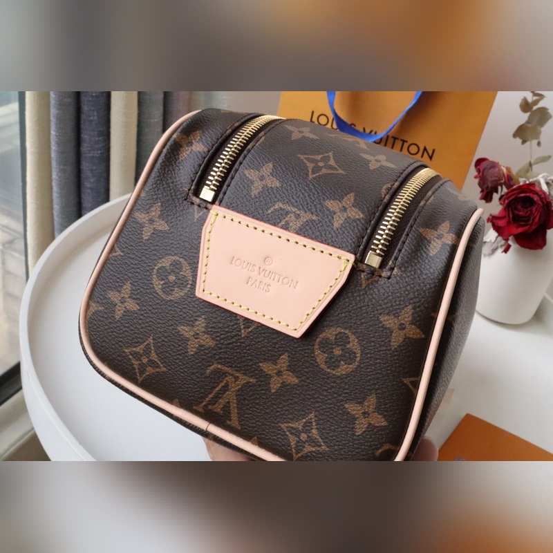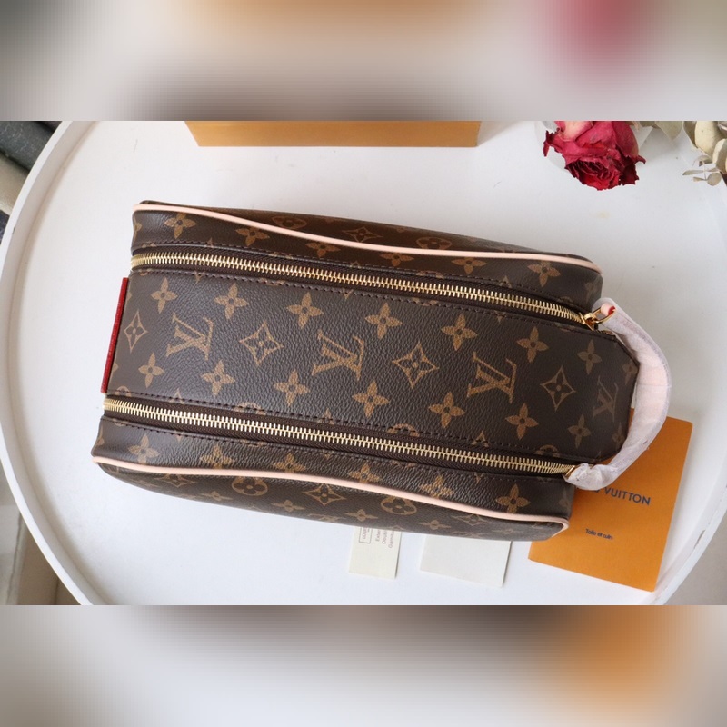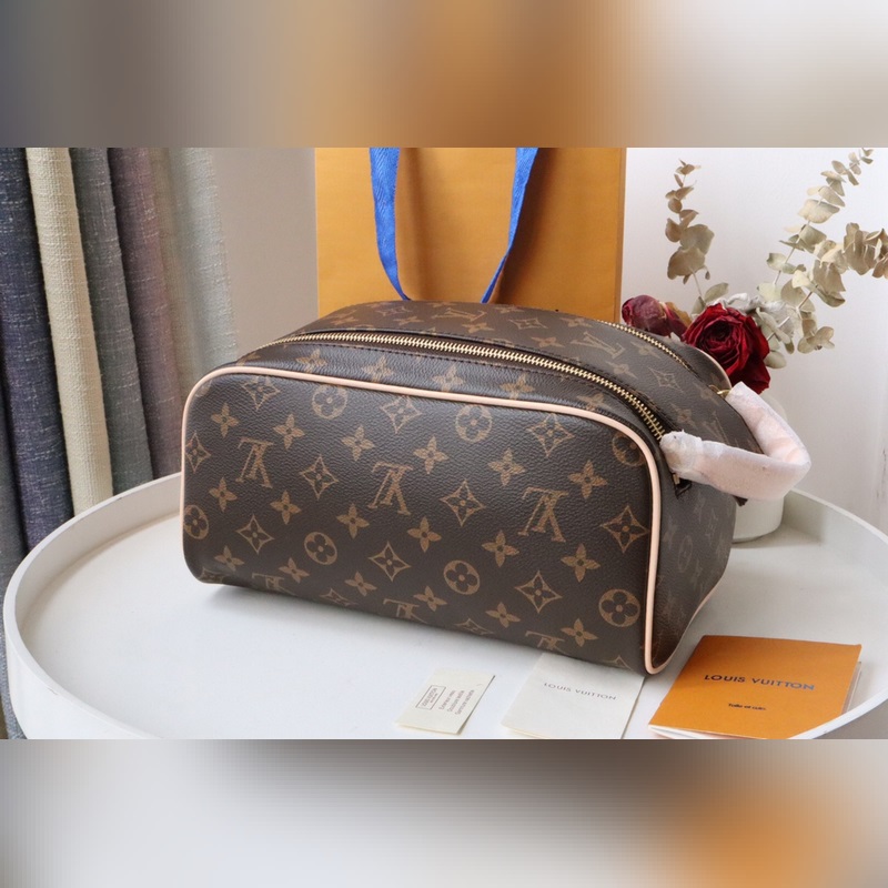 M44494 Monogram kosmetiikkalaukku -tuotepussisarja DOPP-kylpytuotelaukku Louis Vuittonin ikoninen Monogram-kangas ja lehmännahkainen nahkareunus luovat Dopp-kylpytuotelaukun klassisen viehätyksen. Tilavaan sisätilaan mahtuu turvallisesti hygieniatuotteita ja vetoketjulliseen pussiin pienet tavarat. Leveä nahkakahva voidaan kuljettaa mukavasti tai asettaa koukkuun, joten se on välttämätön matkakumppani. Yksityiskohtaiset ominaisuudet 28 x 15 x 16,5