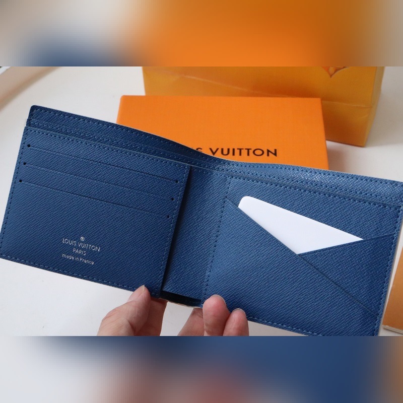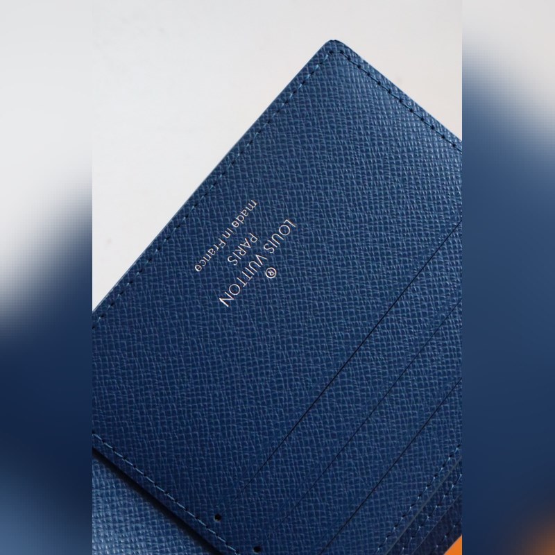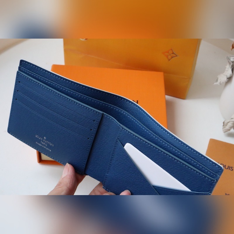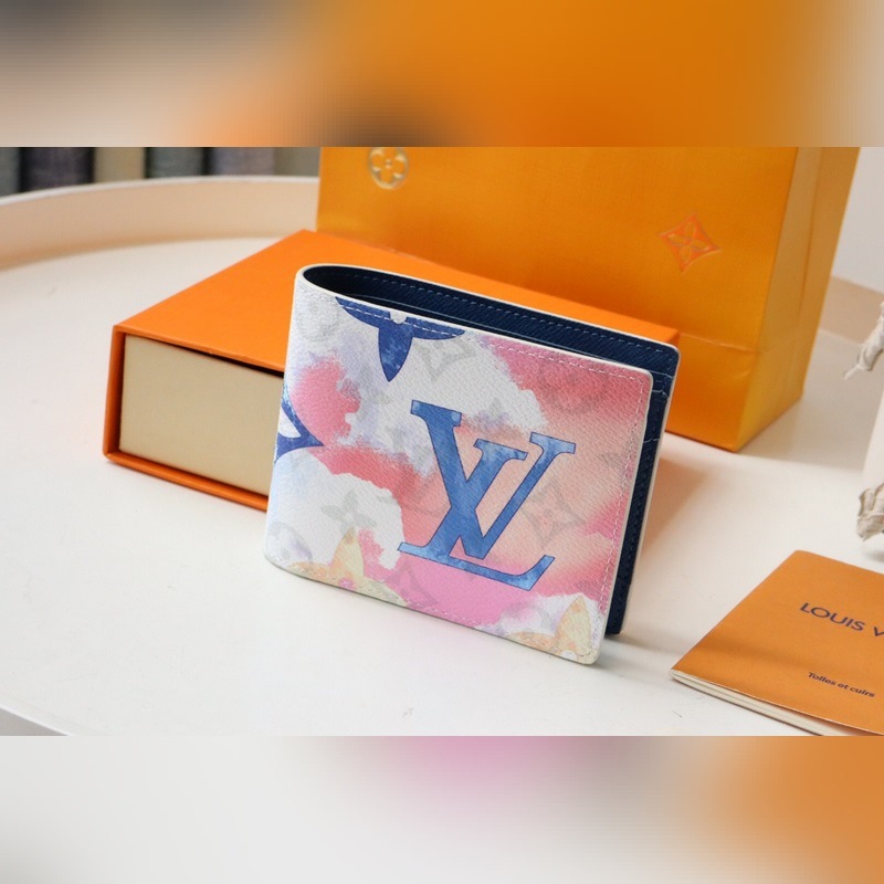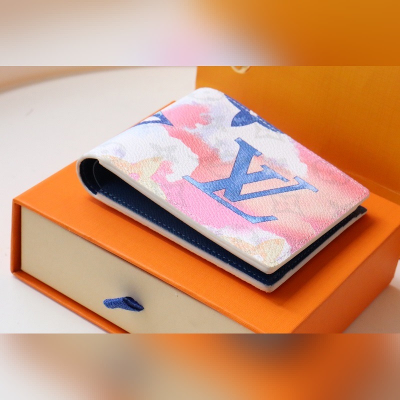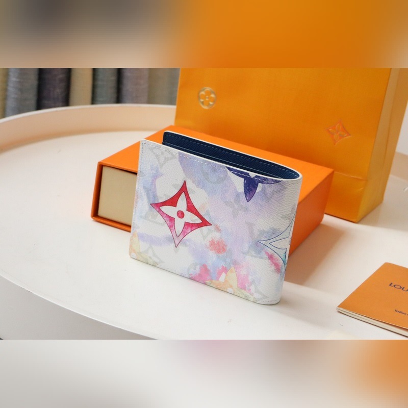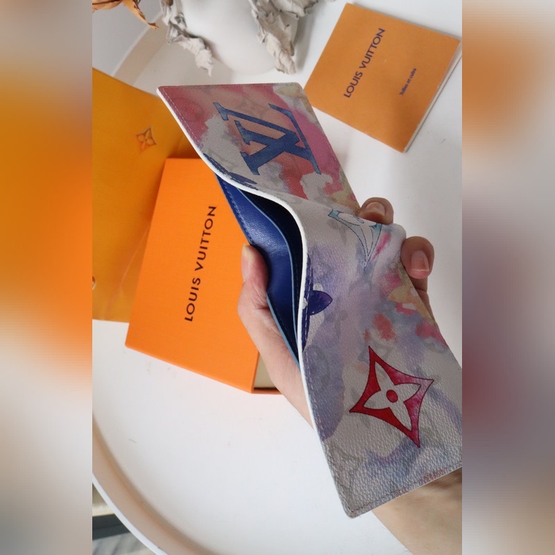 Made in Monogram Watercolour Blue canvas, jossa Virgil Ablohin epäsäännöllinen Monogrammi-kuvio kesäkaudelle, korttipaikat, setelitasku ja sivulokero. 11,5 x 9 x 1,5 cm