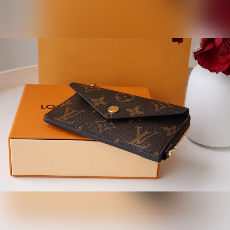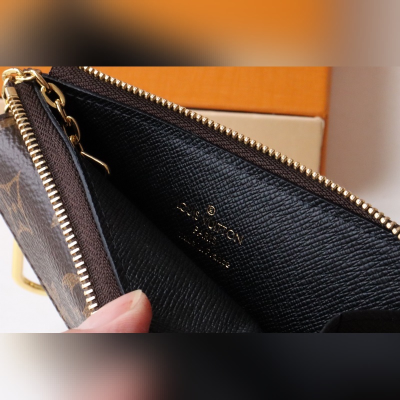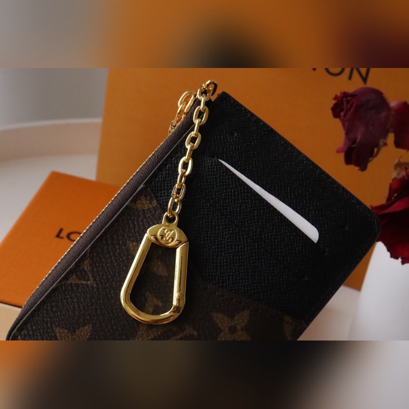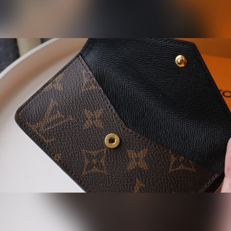 Klassinen Monogram-kangas on viimeistelty siisteillä nahkareunoilla ja kolikkolokero avataan leveällä L-muotoisella vetoketjulla. Siinä on kirjekuorimainen etutasku, keskitasku taitetuille seteleille ja takakorttipaikka. Se voidaan kiinnittää myös käsilaukkuun tai vyöhön koukulla.