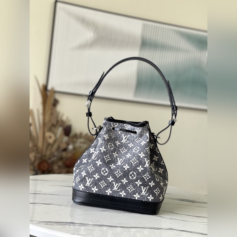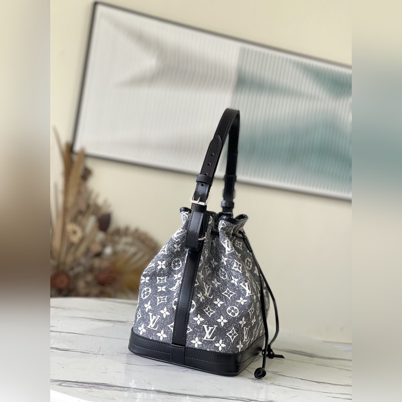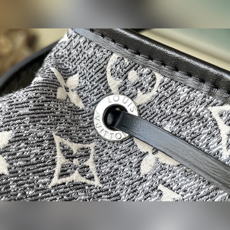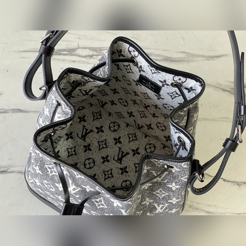 Tyyli: M21461 Uusi (Denim) Tämä Petit Noé -ämpärilaukku on valmistettu hiekkapestystä jacquard-denimistä, jossa on nahkareunukset ja tikkaukset. Kompakti muoto sisältää runsaasti tilaa, kiristysnyöri varmistaa turvallisen säilytyksen ja säädettävä olkahihna mahdollistaa olka- ja poikittaisvaihtoehdot. Mitat: 25 x 28,5 x 20 cm