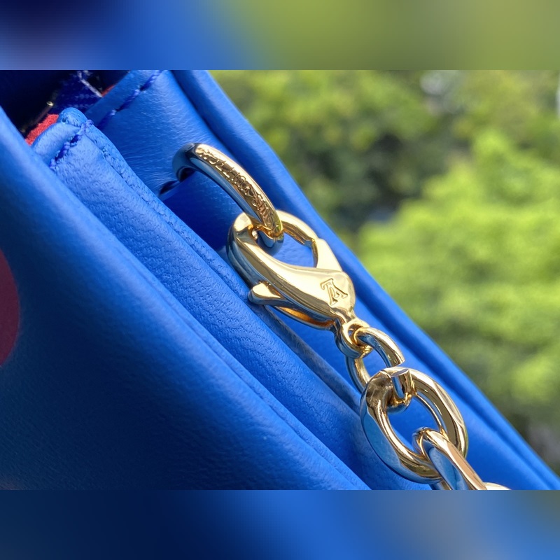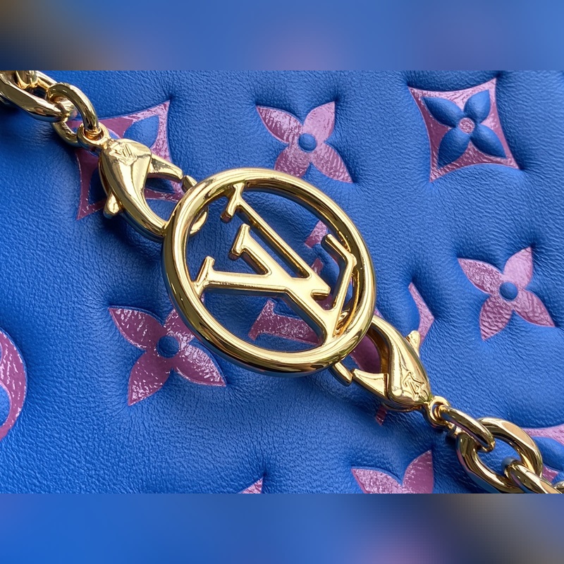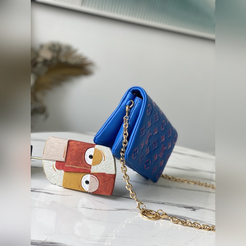 Valmistettu Monogrammilla kohokuvioidusta lampaannahasta, siinä on pehmeä rakenne kuin tyyny. Nerokkaan muodon ansiosta voit liikkua sen kanssa. Koristeilla koristellun irrotettavan ketjun ansiosta sitä voidaan käyttää myös clutch- tai vyölaukkuna. Mitat: 20 x 14 x 8 cm