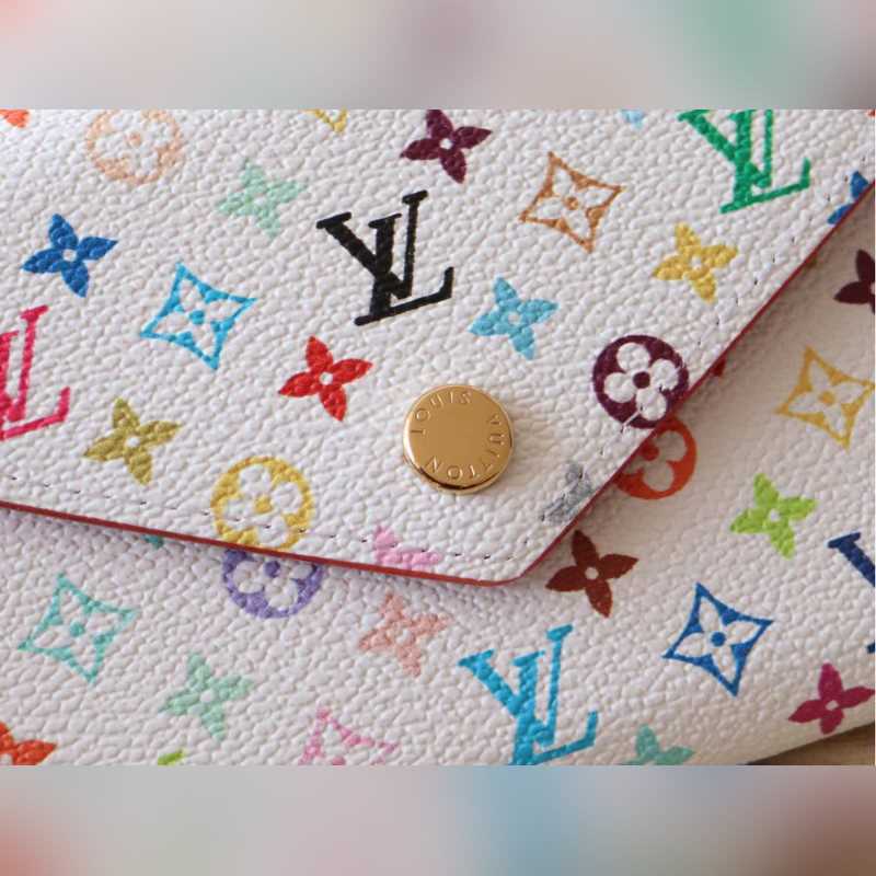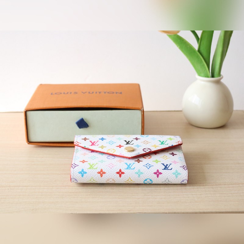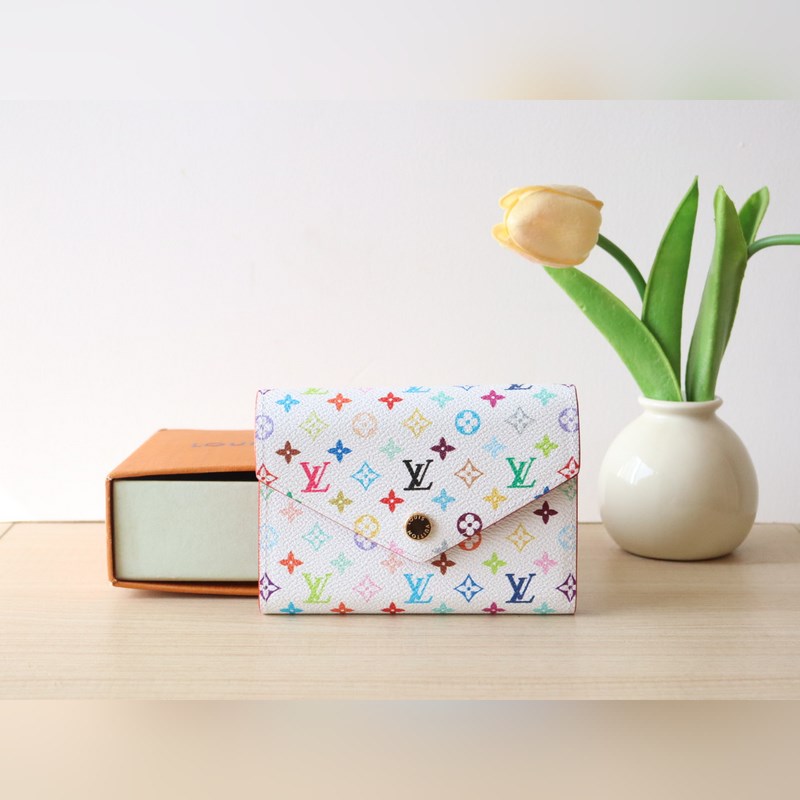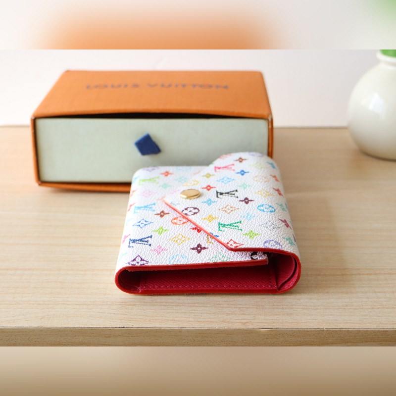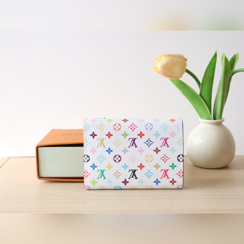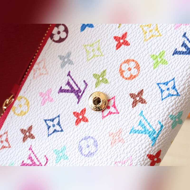 14163 Kolmivärinen kolmitaittoinen lompakko Tämä Louis Vuitton x Murakami Victorine -lompakon kopio on pieni ja hieno. Värikäs Monogram-kuvio tulkitsee klassisen Louis Vuitton -logon uudelleen japanilaisen taiteilijan Takashi Murakamin tunnetuissa sateenkaaren sävyissä. Lompakko on valmistettu päällystetystä kankaasta, jossa on hieno lehmännahkainen vuori ja hopeanväriset tarvikkeet. Siinä on vetoketjullinen kolikkolokero ja sisällä useita lokeroita seteleiden ja käyntikorttien säilyttämiseen. 12 x 9,5 x 2,5 cm (pituus x korkeus x leveys)