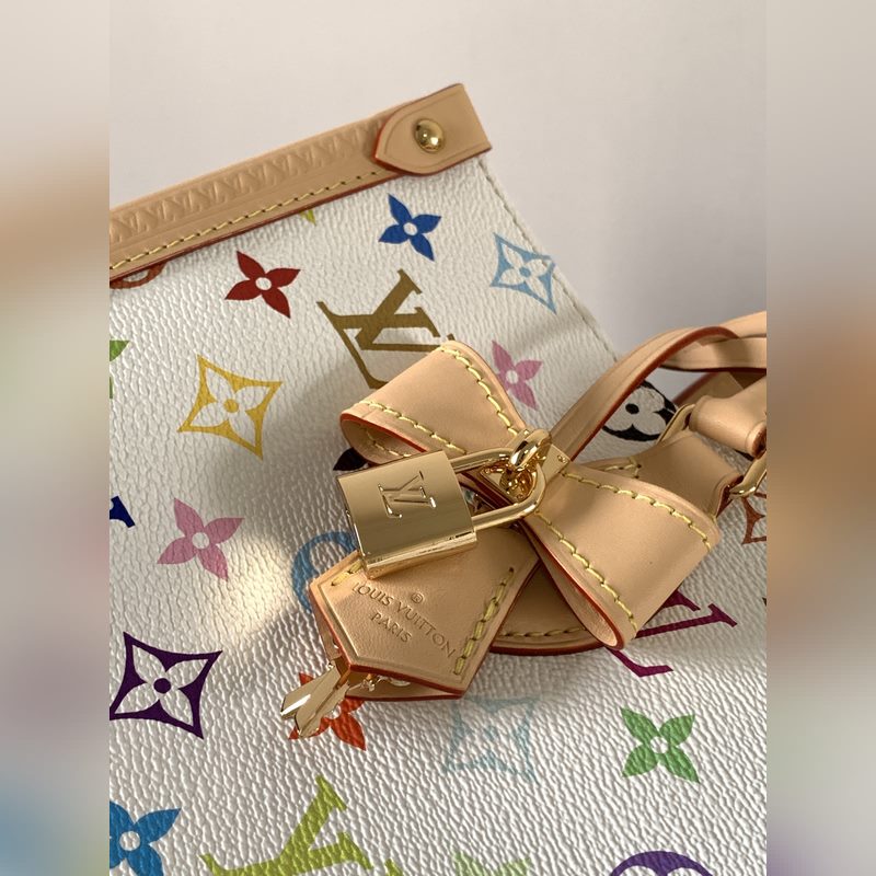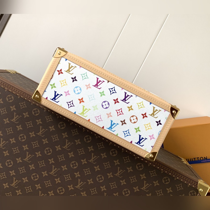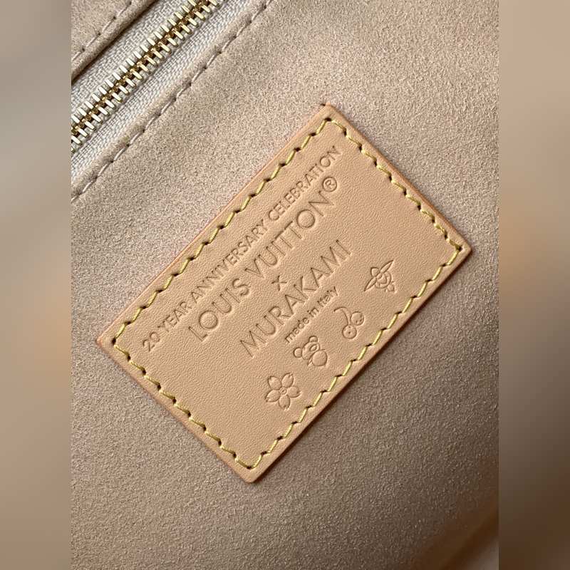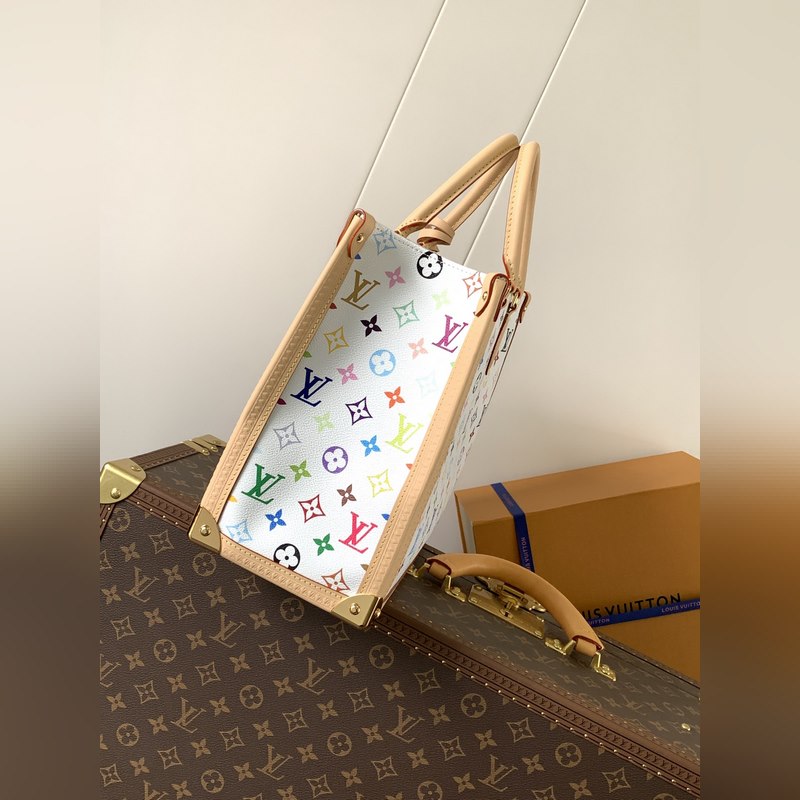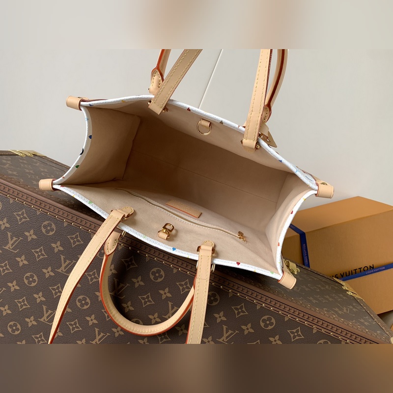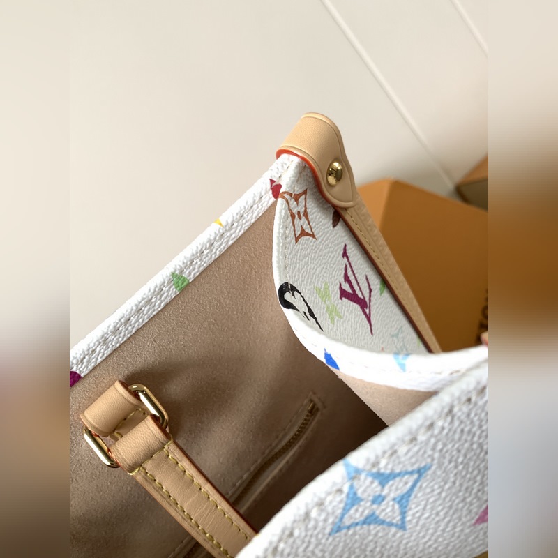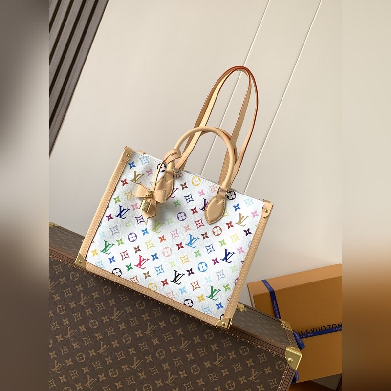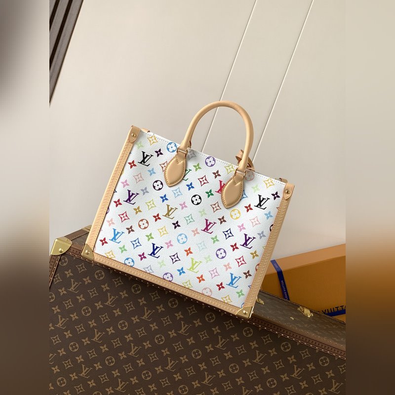 Louis Vuitton x Takashi Murakami Re-edition -sarja tulkitsee OnTheGo-keskikokoista käsilaukkua älykkäillä vedoilla. Värikäs Monogram-kangasrunko, lehmännahkainen verhoilu ja LV x TM -avainlaukku korostavat hienostunutta tyyliä. Kirkkaat kulmat muistuttavat perinteistä Louis Vuitton -laukkujen muotoilua, ja olkahihna ja yläkahva mahdollistavat useita kantotapoja.