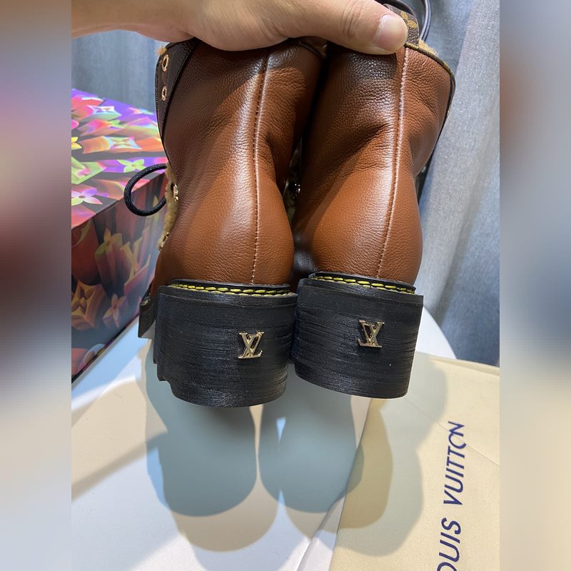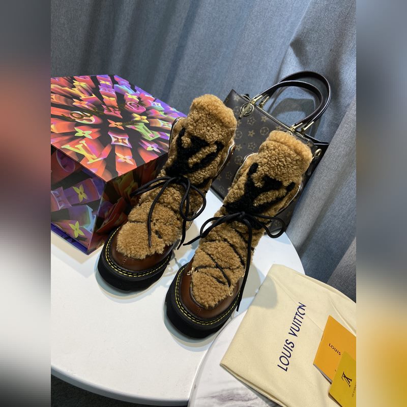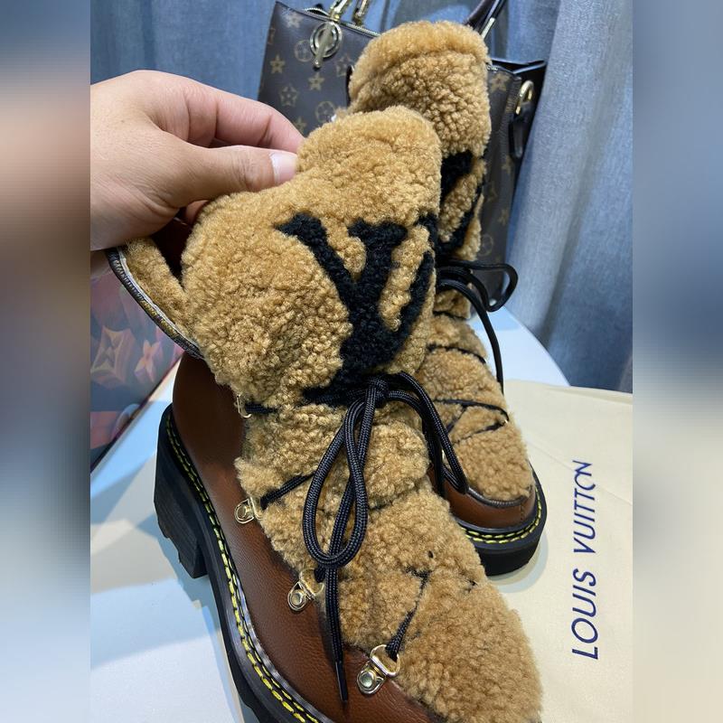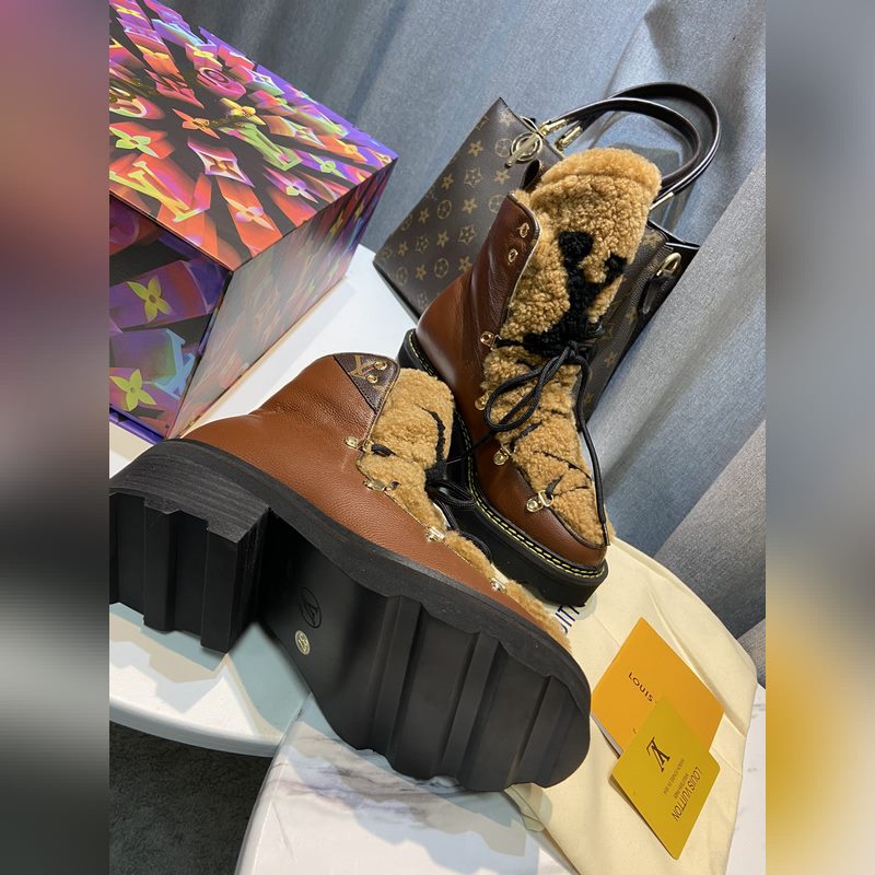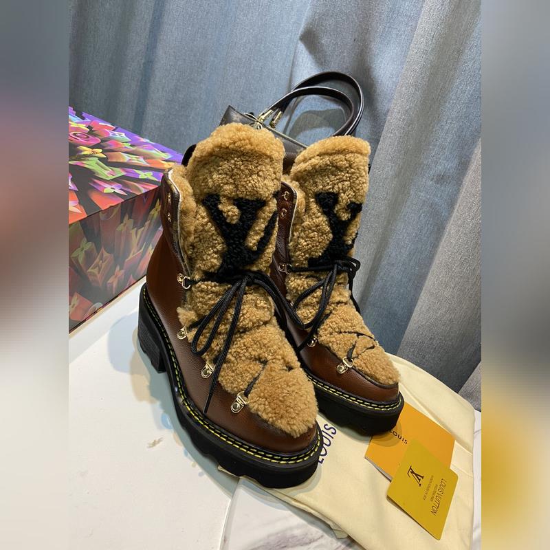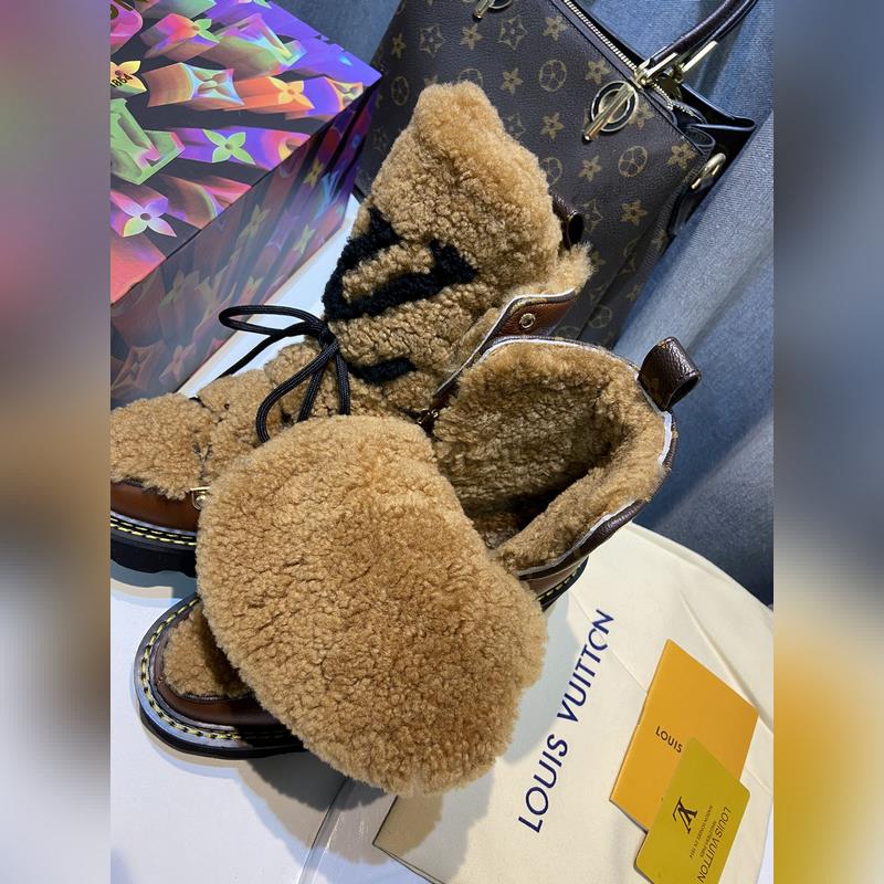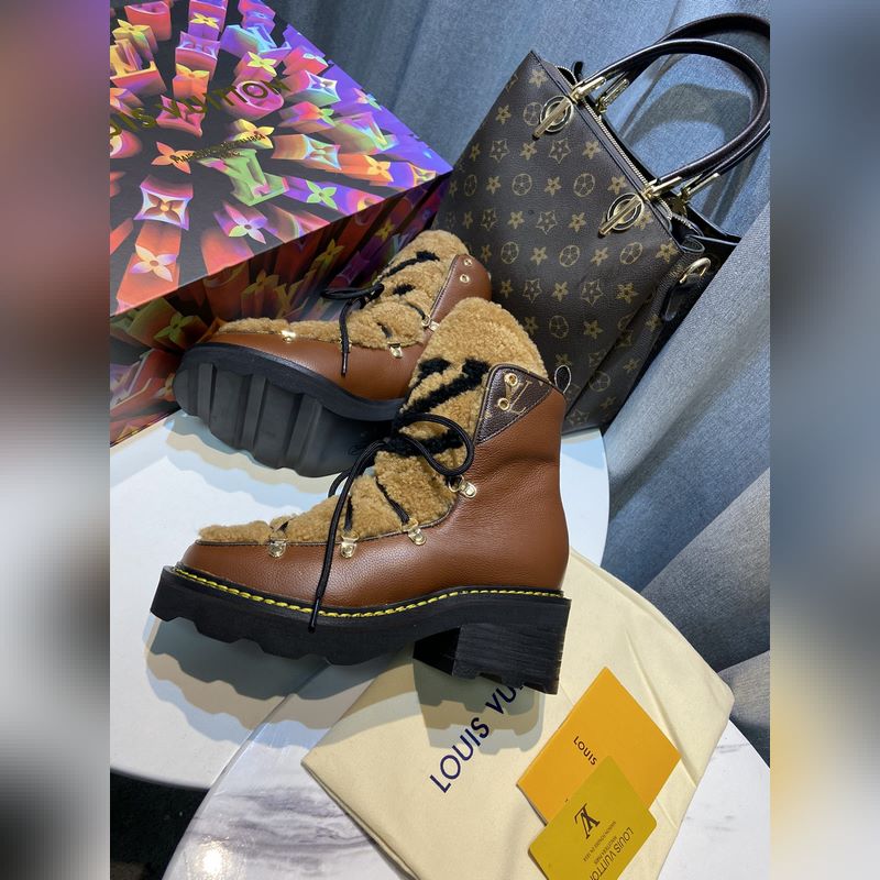 Viimeisimmät LV Beaubourg -nilkkurit talvelle on valmistettu rakeisesta vasikannahasta, villasta ja Monogrammi-kankaasta, jotka hahmottavat vaelluskenkien muotoa, ja niissä on lämmin lampaannahkainen vuori ja lampaannahkainen kieli, joka on koristeltu suurilla LV-kirjaimilla, mikä tekee niistä monipuolisen lämpimän esineen. Vedenpitävä alusta lisää taitavasti kevyen paksun pohjan korkeutta. 35-41