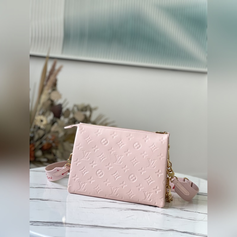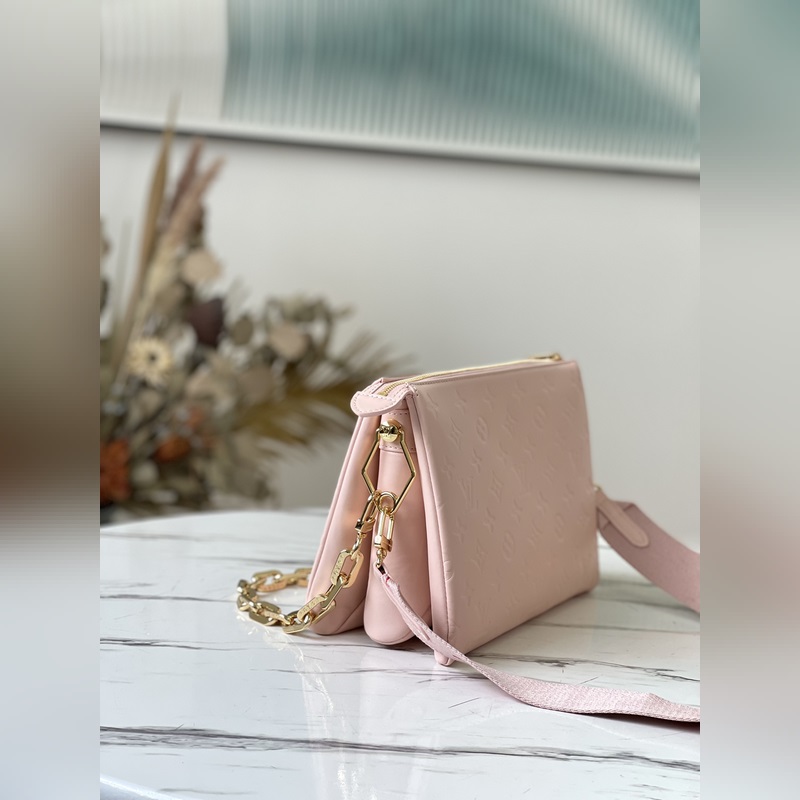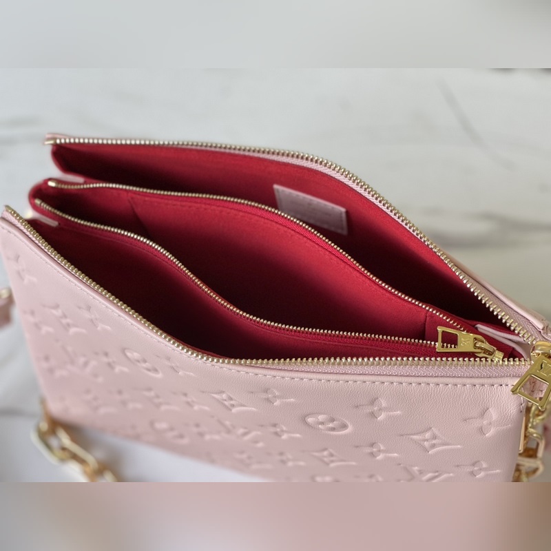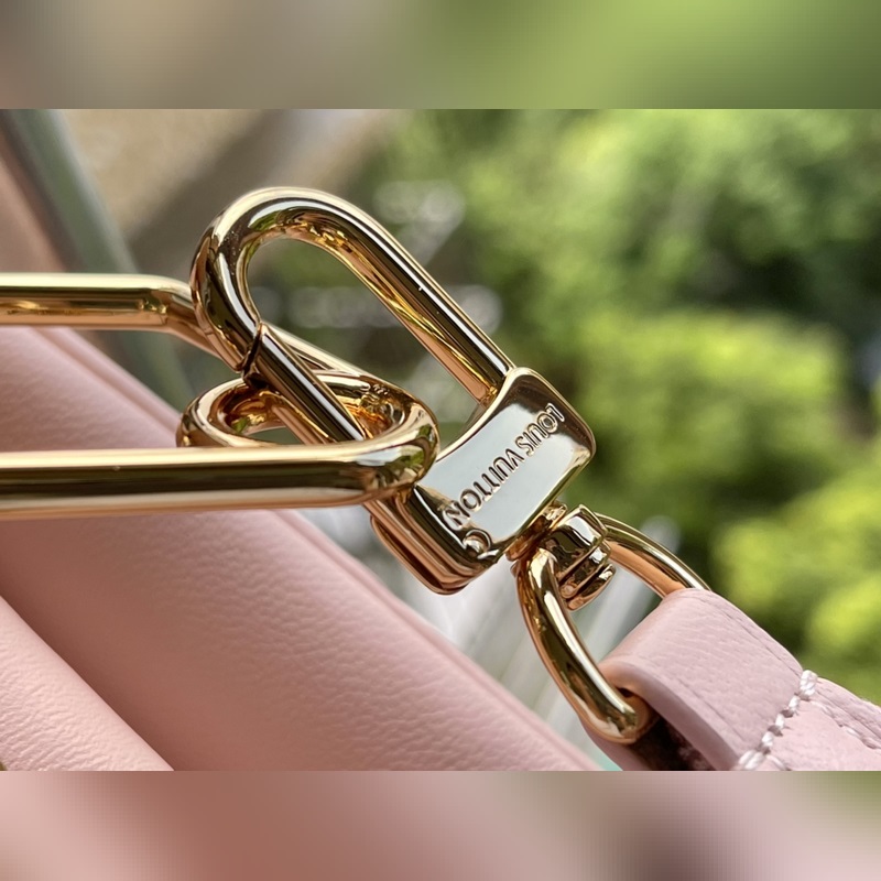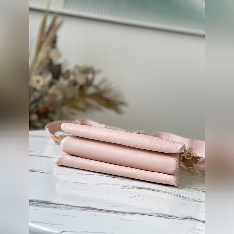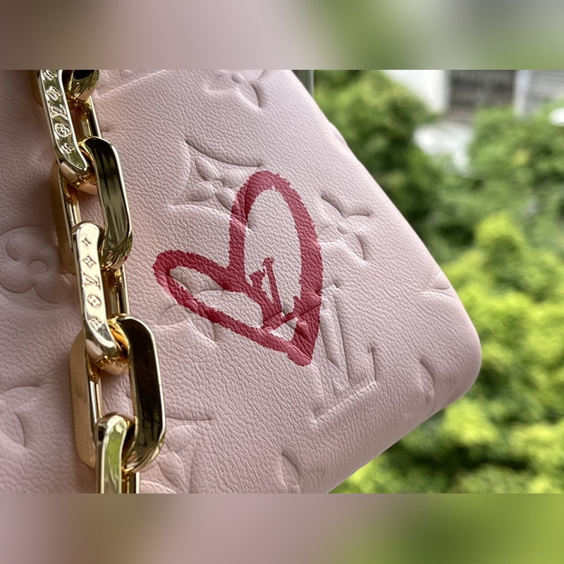Fall In Love -kapselikokoelmasta, jonka on suunnitellut Nicolas Ghesquière. Monogram kohokuvioidun pörröisen lampaannahan helmiäisväri on kuin kontuuripuuteri, ja sydänkuvio näyttää huulipunalla piirretyltä. Irrotettava paksu ketju ja kangasolkahihna mahdollistavat kantamisen olkapäällä tai ristissä. Mitat: 26 x 20 x 12 cm