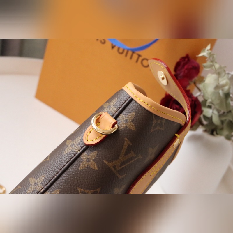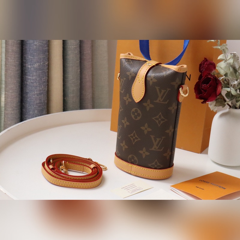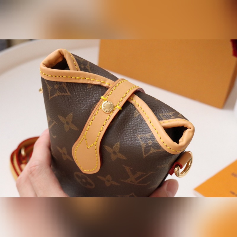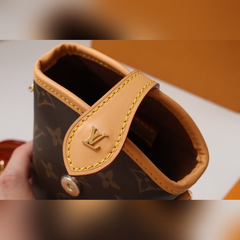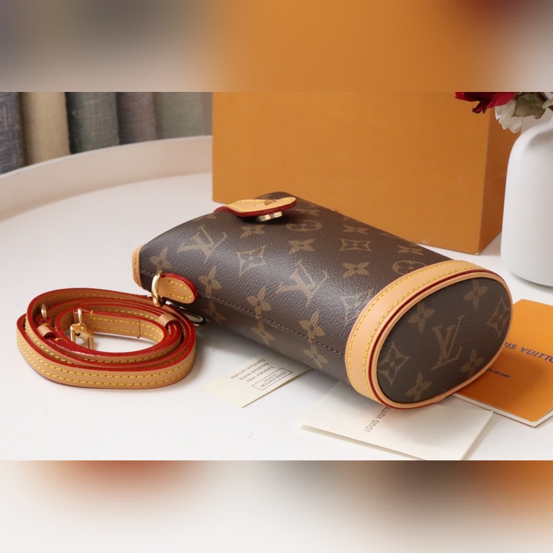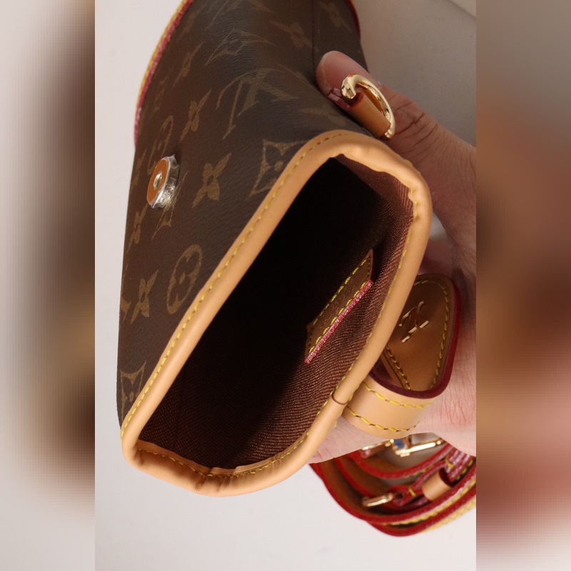 Valmistettu monogrammista kankaasta ja lehmännahasta, suorakaiteen muotoinen runko on yhdistetty taitavasti soikeaan pohjaan, ja taittuva magneettilukko täydentää hienon rakenteen. Siihen mahtuu päivittäiset tarpeet, ja siinä yhdistyvät retro viehätys ja käytännölliset toiminnot. Irrotettava ja säädettävä olkahihna mahdollistaa monenlaiset kantotavat. Mitat: 14,5 x 18 x 6,5 cm
