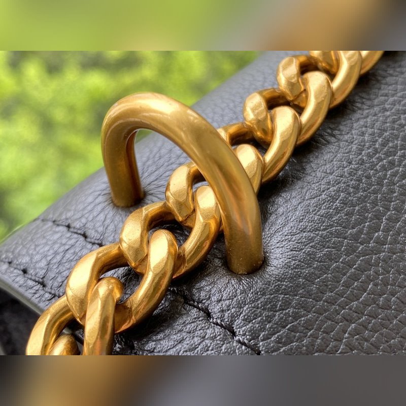 Valmistettu rakeisesta vasikannahasta, ikoninen kääntösolki on muunnettu trendikkääksi viistetyksi malliksi. Etu- ja takataskuihin on helppo päästä käsiksi, ja liukuva ketjun olkahihna, jossa on pitkät nahkaiset olkatyynyt, mahdollistaa mukavan kantamisen olkapäällä tai poikki.