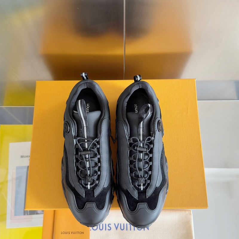 Alkuperäisen oston kehitys ja tuotanto Tämä LV Rush -urheilujalkine sisältää metallielementtejä teknologiaruudukossa korostaen urheilullista estetiikkaa ja inspiraatiota maastourheilujalkineista. Joustavat nauhat ja metalliset lassosoljet on helppo pukea ja riisua, ja kuminen Monogrammi-kuvio ja LV Circle -logo sijaitsevat sivulla