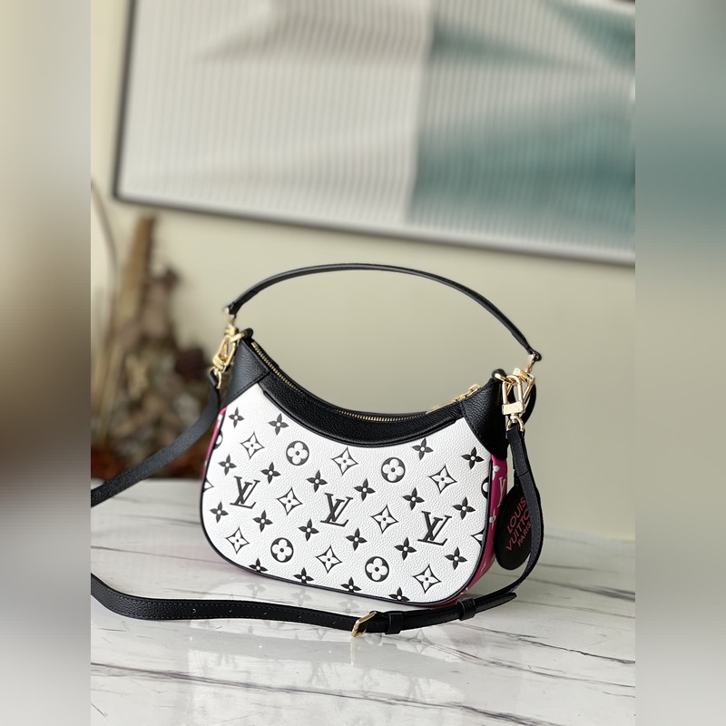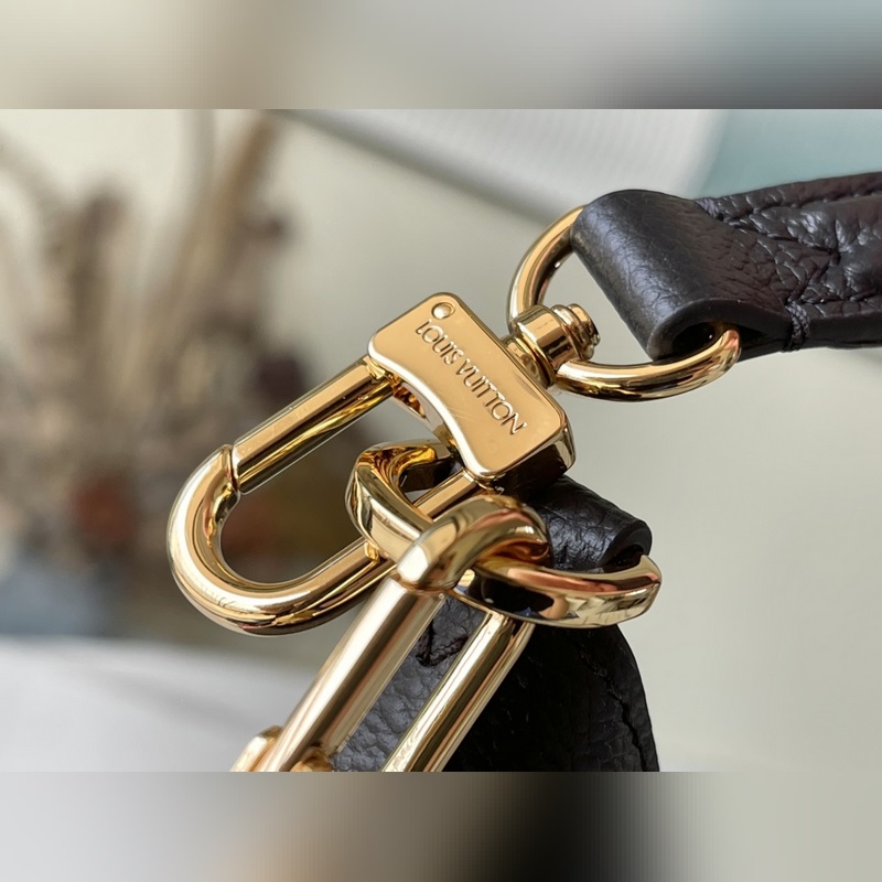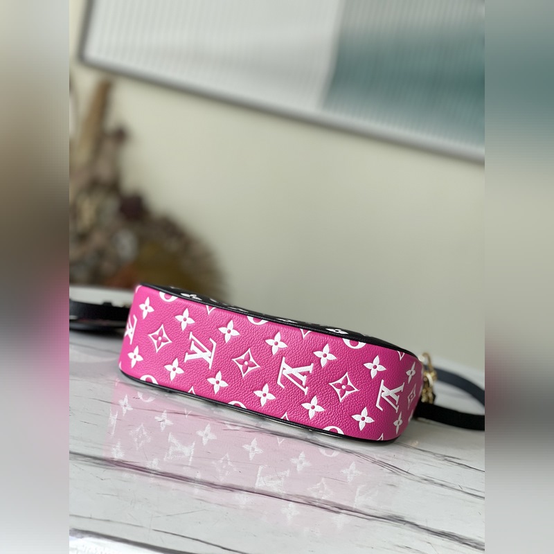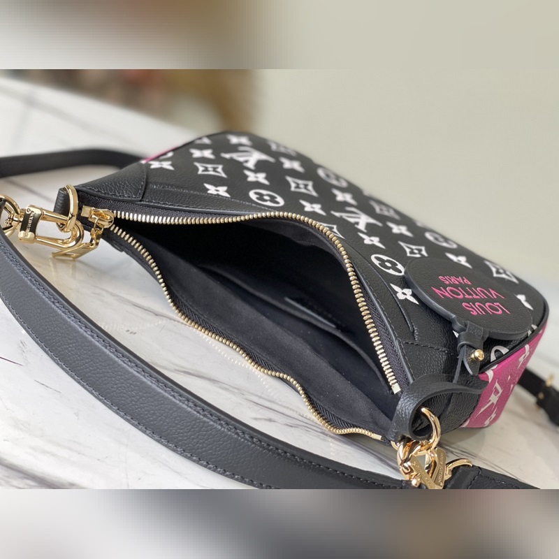 Kuvio on painettu ja kohokuvioitu nahkaan. Sitä voidaan kantaa patonkilaukkuna olkapäällä, kyynärpäästä tai poikkivartalosta irrotettavan olkahihnan avulla. Kannatpa sitä miten tahansa, voit helposti osallistua päivä- ja yötilaisuuksiin. Mitat: 22 x 14 x 9 cm