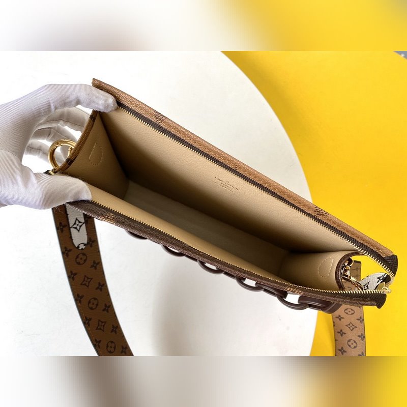 Sisätila on tilava ja molemmilla sivuilla on haaroitus, joka on kätevä tavaroiden ottamiseen ja laittamiseen. Se voidaan helposti laittaa käsilaukkuun. Monogrammikangaslaukku body-kulta messinkivetoketju, jossa nahkaläppäpestävä vuori, ja sivussa on haaroitus.