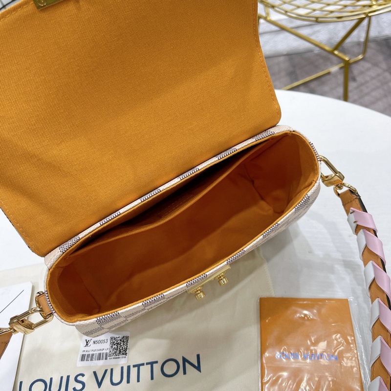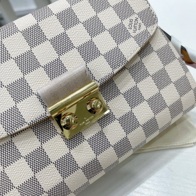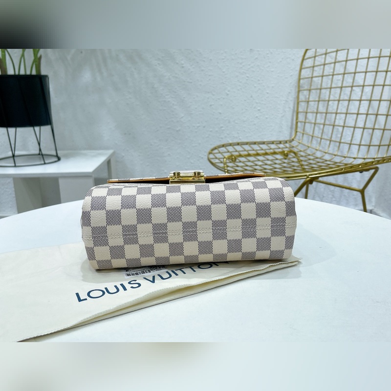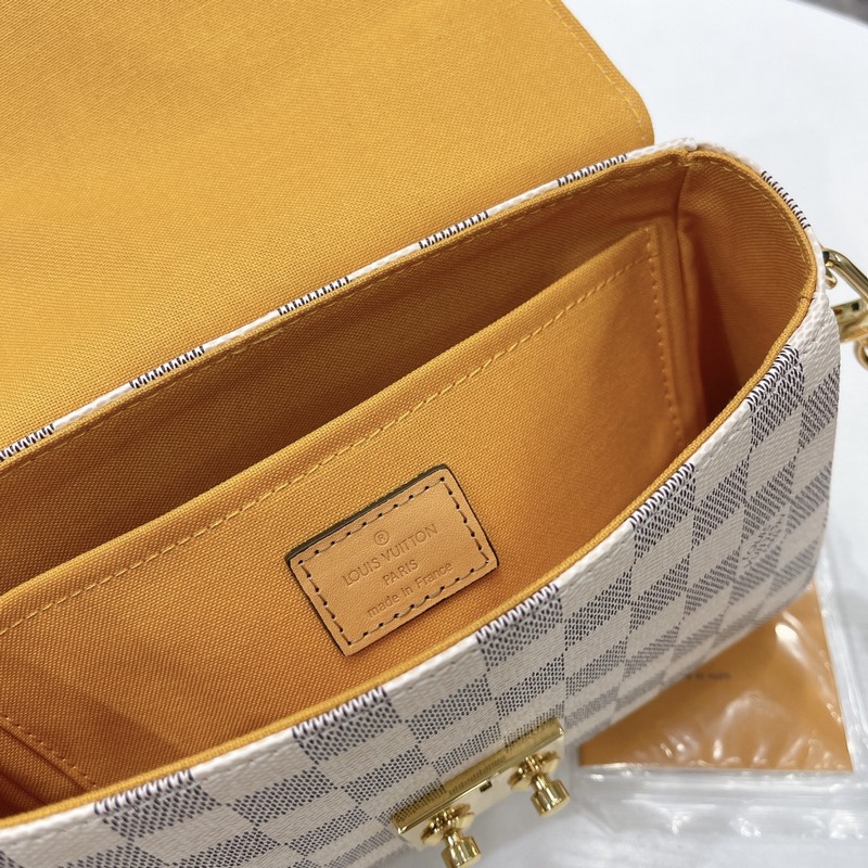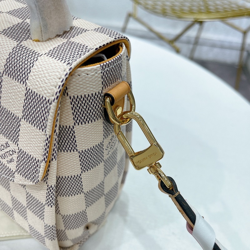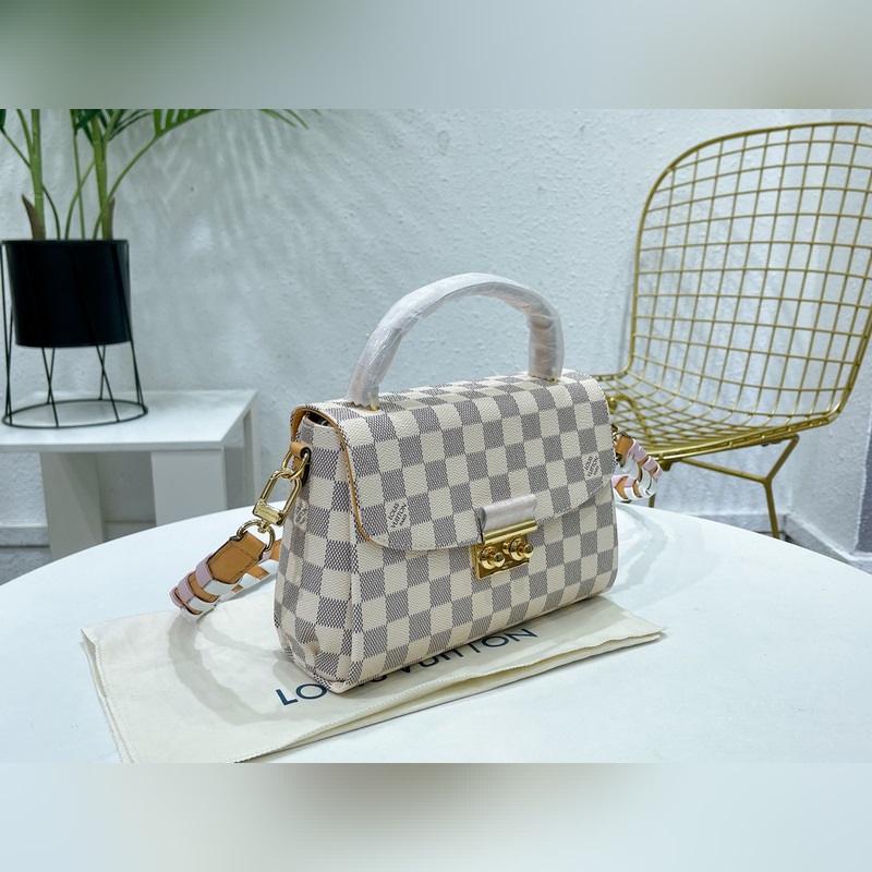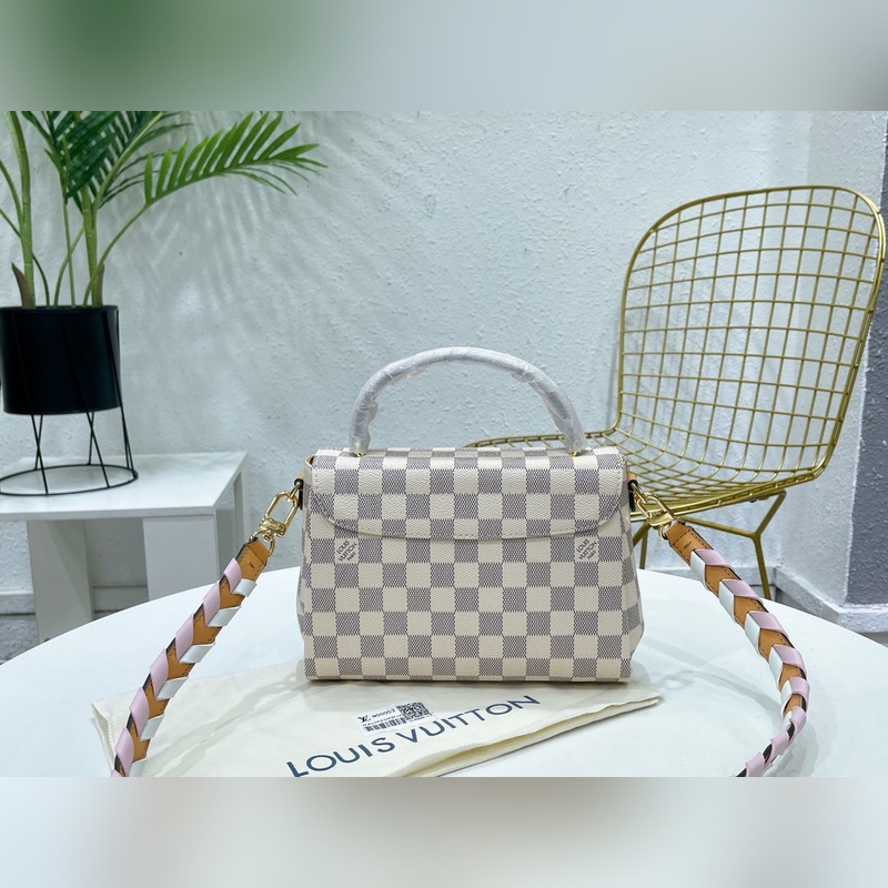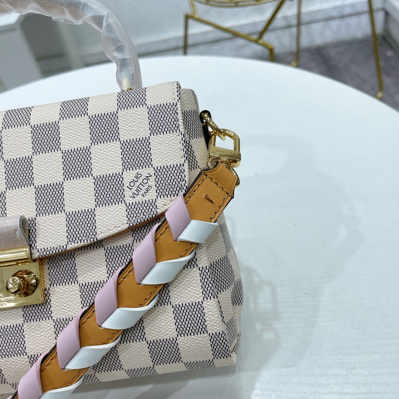 CROISETTE Pienikokoisessa ja nykyaikaisessa Damier Azur -kankaassa CROISETTEssa on kaksisävyinen käsinkudottu nahkahihna, joka luo värikkään kesäisen vaikutelman. Tämä tyylikäs kappale on tarpeeksi tilava kaiken päivittäisen tarvikkeen ja lompakon säilyttämiseen. Sitä voidaan kantaa kädessä, olkapäällä tai sivuttain. Yksityiskohtaiset ominaisuudet – 25 x 17 x 9,5 cm