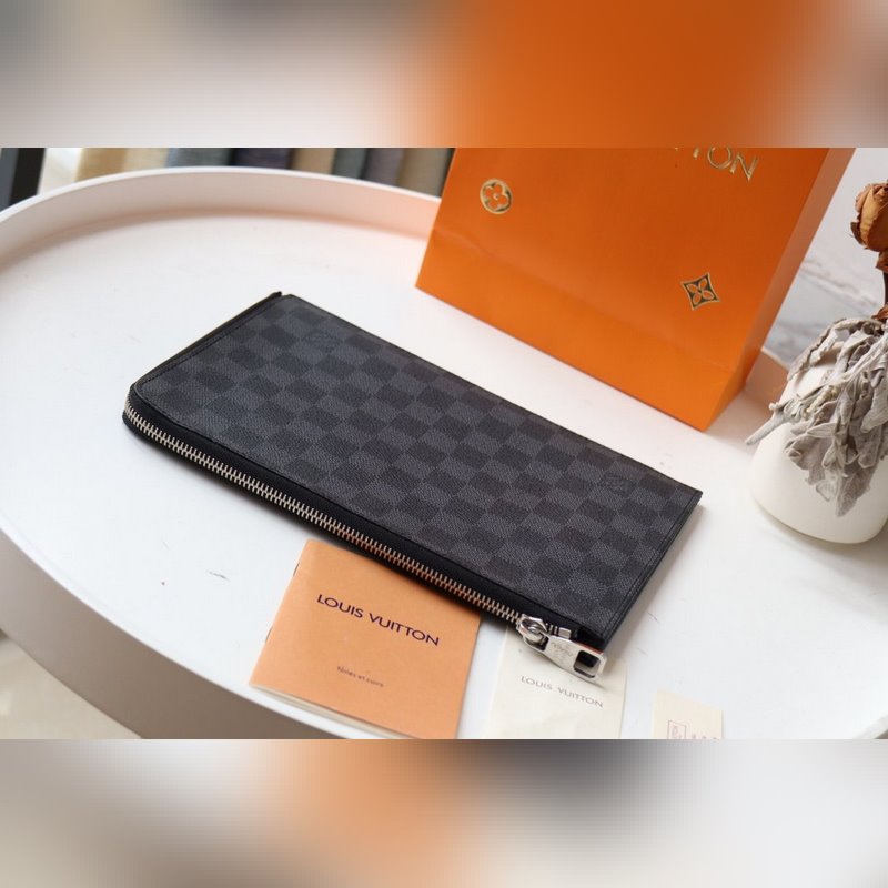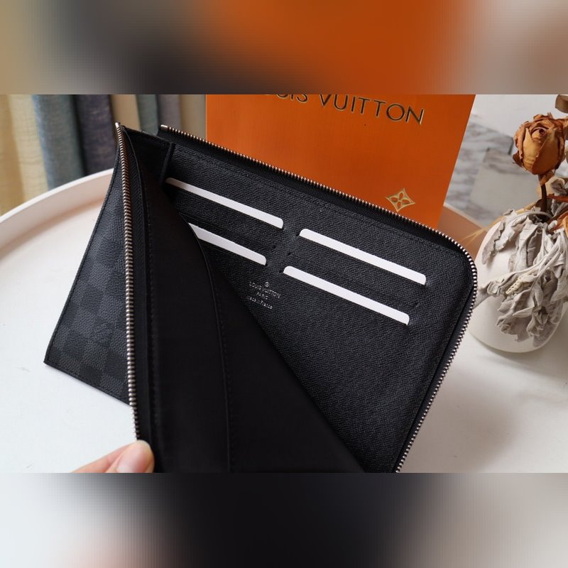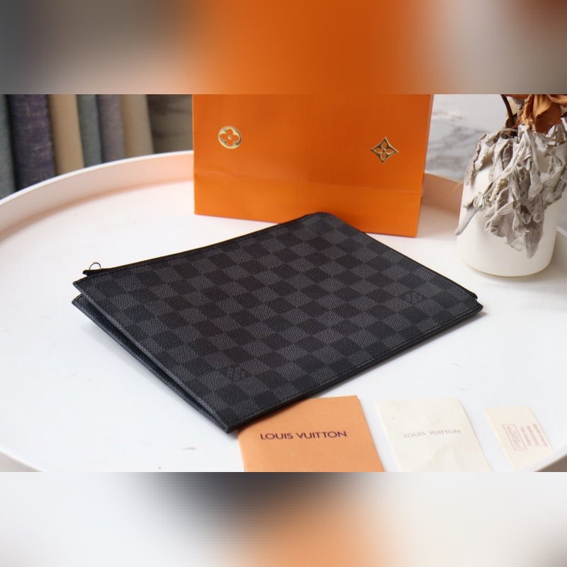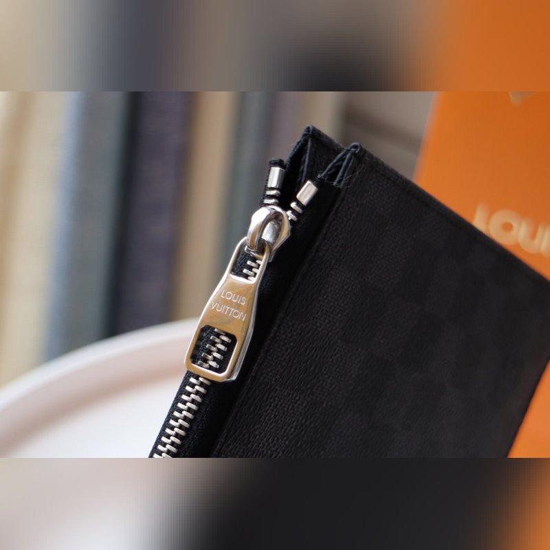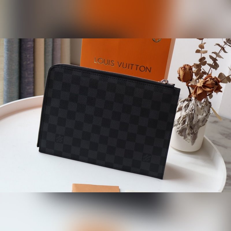 Louis Vuitton Pochette Jour laukku, joka on valmistettu Damier Graphite -kankaasta, on moderni ja avantgarde, jossa on tilava vetoketjuaukko ja sisäänrakennetut tukipaneelit, jotka lisäävät säilytyskapasiteettia. Sitä voidaan pitää käsissä tai säilyttää suuremmassa pussissa.