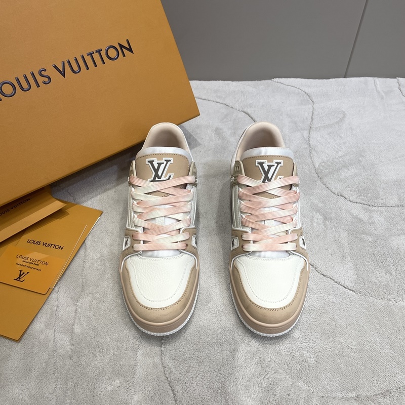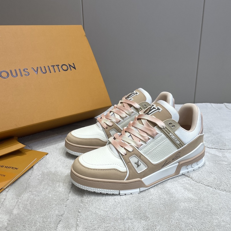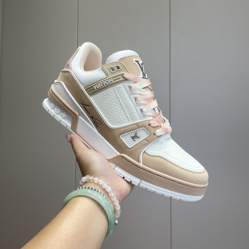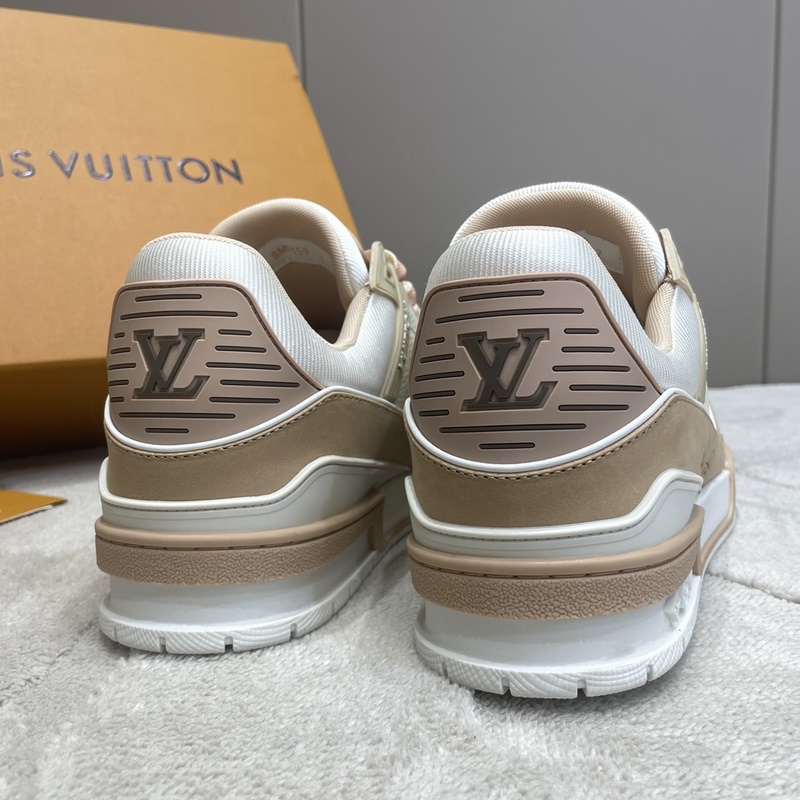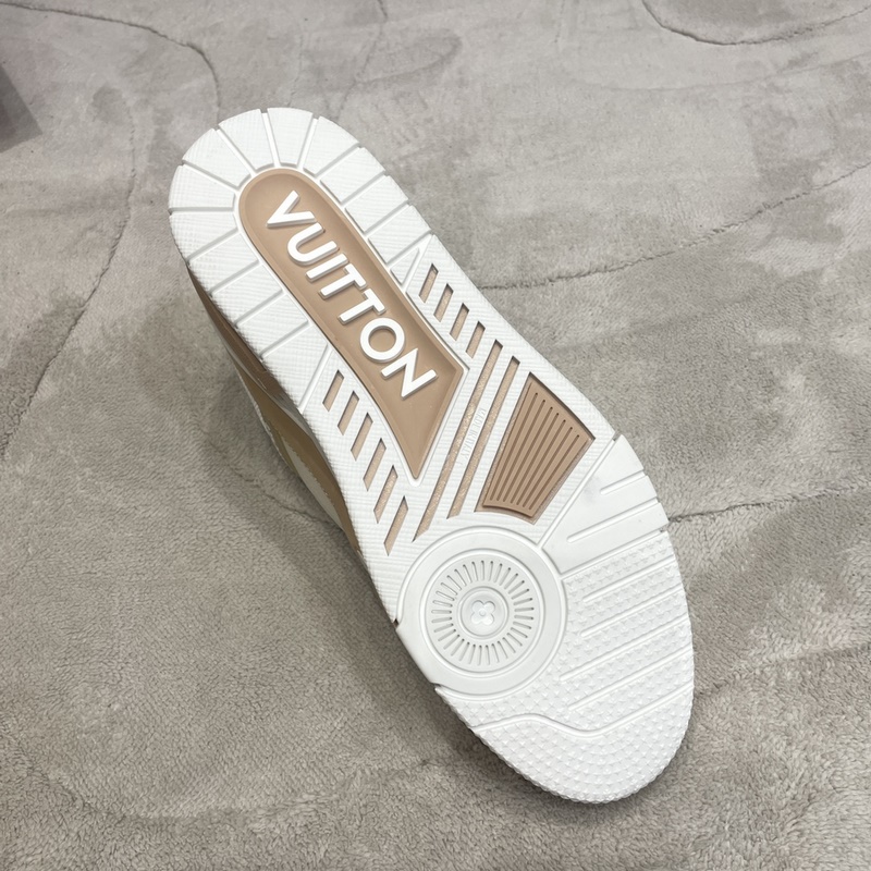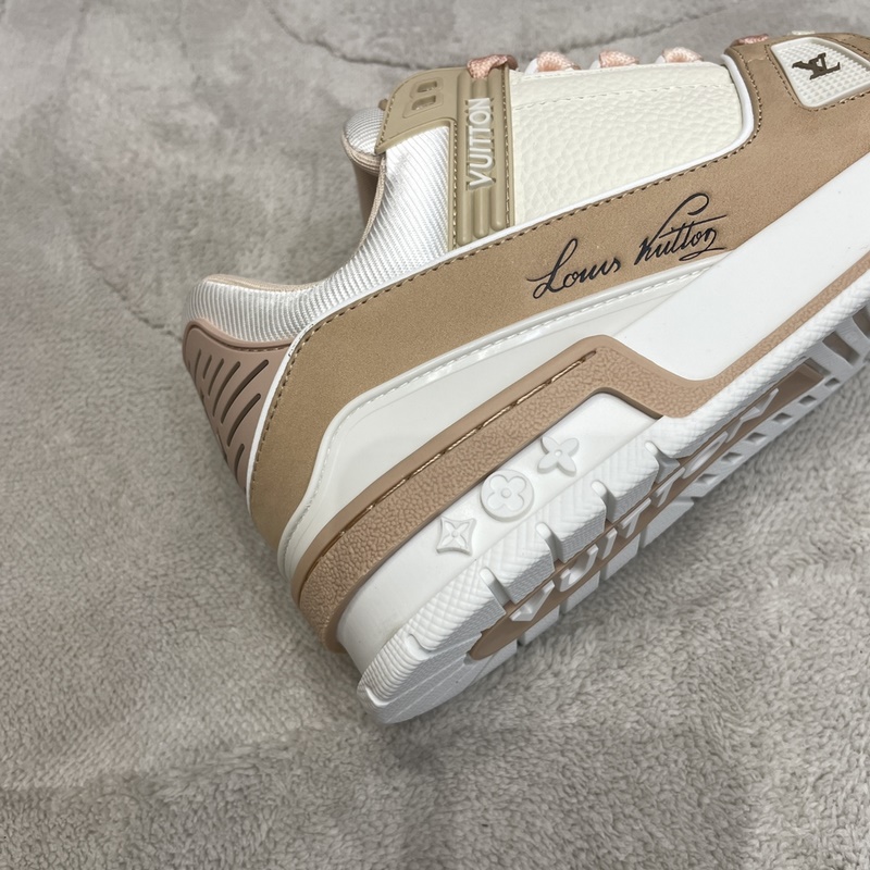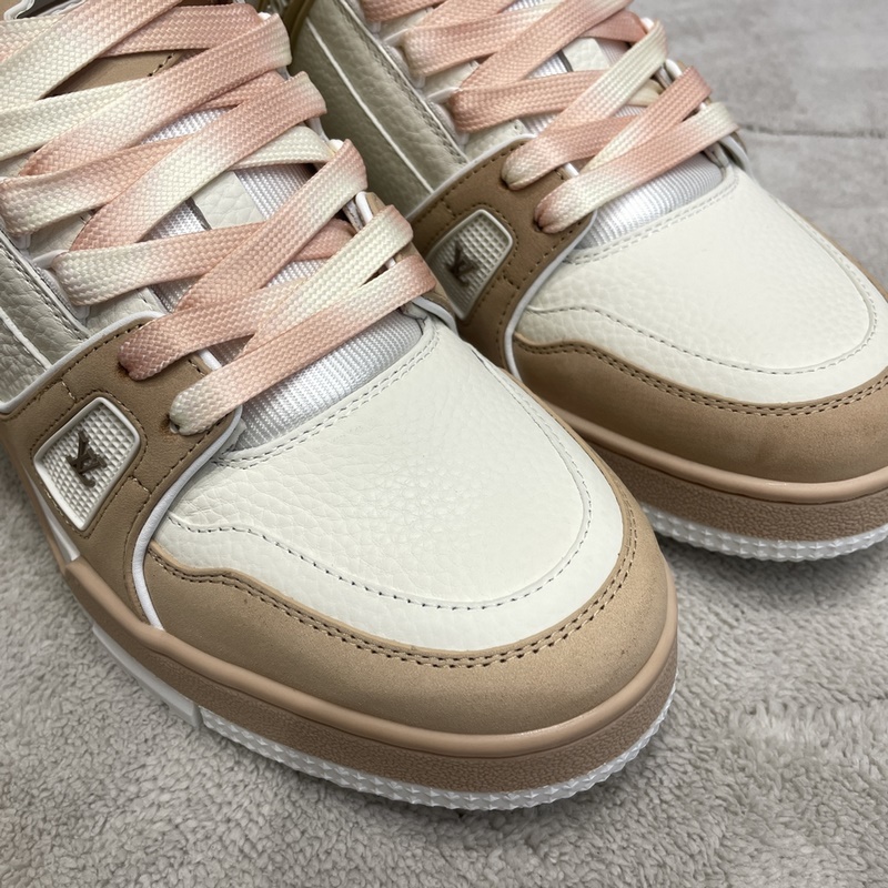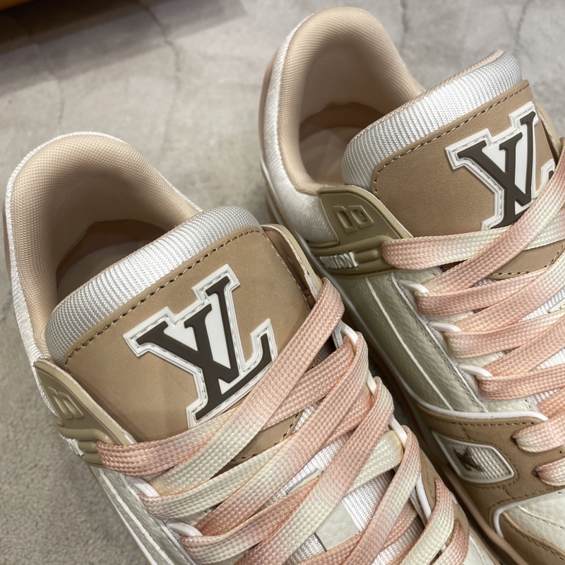 LV Trainer -lenkkarit yhdistävät nubukkia ja karkeaa lehmännahkaa jatkaen Virgil Ablohin retrokoripallokenkien tutkimusta. Kumielementit ja gradienttinauhat korostavat käsityön yksityiskohtia, ja sivussa on käsinkirjoitettu Louis Vuitton -logo.