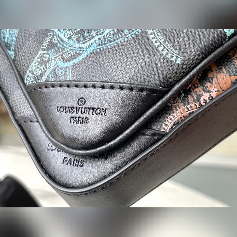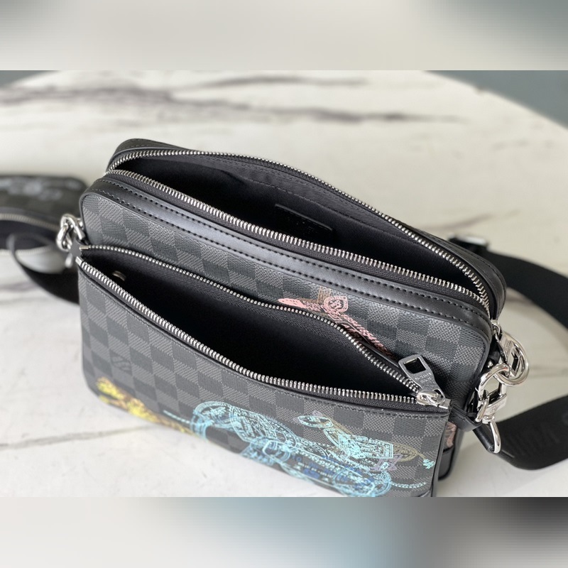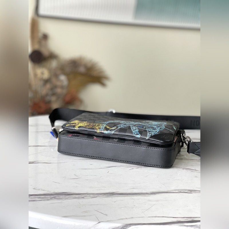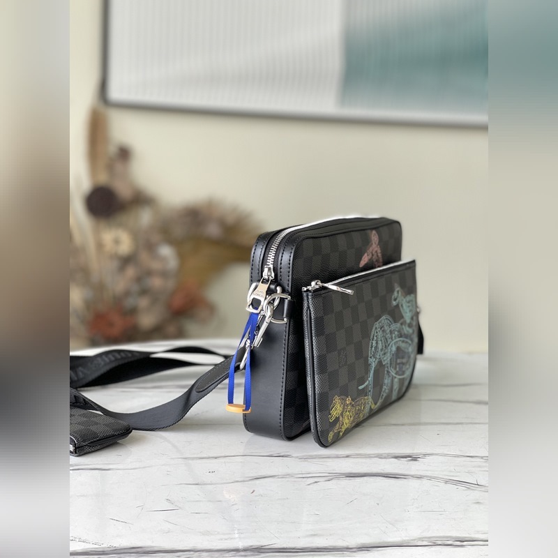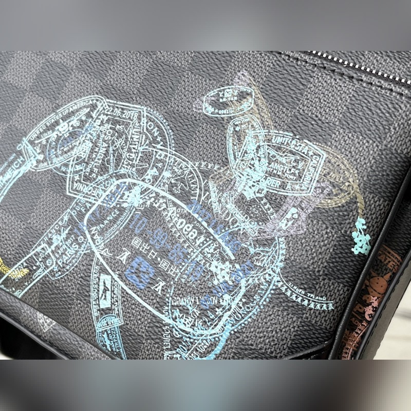Kankaan pinnalla on kuvattu joukko villieläimiä, ja lähempi tarkastelu paljastaa, että se koostuu kuvioista, jotka näyttävät passileimoilta. Vetoketjullinen päälokero, irrotettava pieni kytkin ja säädettävään olkahihnaan kiinnitetty kolikkolaukku täydentävät kolme yhdessä -toiminnon. Mitat: 25 x 18,5 x 7 cm