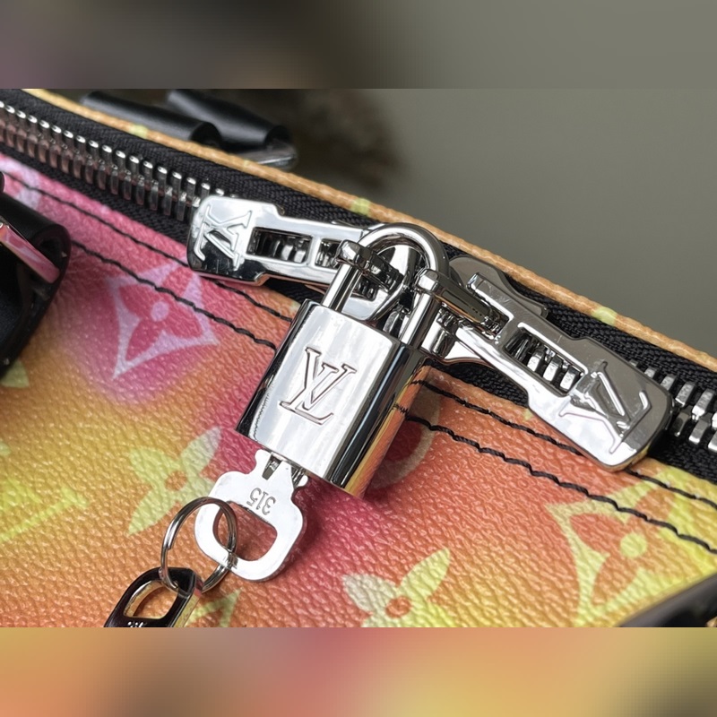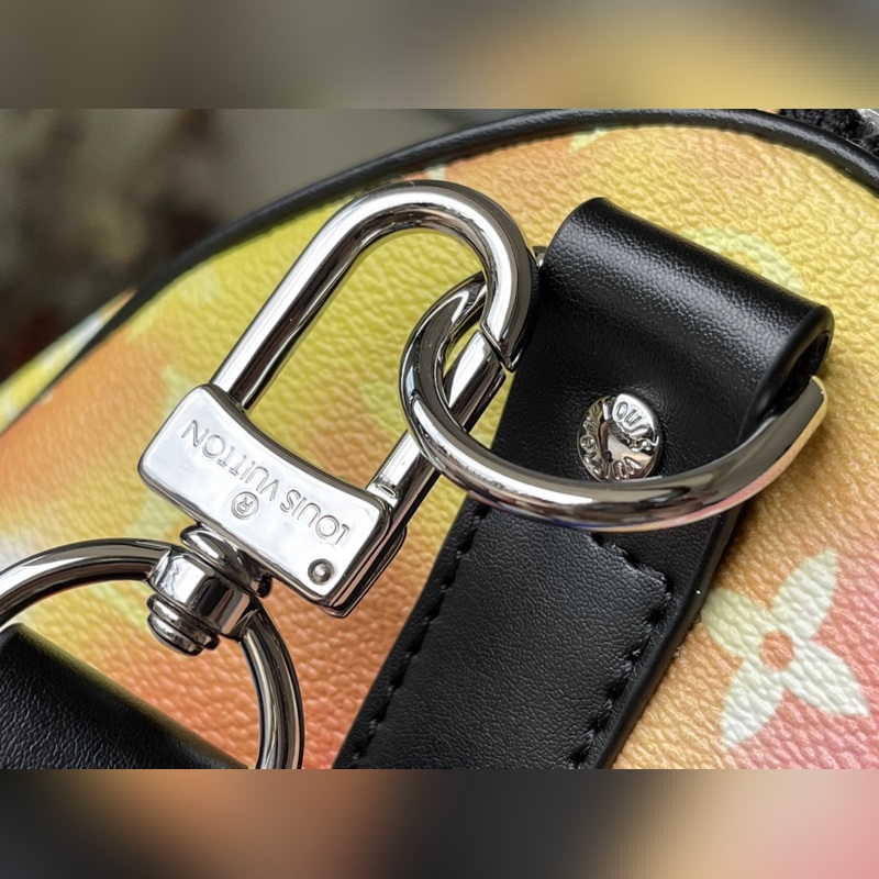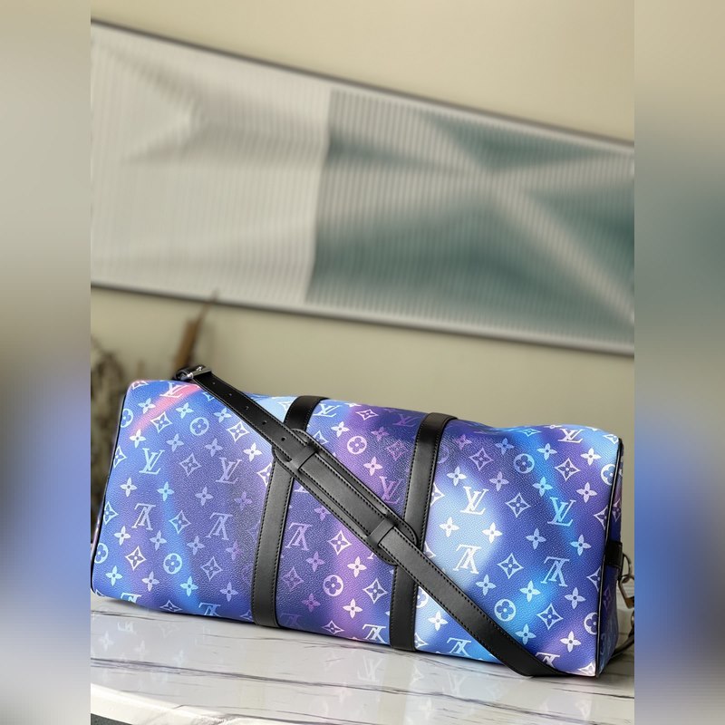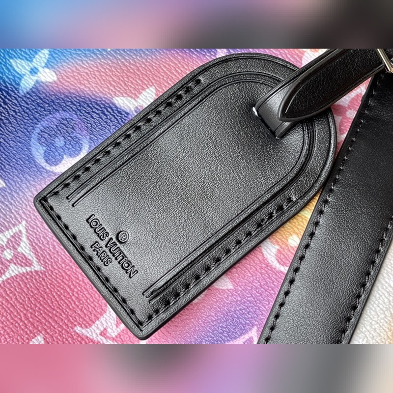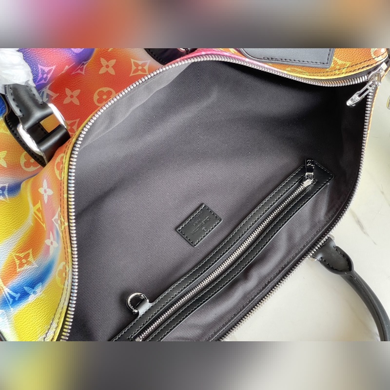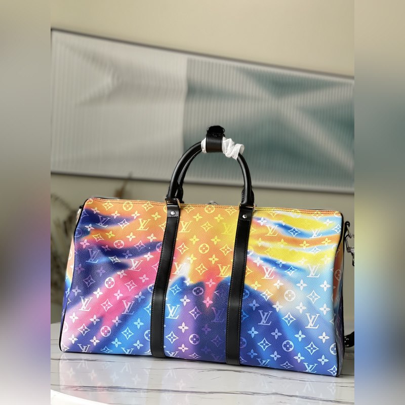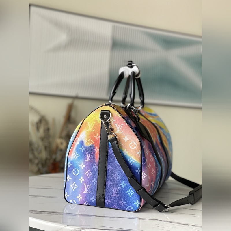 Tämä Keepall 50 BANDOULIèRE pehmeä matkalaukku käyttää vaaleaa akvarellia kuvaamaan Monogram-kuviota päällystetyllä kankaan pinnalla ja haaveilee Virgil Ablohin sateenkaarifantasiasta. Käsimatkatavaran koko piilottaa runsaasti tilaa, joten se on ihanteellinen kumppani viikonloppumatkoille. Mitat: 50 x 29 x 23 cm