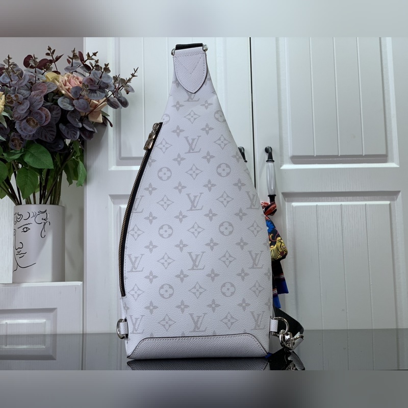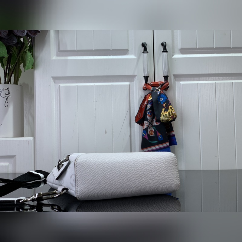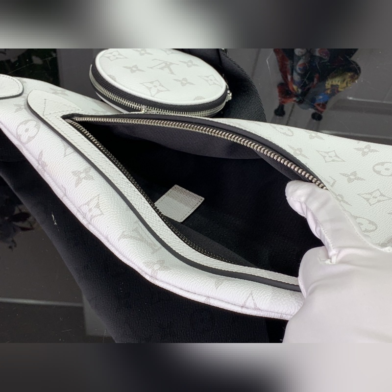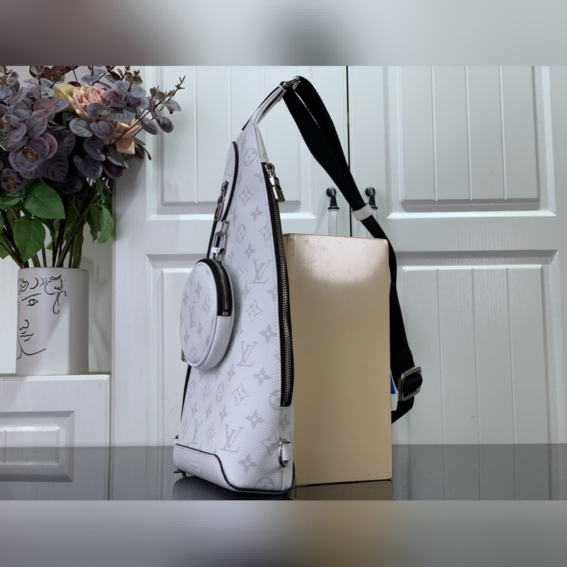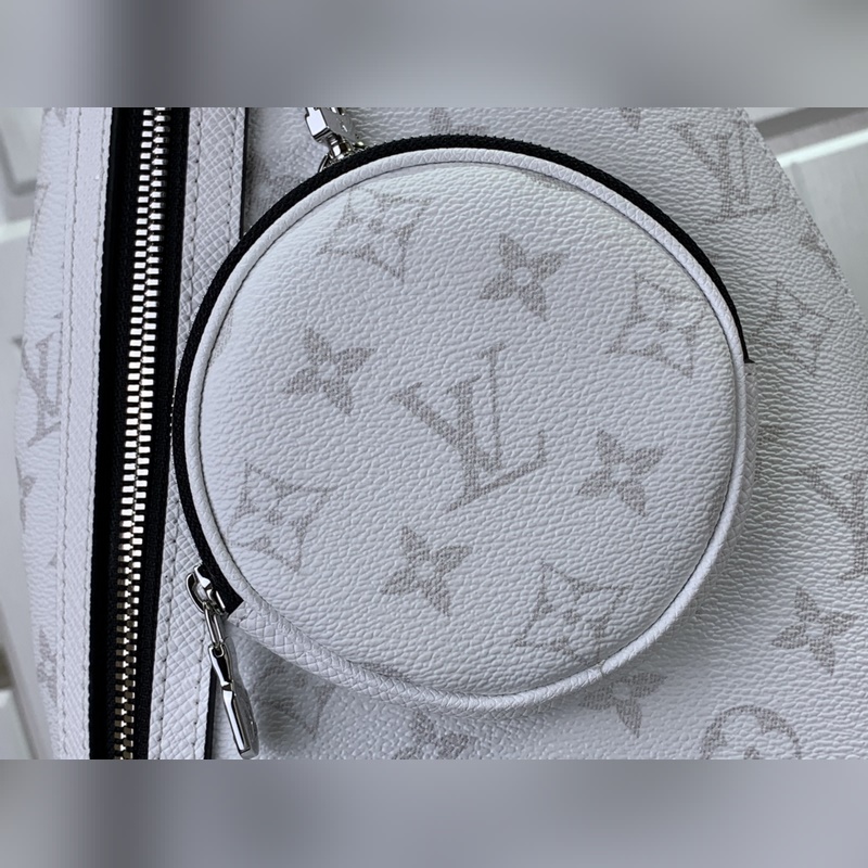 Duo-olkalaukku, jossa on yhdistetty Monogrammi-kanvas ja Ta ga lehmännaha, irrotettava vetoketjullinen laukku ja vetoketjulliset sivutaskut vaihdon tai muiden tarpeiden säilyttämiseen, tulkitsee erilaisten trendien käsitettä rennossa tyylissä, tarjoten vaihtoehdon perinteisille reppuille.