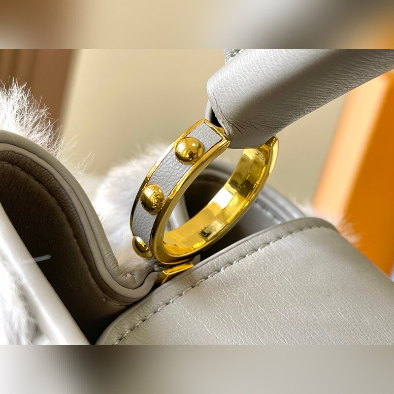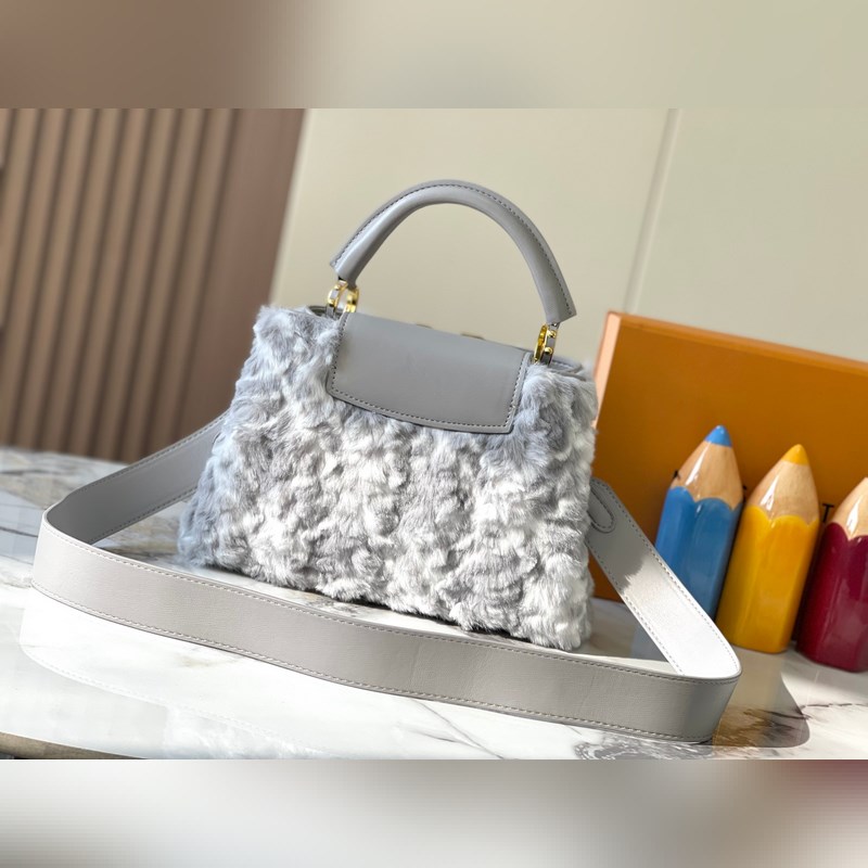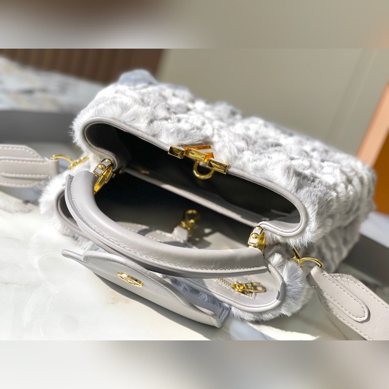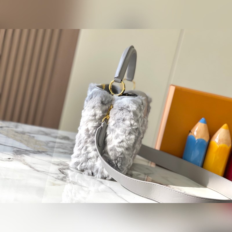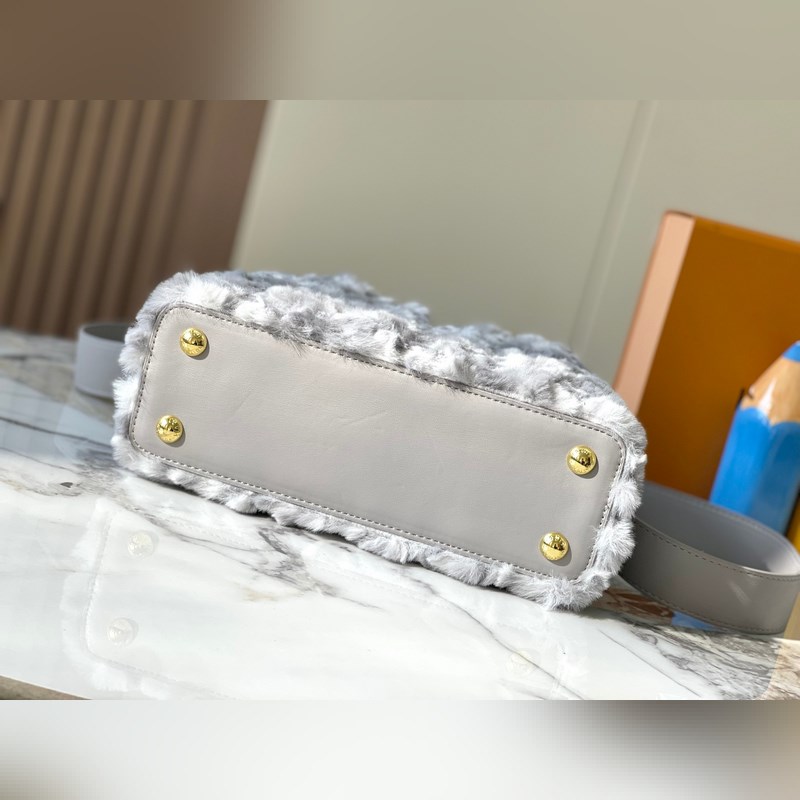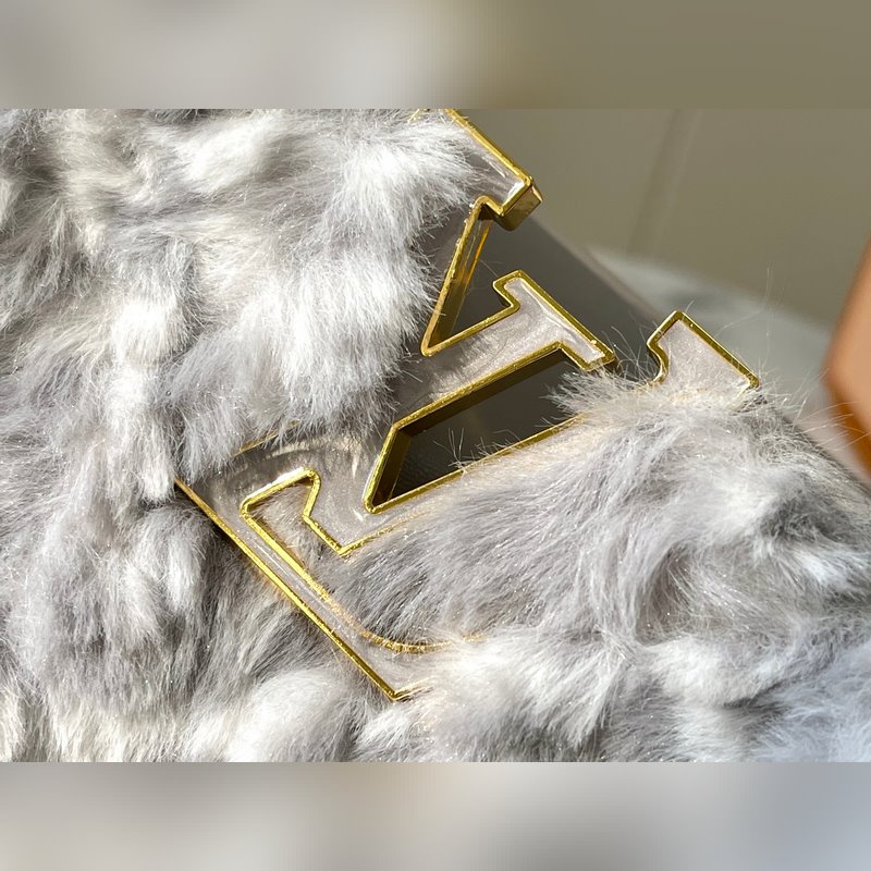 M22668 Grey Large Vuoden 2024 uudesta mallista Tässä mallissa on käytetty ylellisiä minkki Caucinesia antamaan syvälle samettikankaalle Monogrammi silmiinpistävää hehkua Mukana punottu olkahihna helpottaa käyttöä olkapäällä tai poikkivartalossa Lisää huomiota herättäviä kohokohtia upeaan iltaasuusi