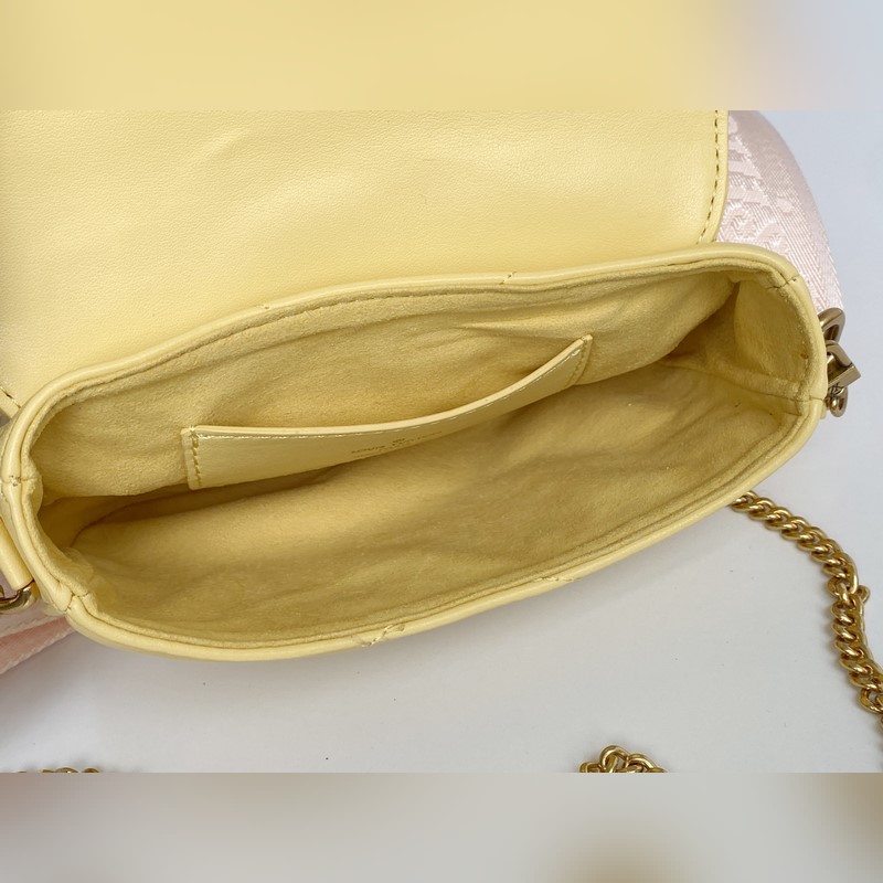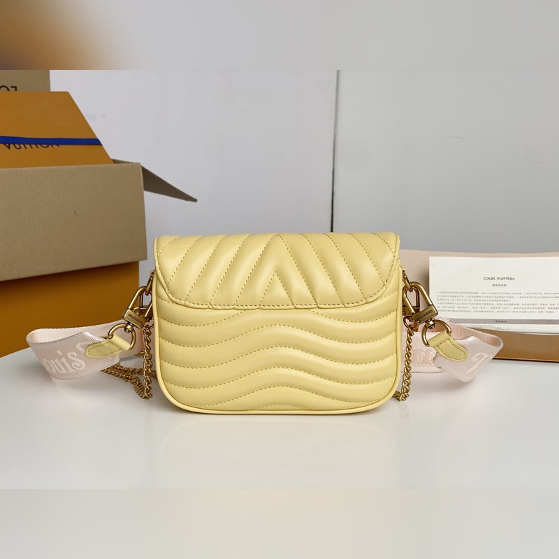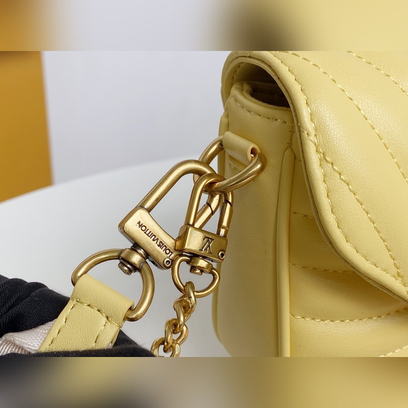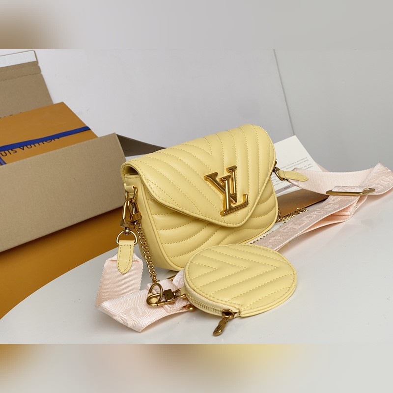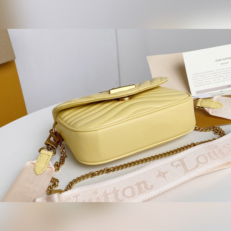 M56466 M56471 M56461 M56468 Vaaleanpunainen 57942 Keltainen, 57864 Purppura Tämä monipuolinen New Wave Multi-Pochette crossbody -laukku on valmistettu tikatusta vasikannahasta. Sen leveä olkahihna on koristeltu kirjailtuilla Louis Vuitton -englanninkielisillä sanoilla, ja yhteensopiva kultaketju mahdollistaa laukun pitämisen tai kantamisen olkapäällä. Pyöreä kolikkolaukku voidaan kiinnittää hihnan jousisolkeen. Kaikki nämä asusteet ovat irrotettavia, joten tämä muodikas asuste on todella monipuolinen. Koko: 19-14-5