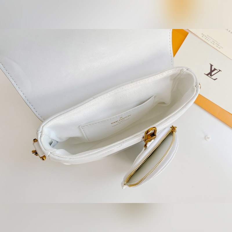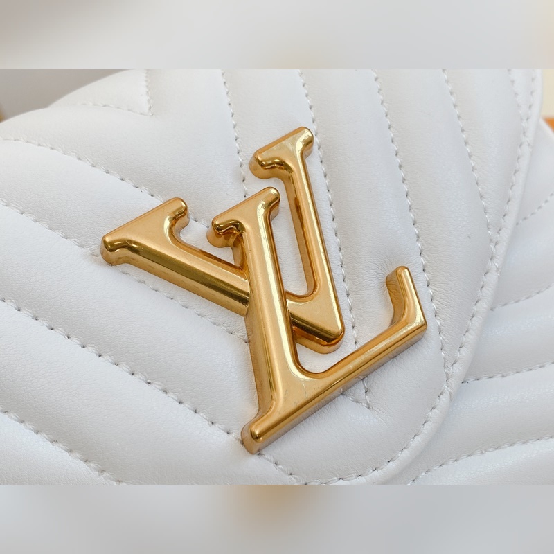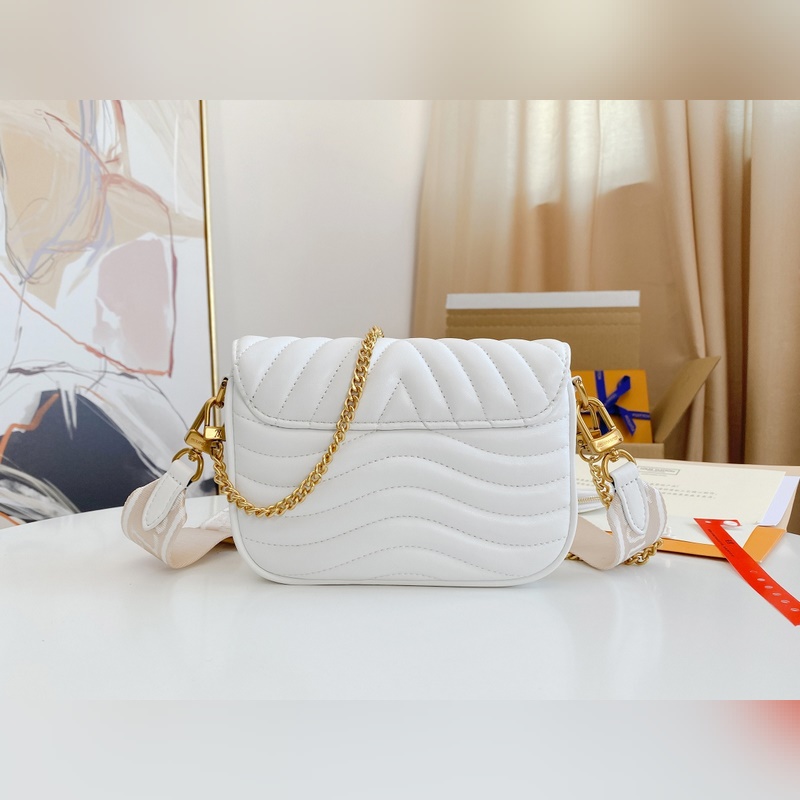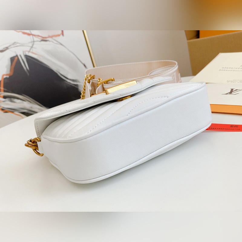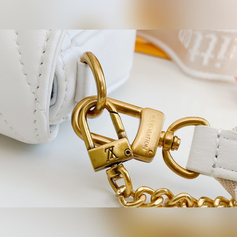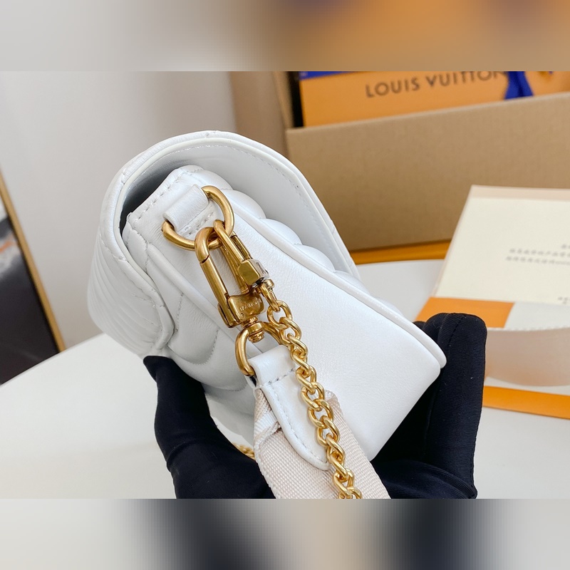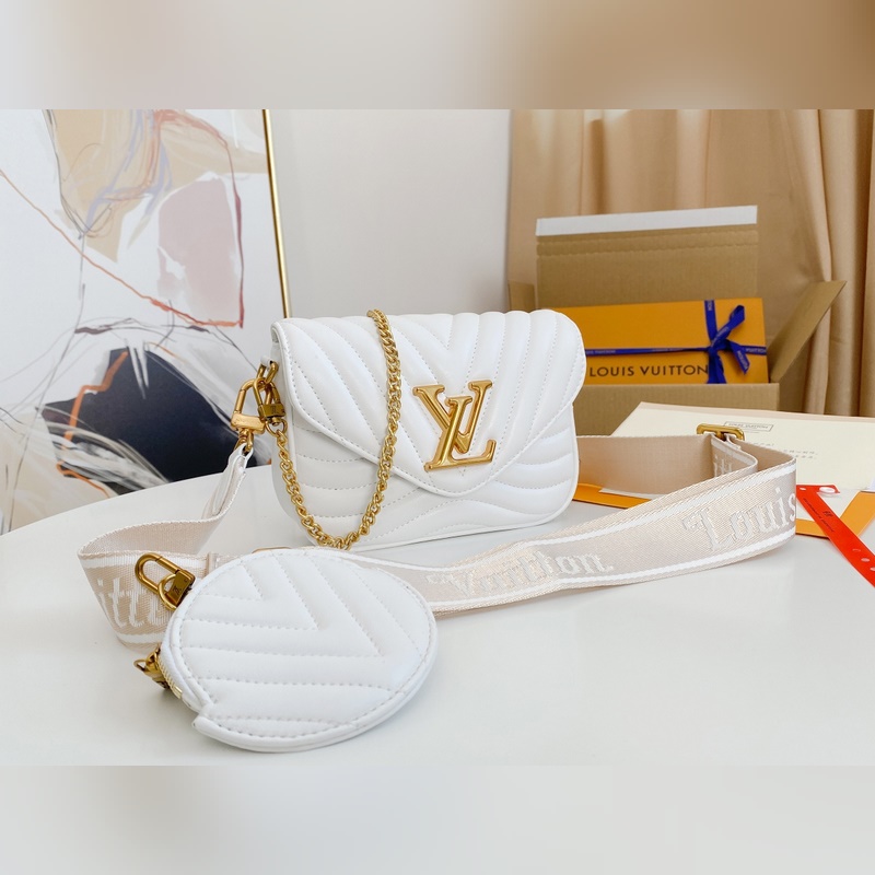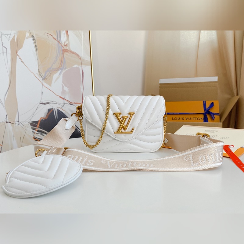 M56466 M56471 M56461 Monipuolinen New Wave Multi-Pochette crossbody -laukku on valmistettu tikatusta vasikannahasta. Sen leveässä hihnassa on kirjailtu Louis Vuittonin englanninkielisellä nimellä, ja siinä on kultaketju, jonka avulla laukkua voi kantaa käsissä tai olkapäällä. Pyöreä kolikkolaukku kiinnittyy hihnan jousisolkeen. Nämä asusteet ovat irrotettavia, joten tämä muodikas asuste on todella monipuolinen kappale. Koko: 19-14-5