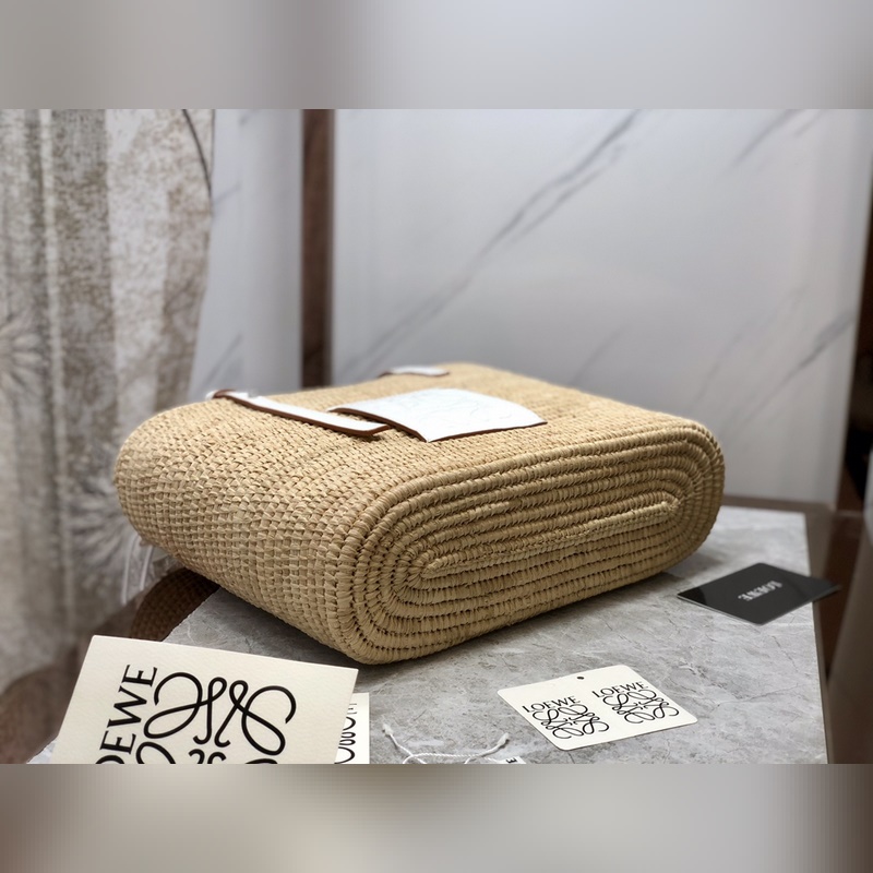 Uusi alkuperäisestä Lowe-nahasta valmistettu kompakti neliön muotoinen korilaukku, joka on valmistettu raffiasta ja vasikannahasta.