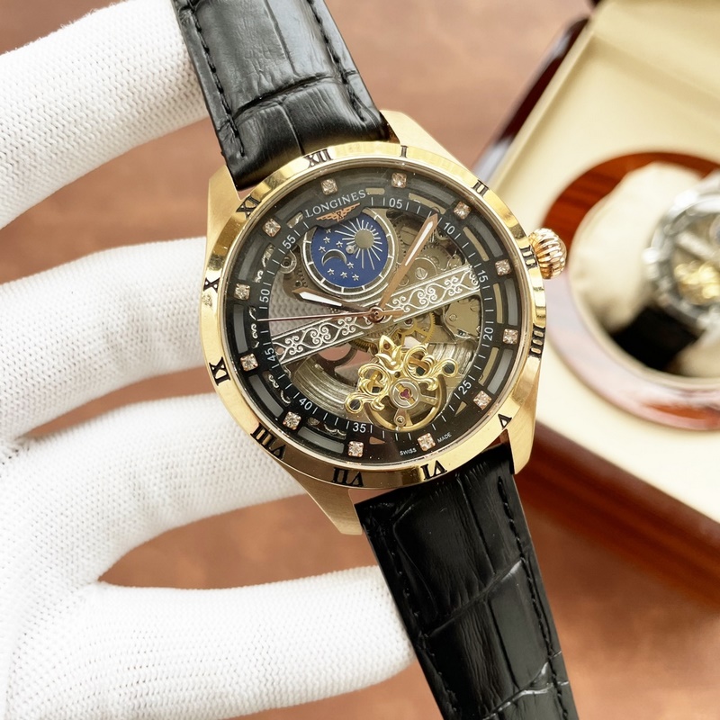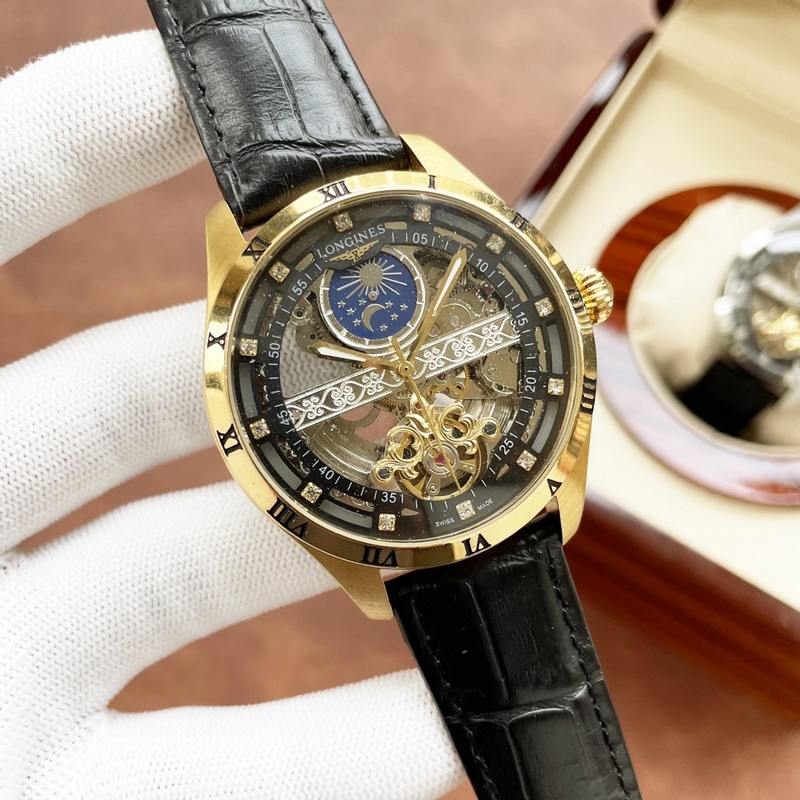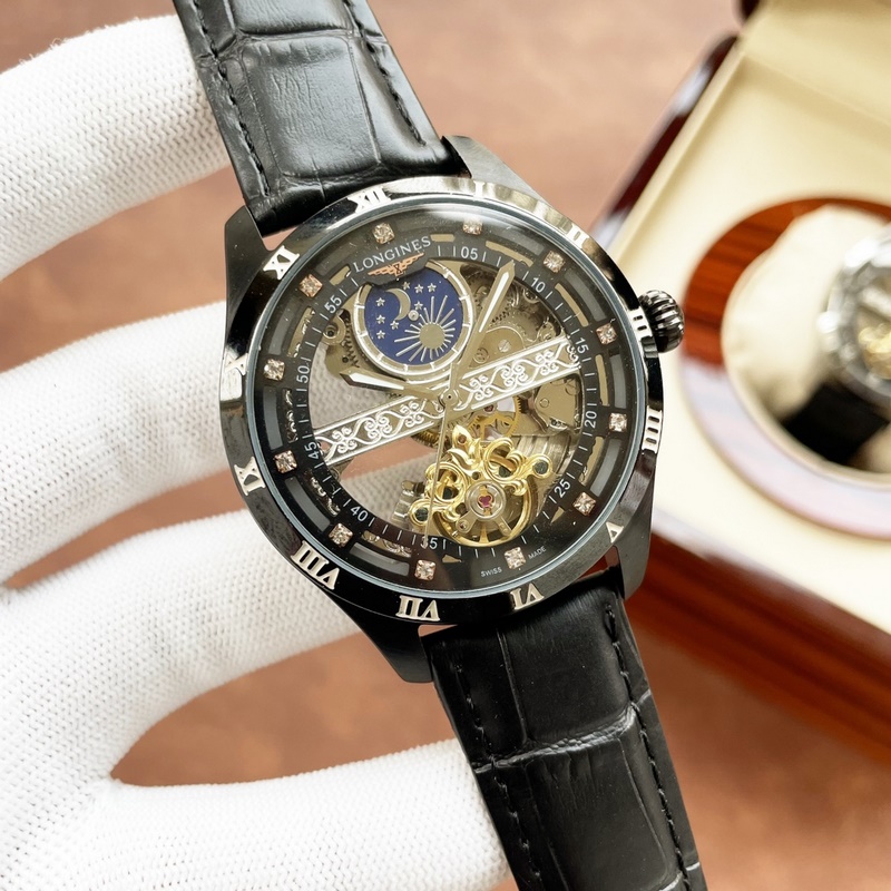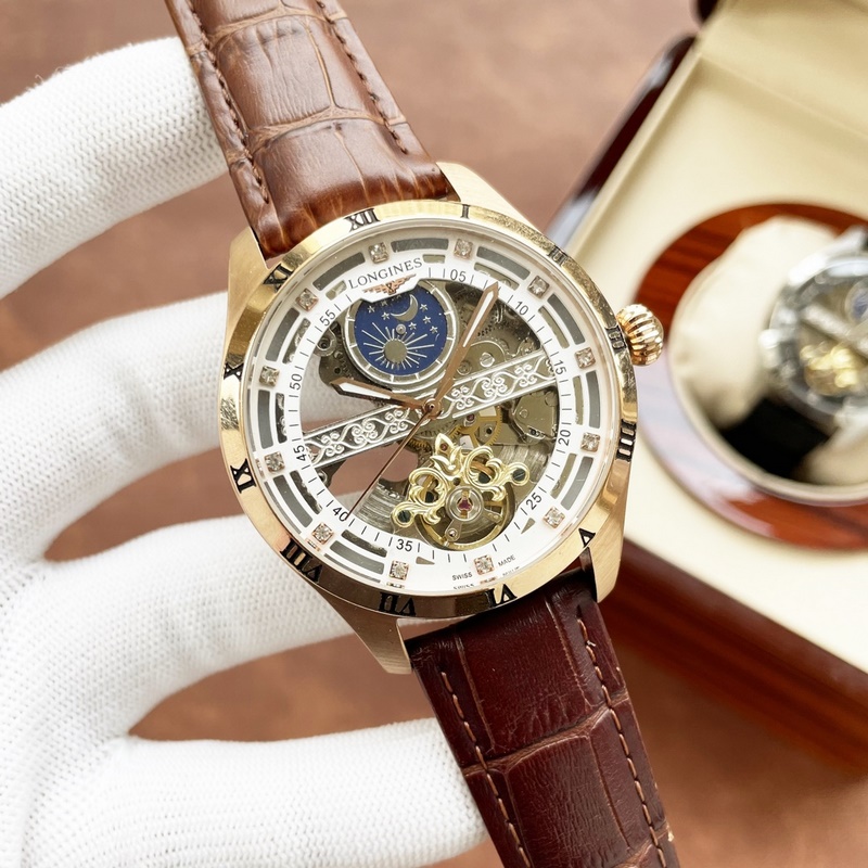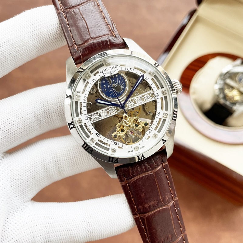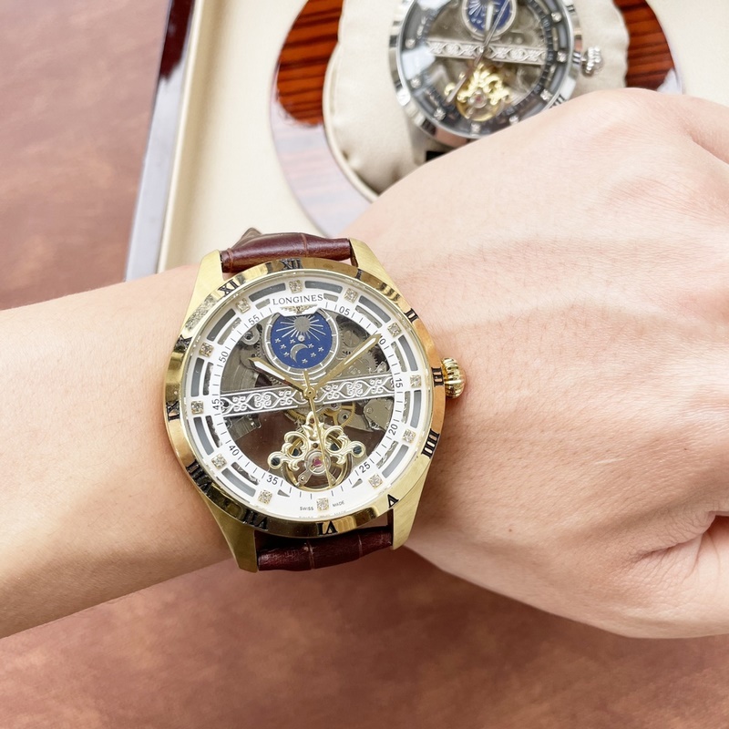 Miesten Longines-kello, jossa on voimakas ontto muotoilu, erinomainen ammattitaito, omaperäisyys, jalo tunnelma ja herrasmiestyyli. Se ottaa käyttöön täysin automaattisen mekaanisen liikkeen, top 316 ruostumattomasta teräksestä valmistettu kotelo, maahantuotu vasikannahkahihna, mineraalinen superpeili, koko 43-13