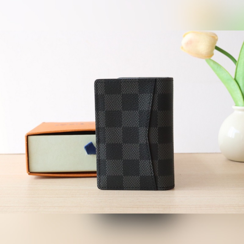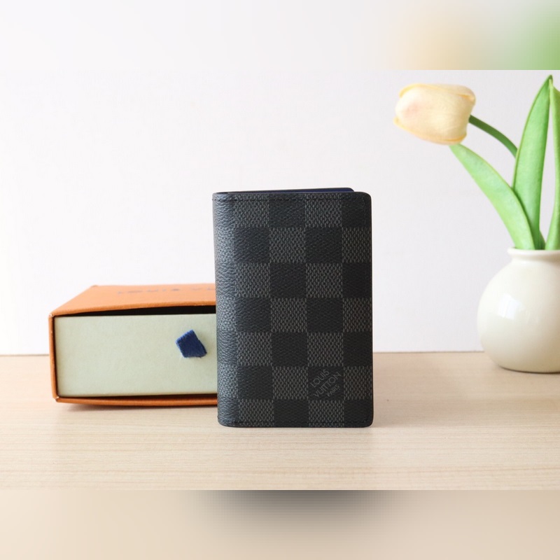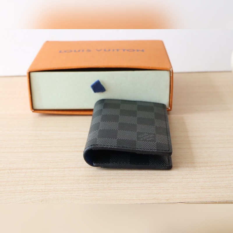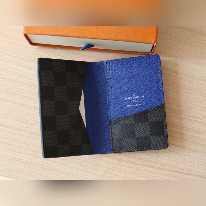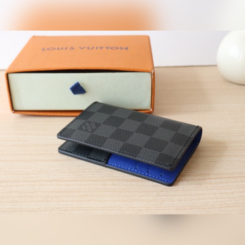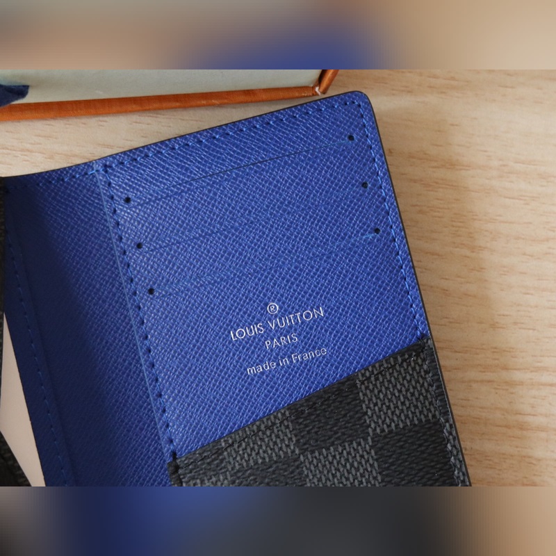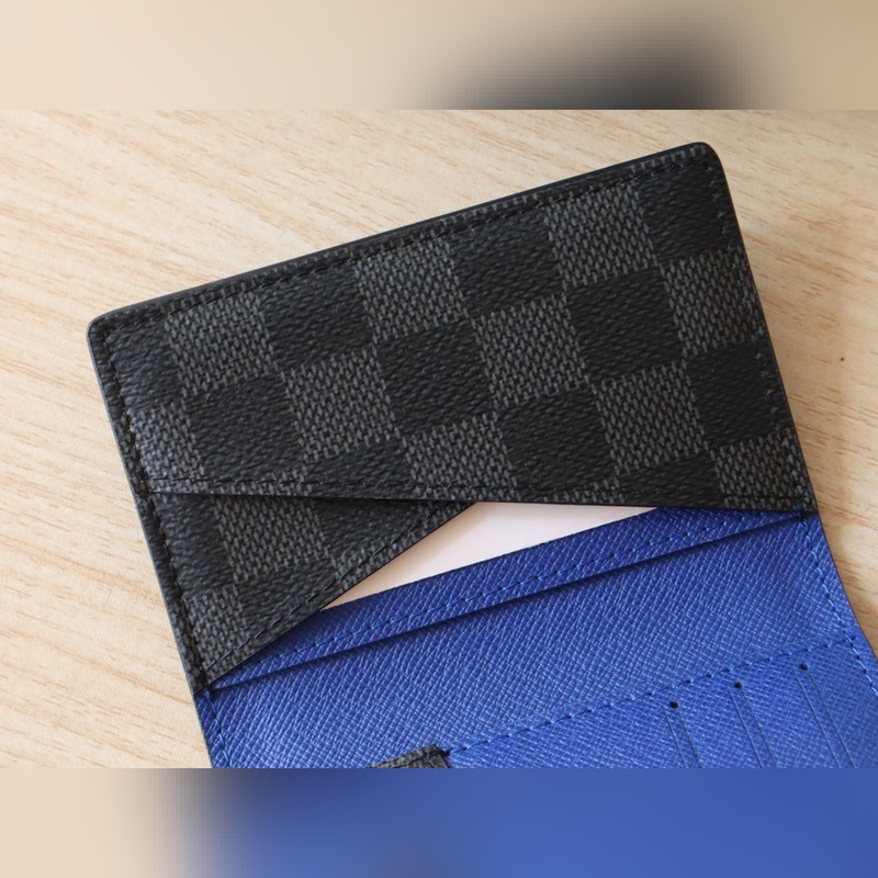 Valmistettu klassisesta Damier Graphite -päällystetystä kankaasta, vuorattu sinisellä lehmännahalla, mikä lisää harmaaseen shakkitauluun modernia ilmettä. Tämä kompakti lompakko mahtuu helposti mihin tahansa taskuun setelilokeron lisäksi. Koko: