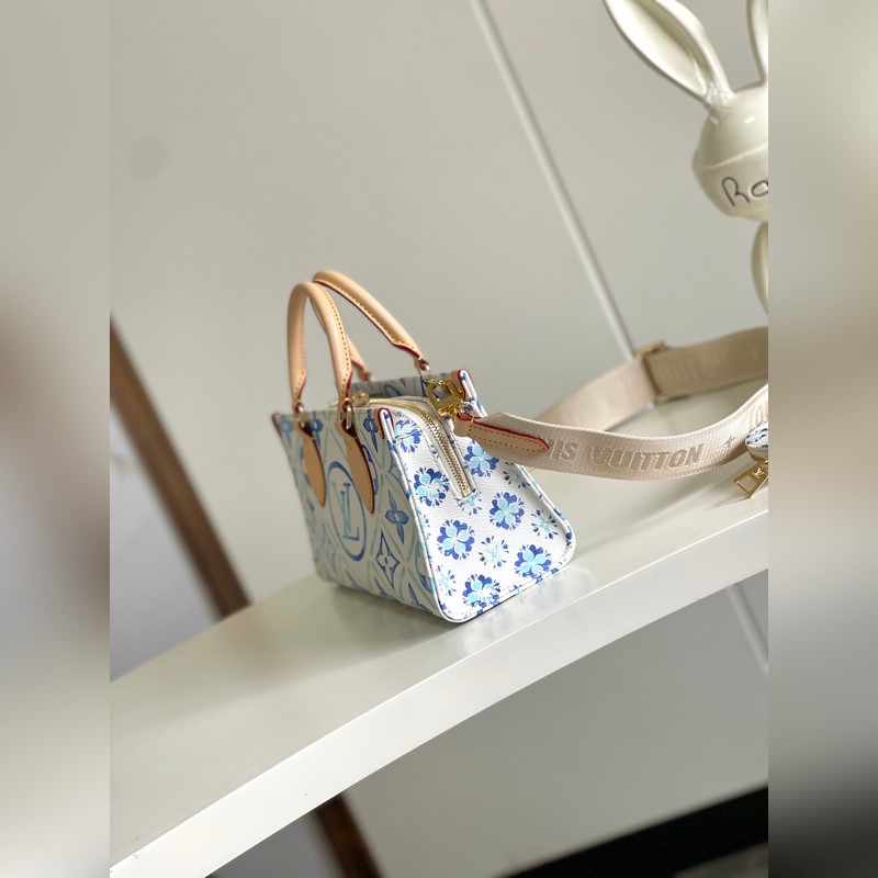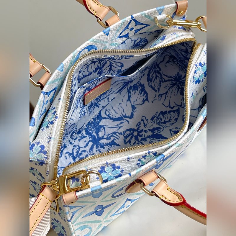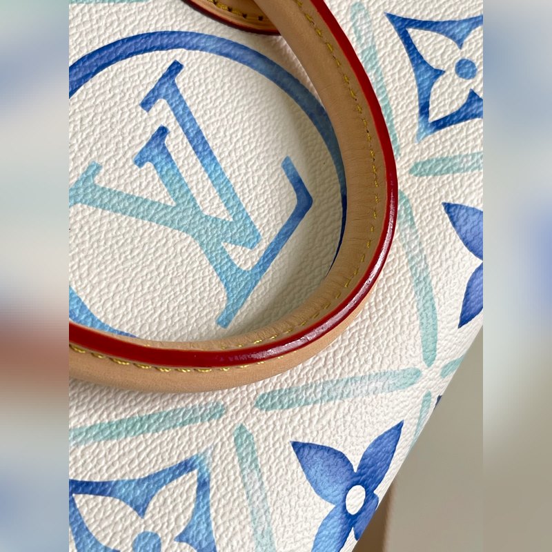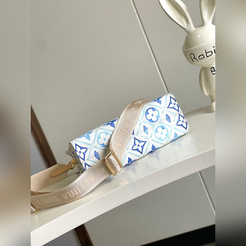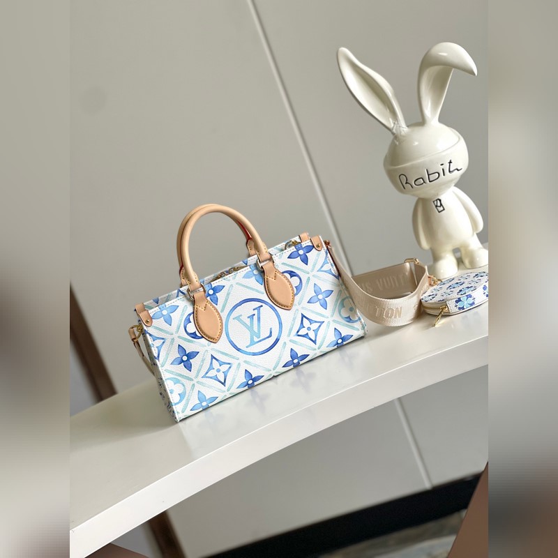 Haiyuan ulkomainen single real home shot M25318 sininen Tämä OnTheGo East West -käsilaukku on muodoltaan ainutlaatuinen ja valmistettu kankaasta. Se on yksi LV By The Ool -sarjan tähtituotteista. LV Circle ja Monogram Flowers käyttävät epäsäännöllisiä pastellisävyjä tuomaan mieleen kaukaiset rannikot. Leveän irrotettavan olkahihnan ansiosta tämä käsilaukku sopii useilla tavoilla yhteen.