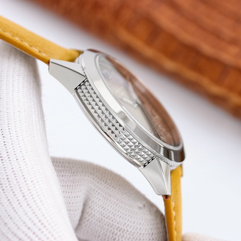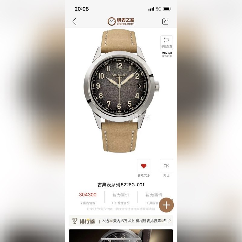 Koko: 40mm Kotelo: Patek Philippen Calatrava-sarjan kellot ovat kuuluisia pyöristetyistä ja sileistä kotelomuodoistaan. Tänään Patek Philippe on suunnitellut tämän mallin uudelleen tämän ominaisuuden perusteella, ja kotelon kylkeen on kaiverrettu Paris-kynsikuvio. Paris-kynsikuvio on Patek Philippen klassinen elementti ja se ilmestyy uudelleen vuonna 2021 lanseeratussa Calatrava Paris -kynsikuviokellossa Ref.6119. Lisäksi suunnittelijat ovat kehittäneet erikoiskotelorakenteen, joka integroi korvakkeet kotelon takaosaan niin, että Paris-naulakuosi peittää kotelon sivun. Kirjaimet: Hiilenharmaa kellotaulu huokuu retrotajua, ja sen reunoissa on musta kaltevuusefekti, ja sen hienovarainen rakeisuus muistuttaa antiikkikameran koteloa. Kellotaulu on yhdistetty valkokultaisiin kolmiulotteisiin lohkoihin, jotka on päällystetty beigellä fluoresoivalla pinnoitteella, ja hillittyyn ja hillittyyn “rautatie”-asteikkoon. Valkokultaiset neulanmuotoiset tunti- ja minuuttiosoittimet on peitetty beigellä fluoresoivalla pinnoitteella. 3-numeroisessa kohdassa on päivämääräikkuna, jossa on beigejä kirjainlohkoja ja musta tausta. Liike: 9015 modifioitu Cal.26-330 S C. Liikesilta on viistetty, reunat huolellisesti kiillotettu, iso ja pieni vaneri on koristeltu kalan suomuilla ja Geneven aalloilla, vanerin pinta on kaiverrettu kullalla, ruuvin urat on kiillotettu ja viistetty (Philippen kaikki yksityiskohdat on painettu klassisella Patek P -liikkeellä ovat paremmin alkuperäisen mukaisia). Ranneke: Uudessa Ref.5226G-001 kellossa on kaksi vaihdettavaa ranneketta, joista toinen on beigeä mokkanahkaa ja toinen mustaa vasikannahkaa, koristeltu kohokuvioiduilla tekstuurikuvioilla ja beigeillä ompeleilla. Molemmat hihnat on varustettu platinapinnoilla ja pikalukitusjousikorvoilla, mikä helpottaa hihnojen vaihtoa. 5296:n lopettamisen jälkeen PP:stä puuttui alkuperäinen. Tällainen iso kolmen käden kello on tyylikäs ja upea.
