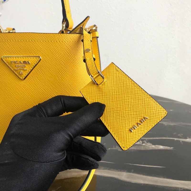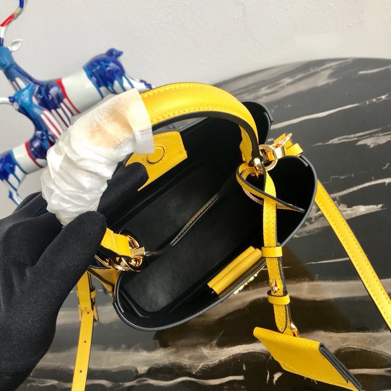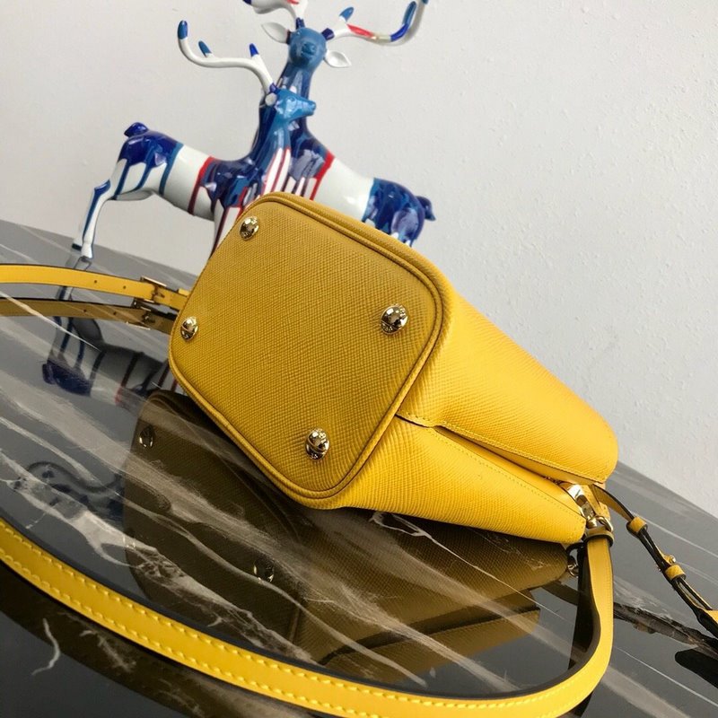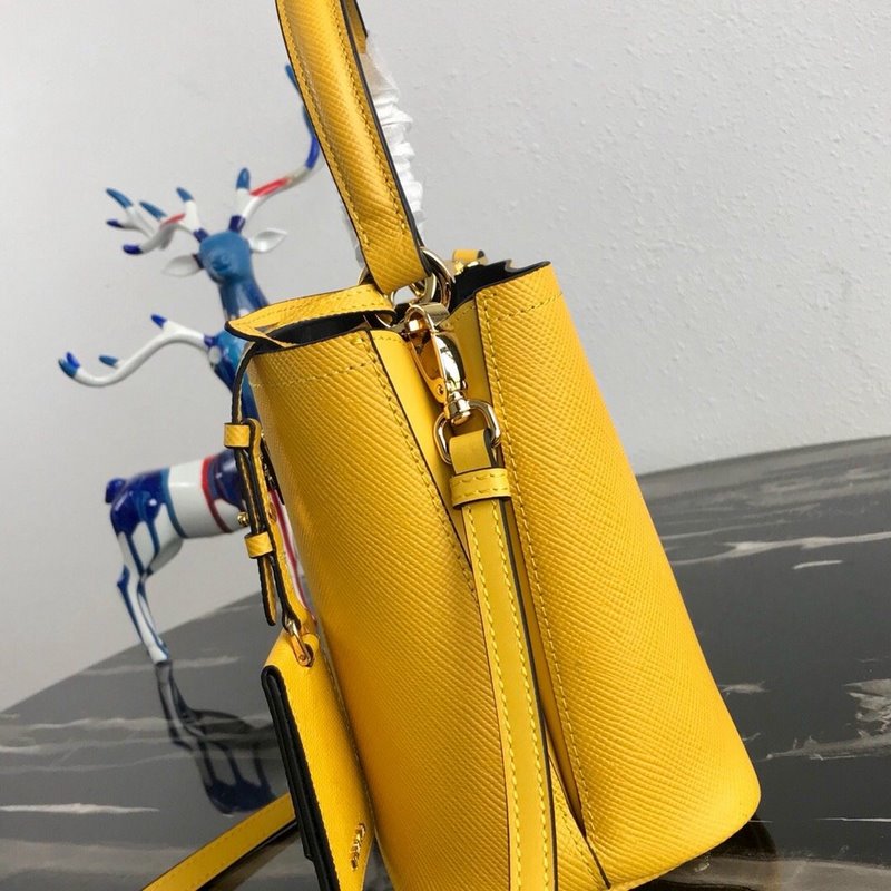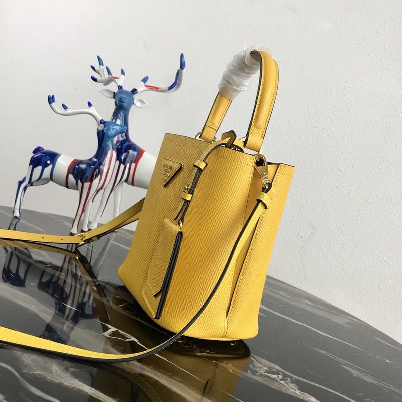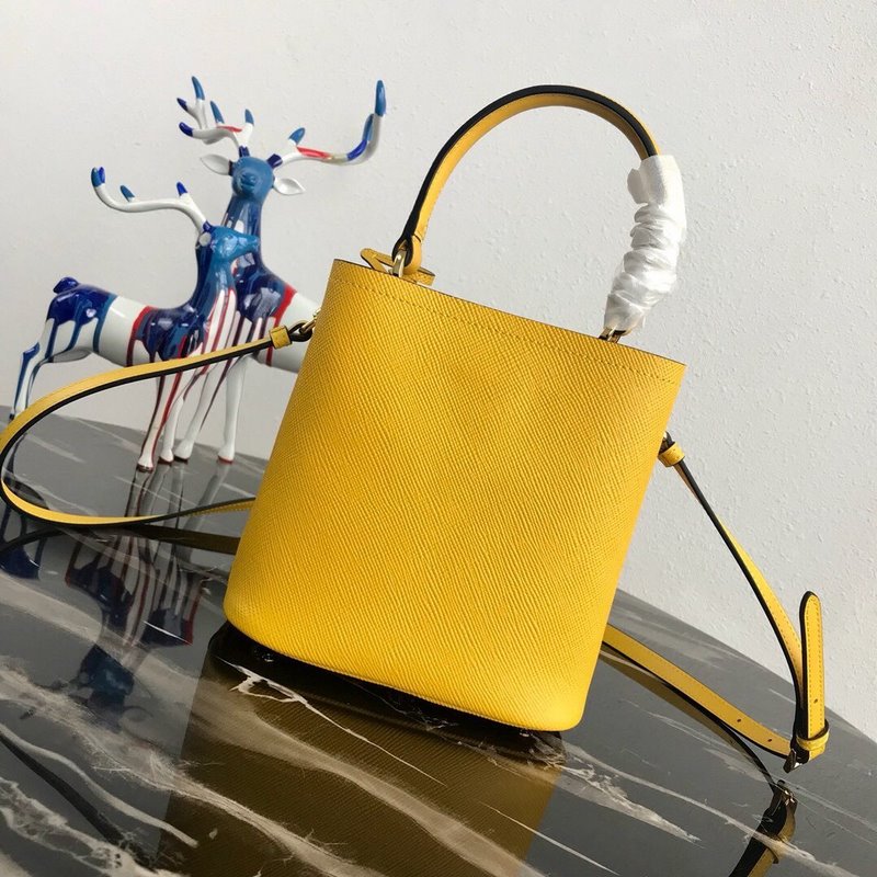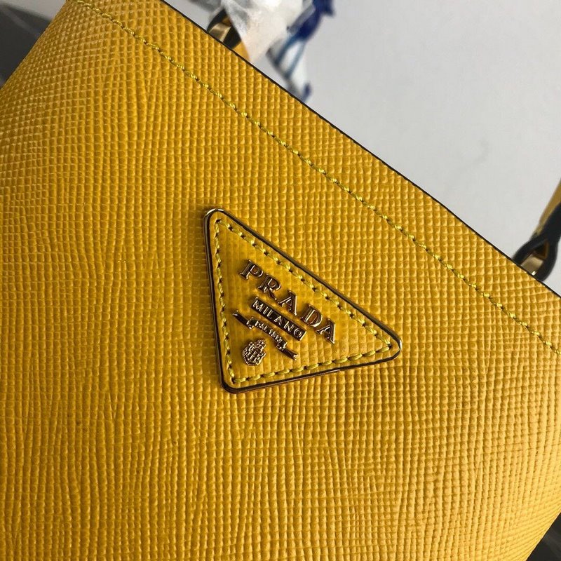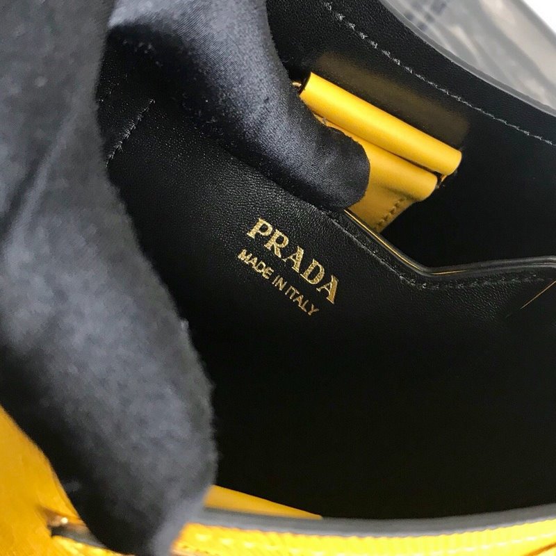 Pradan suosittu mallinumero: 1BA217 (minikoko) ämpärilaukku Valmistettu Saffianon nahasta Nahkakahvat