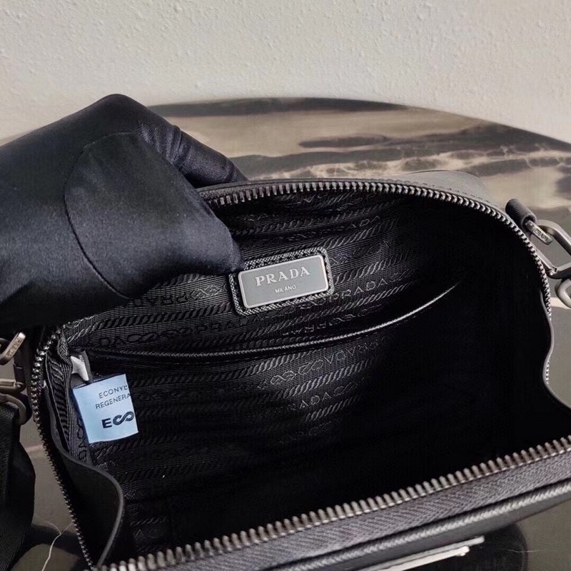 Kierrätetystä nylonia ja Saffiano-nahkaa käytetään luomaan yksinkertaisia linjoja ja jäsenneltyä siluettia, joka on erottuva. Käsilaukku on varustettu olkahihnalla ja koristeltu logolla, joka yhdistää toimivuuden ja brändityylin. Irrotettava kudottu nailon- ja nahkainen olkahihna, irrotettava pussi, emaloitu kolmion muotoinen metallilogo edessä + vetoketjukiinnitys + sisäinen paikkatasku + kierrätetty nailonlogopainatusvuori