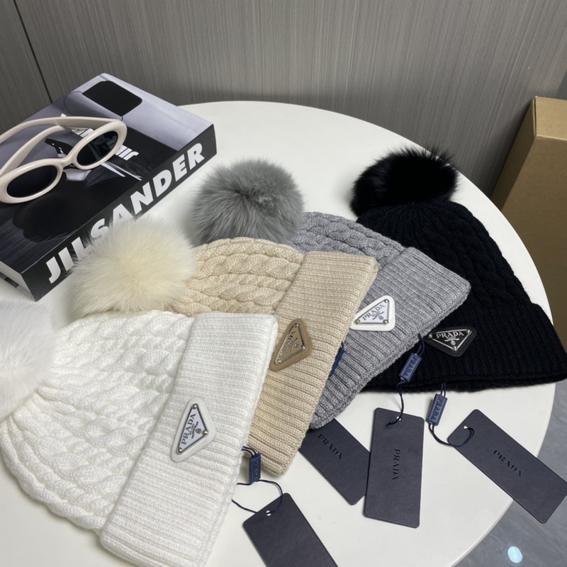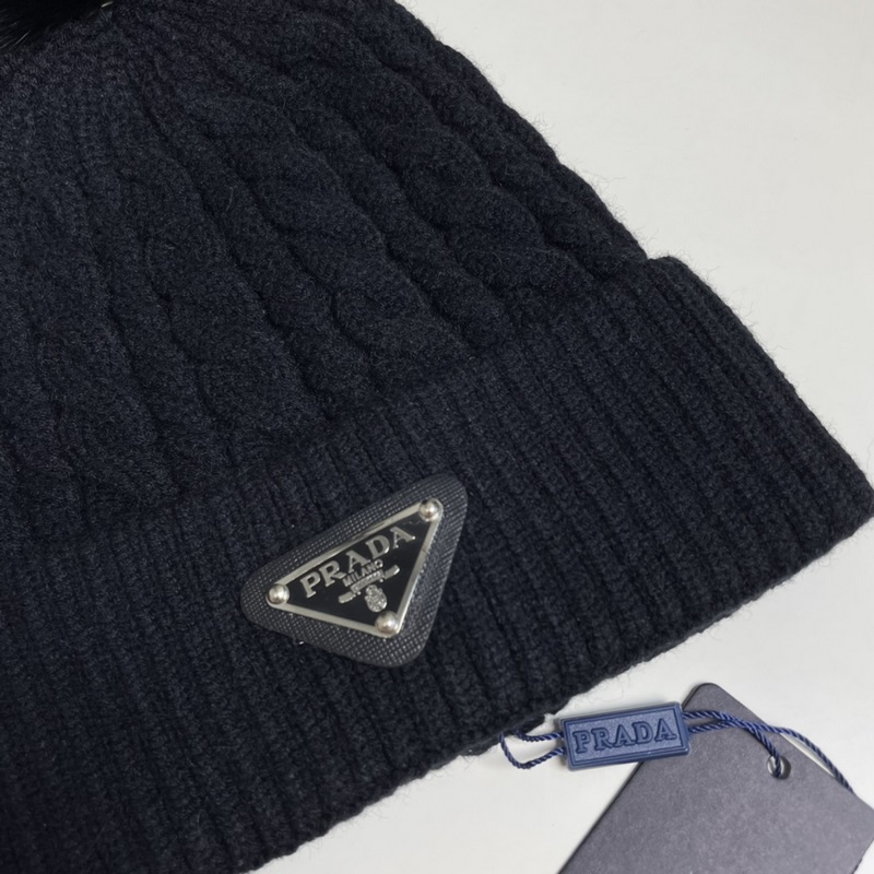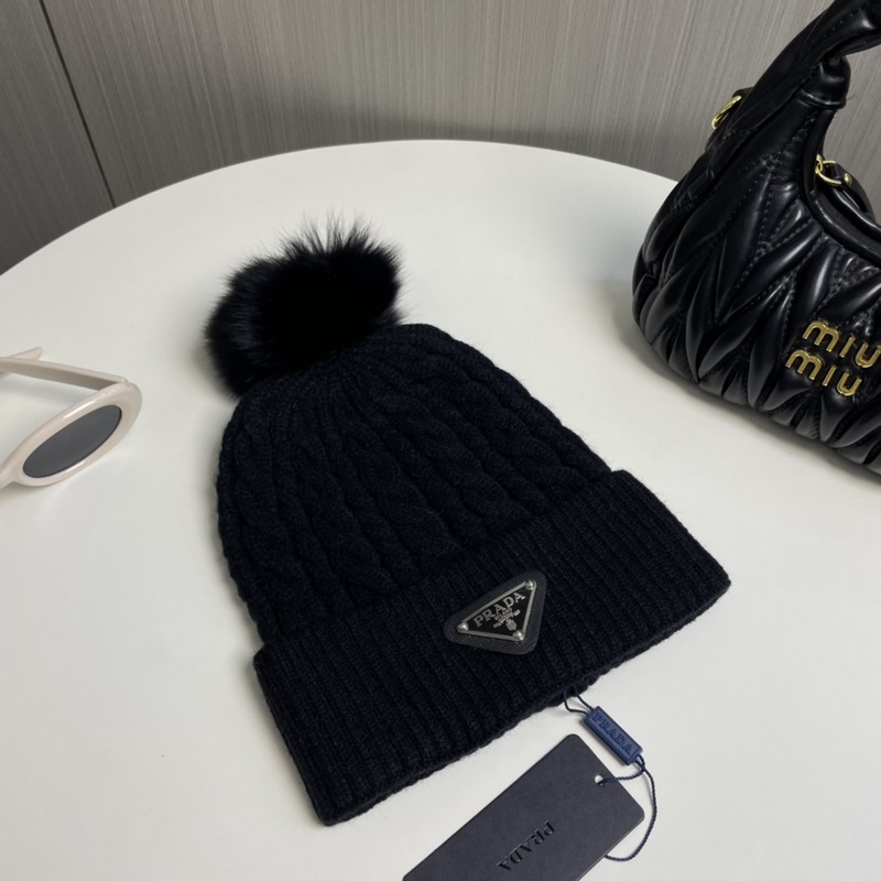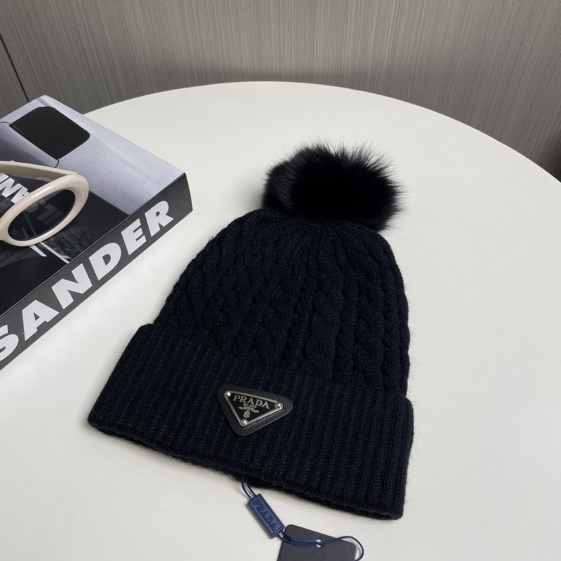 Prada klassinen alkuperäinen neulottu villahattu, valmistettu valitusta villakankaasta, erittäin korkea villapitoisuus, superpehmeä tuntu, erinomainen joustavuus, kanin turkispallolla, korkealuokkainen, ikääntyvä, super lämmin
