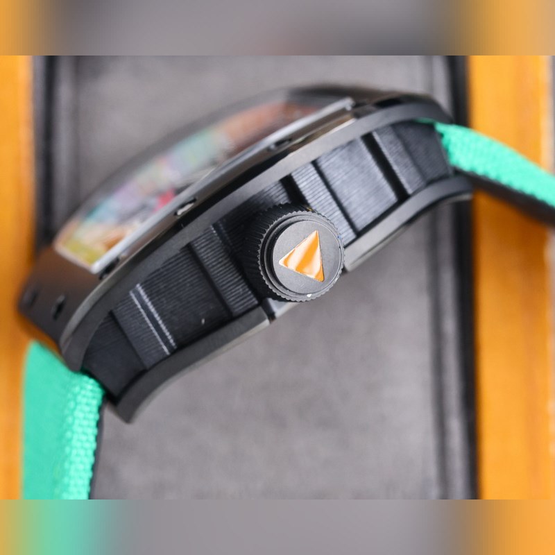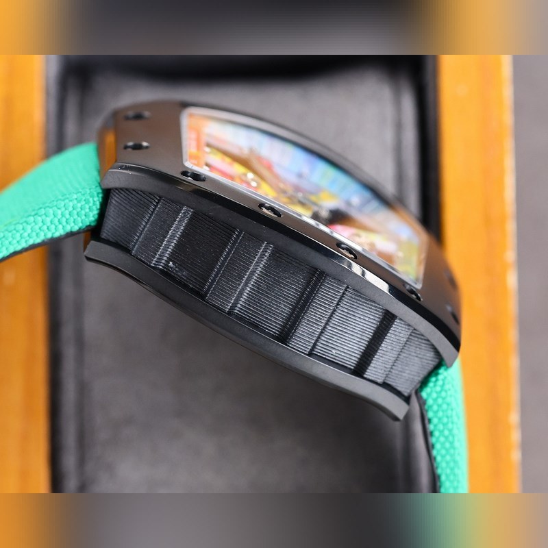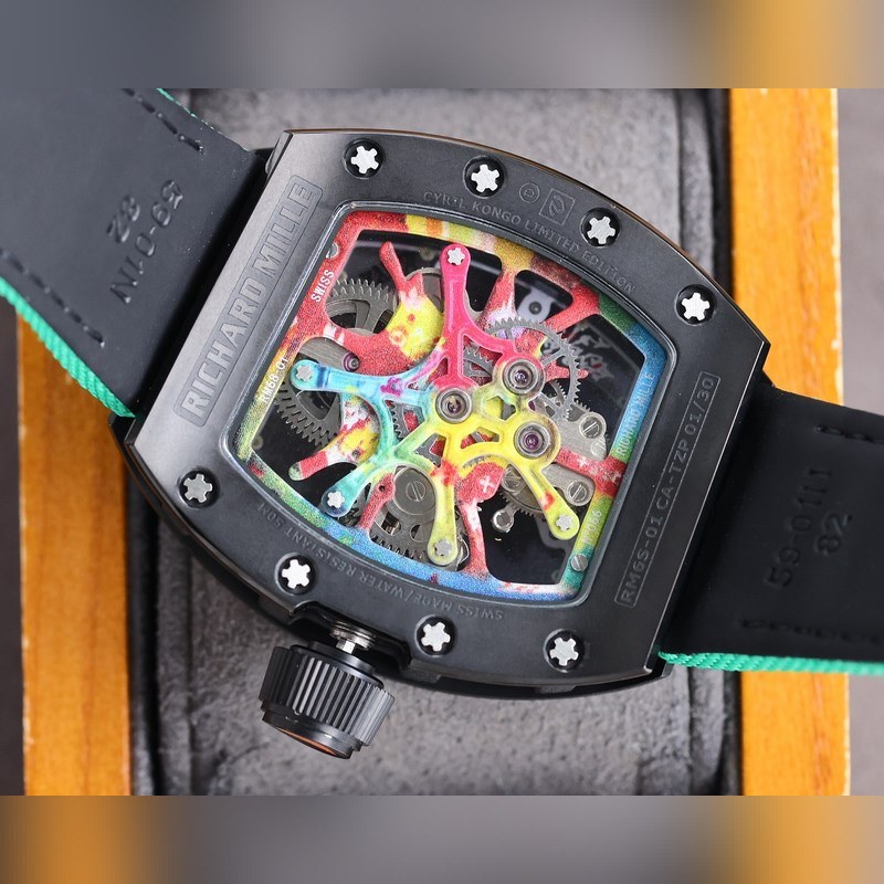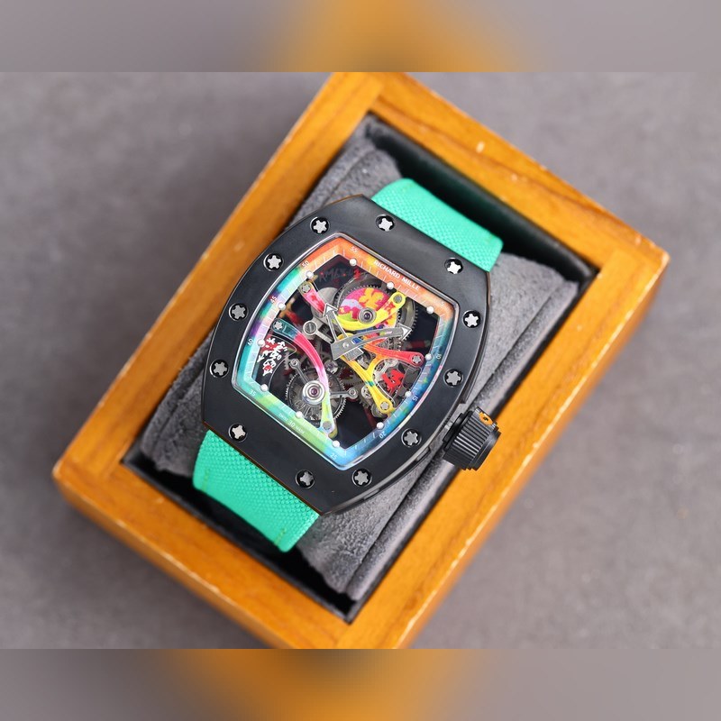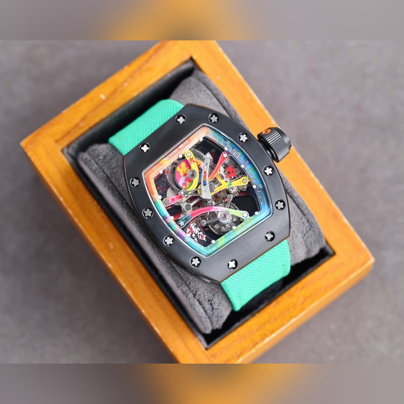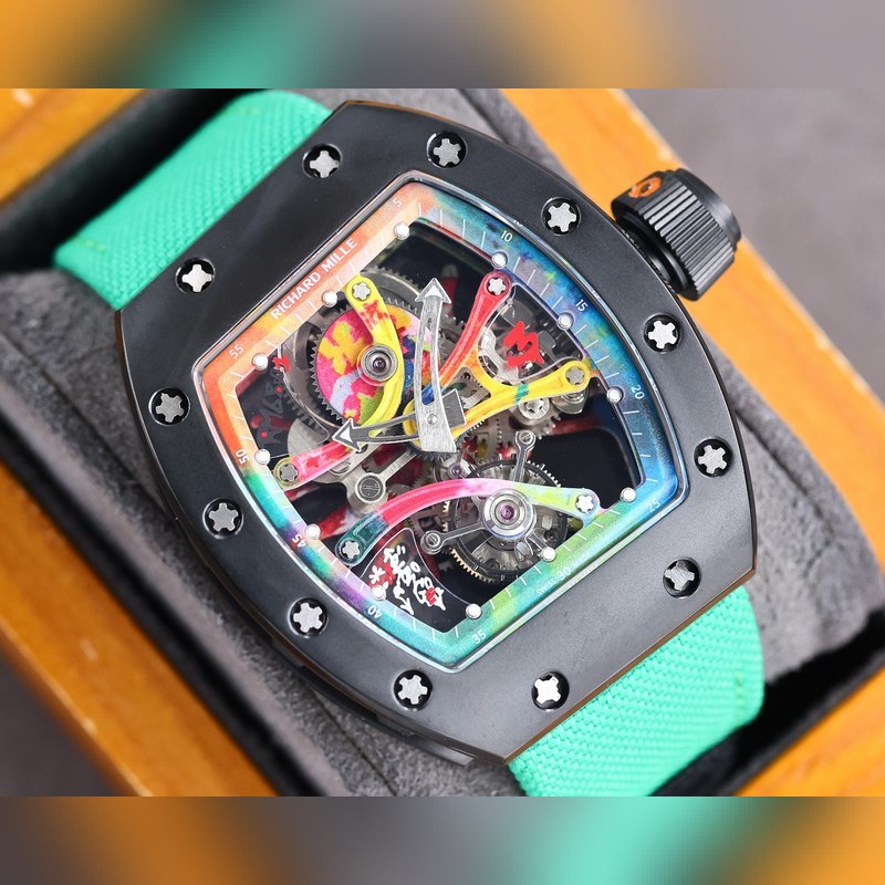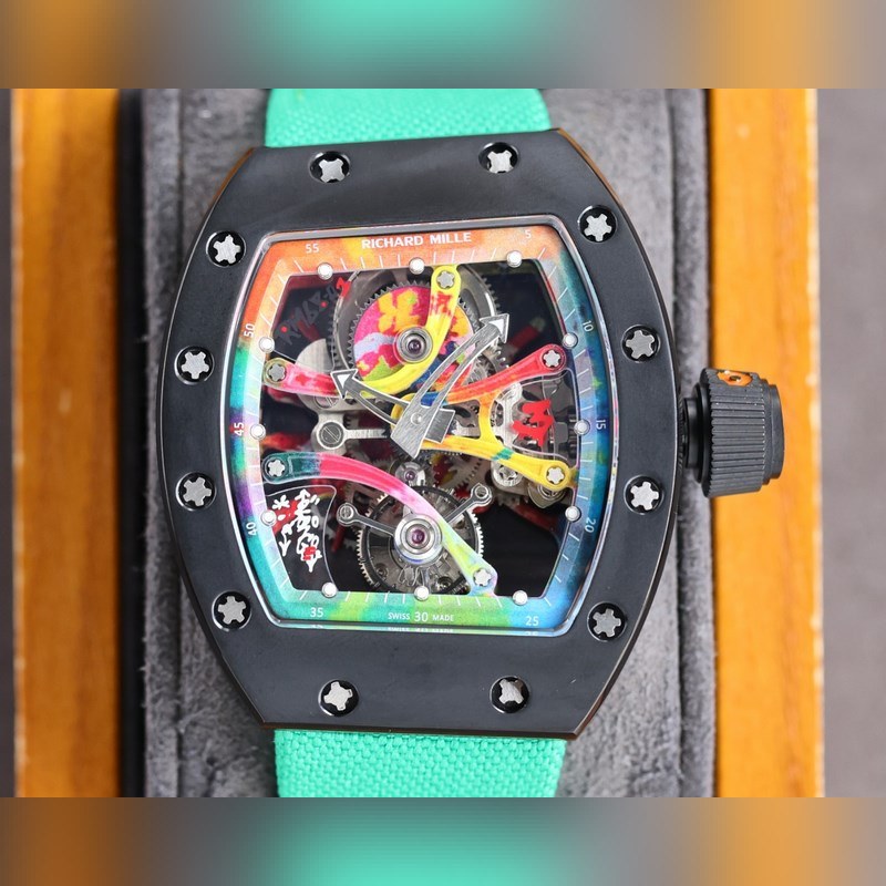 Tulen graffitimestarilta, tämä kello on innovatiivinen teos Graffiti Master Cyril Phanilta. Anna tämän kellon seurata sinua värikkääseen maailmaan. Värikäs. Kävely muodin kärjessä. RICHARD MILLE erikoispainos. Erinomainen, erityinen persoonallisuus. Ainutlaatuinen. Käytä sitä. Hieno tunne ja kokemus. Tervetuloa maistamaan tätä kelloa, jolla on dominoiva ja esteetön muoto ja järkyttävä viehätys. Kirkkaalla ja värikkäällä nahkaisella valohihnalla se on tyylikkäämpi ja avantgardisempi. Värikkäänä kesänä puet päällesi lyhythihaisen T-paidan ja kirkkaan kellon ranteeseen. Eikö olekin kovin silmiinpistävää Sen rinnalla on tuotu täysin automaattinen mekaaninen liike ja safiiri naarmuuntumaton lasi