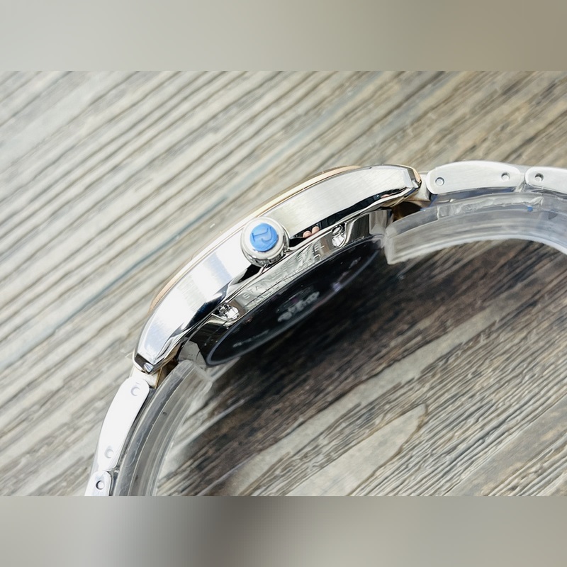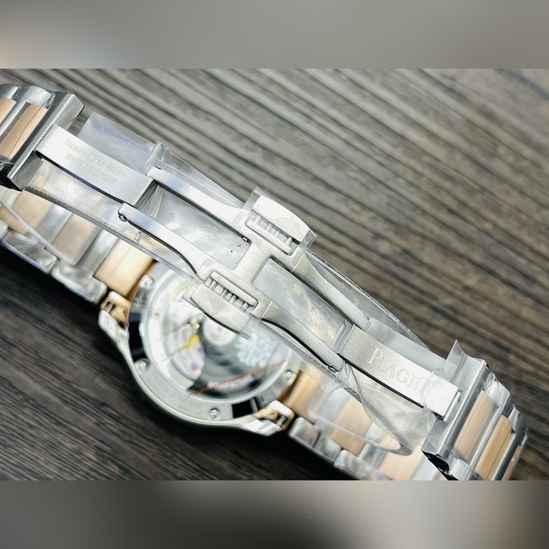 2 316L ruostumatonta terästä olevaa koteloa, I-muotoinen hihna vaakasuorilla harjatuilla helmillä toistaa kotelon muotoa “neliö pyöreällä, pyöreä neliöllä”, alkuperäinen kaksoisnapsautuspainike on painettu Piaget-logolla ja teräshihnan päähän on painettu molemmilla puolilla miesten BBWL P11274 ja naisten P1171PM5BB. Katso yksityiskohdat