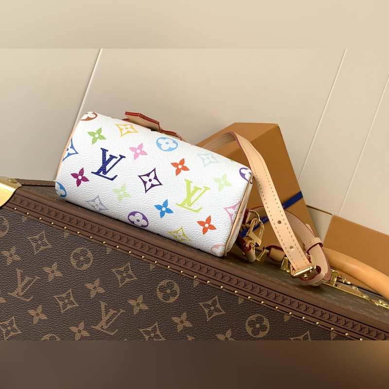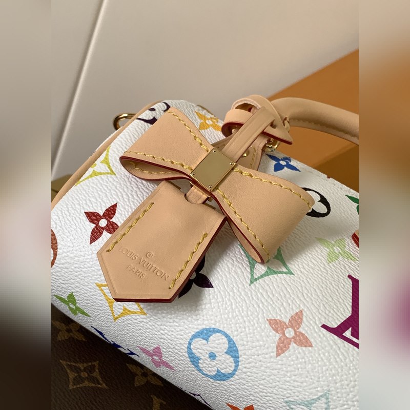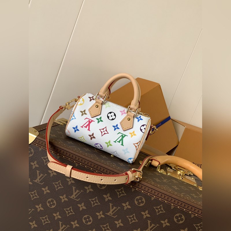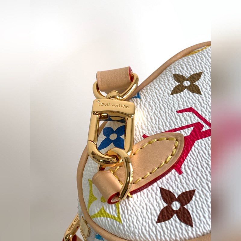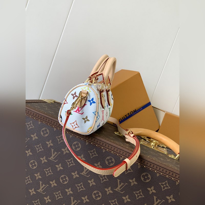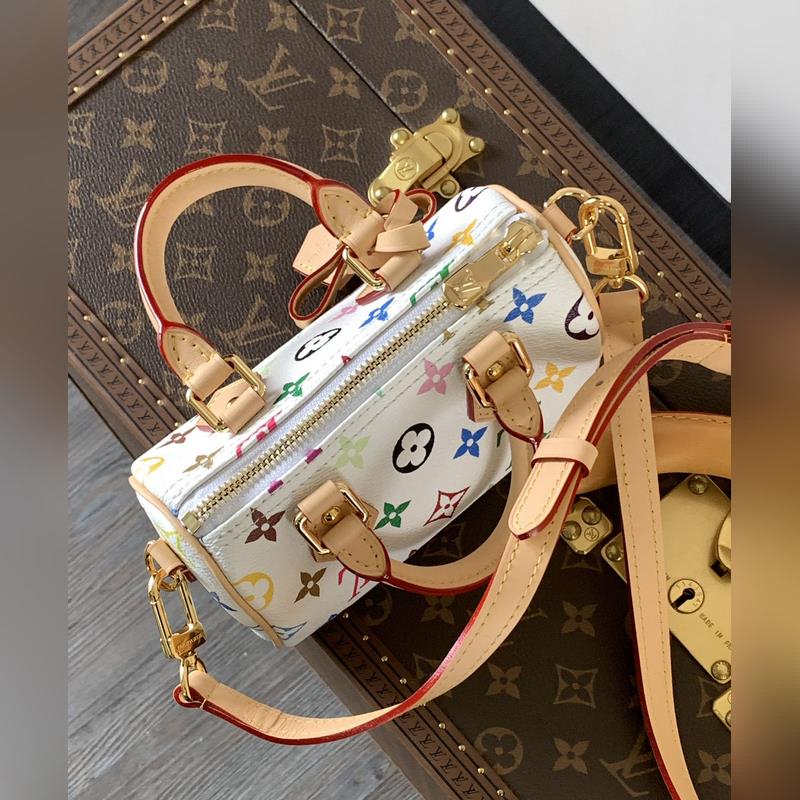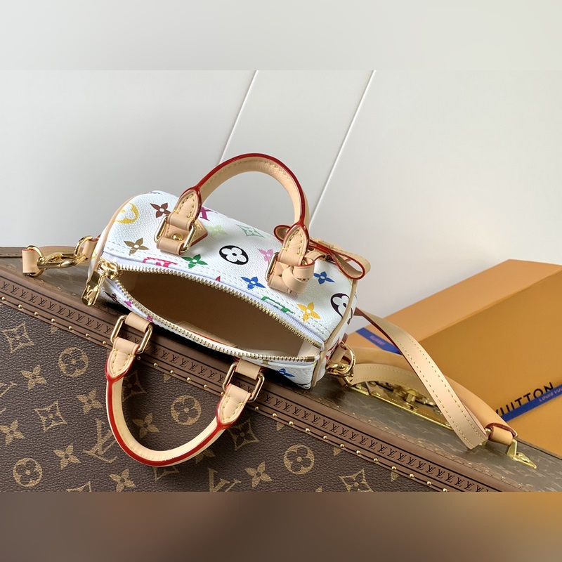 Tässä Nano Speedy -käsilaukussa käytetään Monogrammipäällysteistä kangasta ja lehmännahkaverhoilua luomaan hieno kokoonpano, joka tulkitsee Louis Vuitton x Takashi Murakami re-edition -sarjan älykkään tyylin kirkkailla väreillä. Toron-kahvat ja häikäisevät riippulukot kunnioittavat brändin matkailuperintöä, ja irrotettava ja säädettävä olkahihna sekä tyylikäs LV x TM -avainlaukku täydentävät kokonaisuuden.