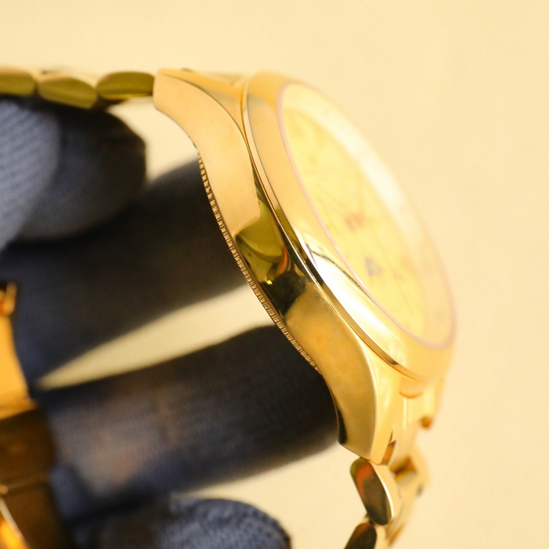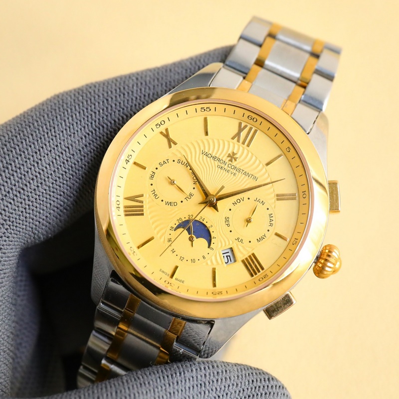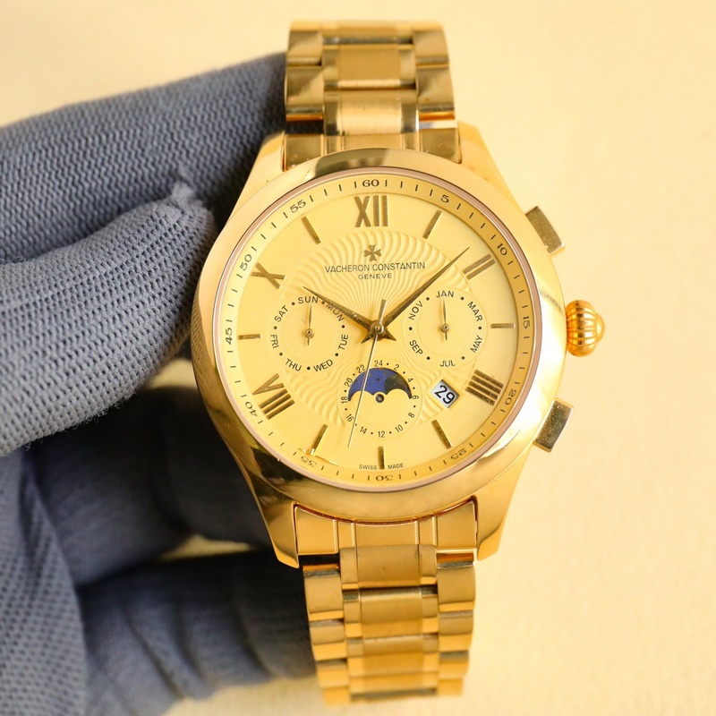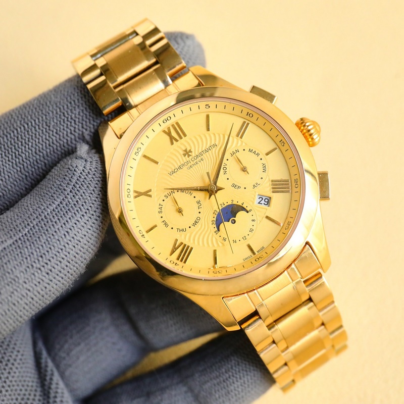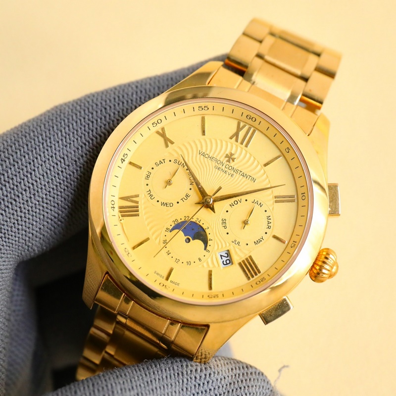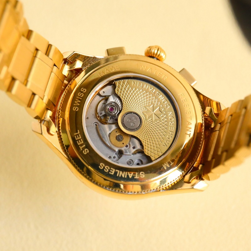 Vacheron Constantin – Vacheron Constantin R46 päivitetty versio Heritage-sarjasta, monitoiminen muotoilu ja huippulaatu. Tärkeitä vinkkejä: (Parannuksia päivitetyssä versiossa: kuori on ohuempi kuin vanha versio, lasi on päivitetty kulutusta ja pudotusta kestäväksi, ja se on tasaisempi ja kauniimpi kuin vanha versio. Sisäkansi on päivitetty teräksiseksi sisäkuoreksi; kellon rakenne ja tuntu näyttävät täydellisemmiltä) 18k laatu uunin ja kellon korjauslaatu… monitoiminen alkuperäinen 9100-koneisto, jossa on kuusinapainen monitoiminäyttö ja huippuluokan ja tunnelmallinen muotoilu (toimintonäyttö: viikko, kalenteri, kuukausi, päivä ja yö, tähdet, 24 tuntia) Kotelo on valmistettu 316 tuodusta hienosta teräksestä ja safiirilasista, jossa on erittäin naarmuuntumaton peili ja erittäin valoisa, jotta yöstä tulee häikäisevämpi. Se on sovitettu maahan tuodun vasikannahkahihnan soljen kanssa. “Voit helposti omistaa aikaa, mutta et voi helposti omistaa Vacheron Constantinia” (todelliset kuvat) Valmistaja suosittelee tätä Vacheron Constantin -sarjaa… Arvokas ranteesi tarvitsee