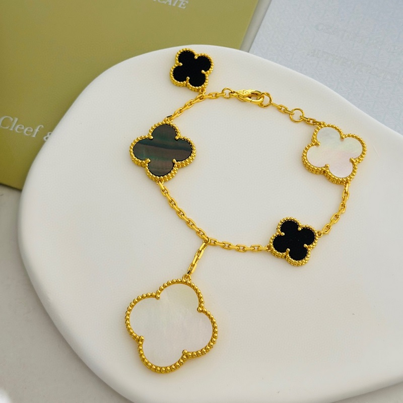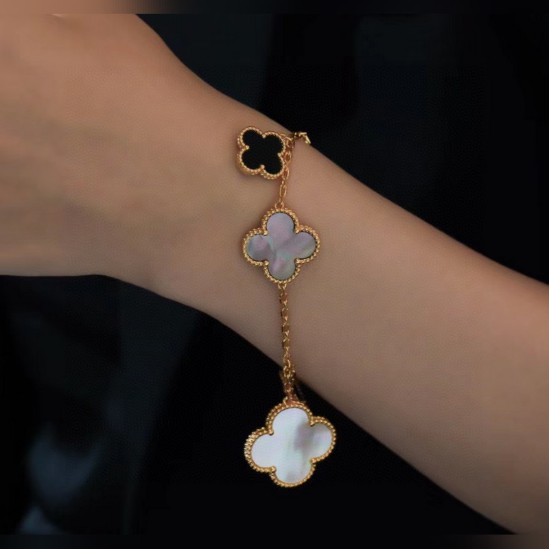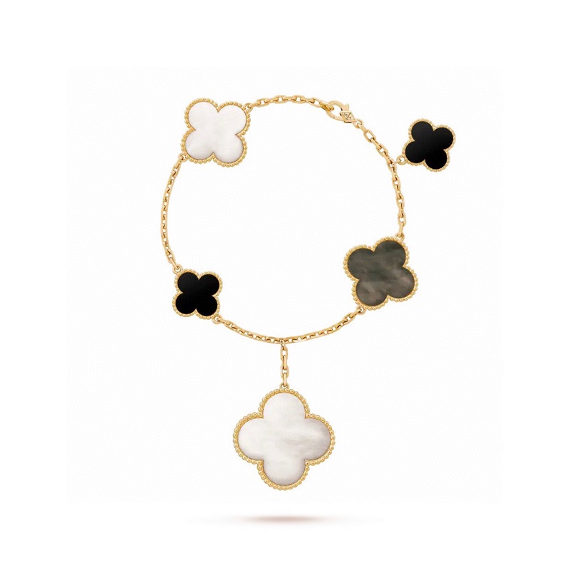 Ostetaan Van Cleef&Arpels VCA viisikukkainen epäsäännöllinen rannekoru, jossa on erikokoisia neliapilaa. Tämä sarja on saanut inspiraationsa nelilehtisestä onnenkuviosta, jossa on epäsymmetrinen muotoilu ja eri materiaalien yhdistelmä. Saatavilla Magic Alhambra -rannekoru, 5 kuviota, valkoinen ja harmaa helmiäinen, musta kalsedoni käsin upotetulla, kulta- ja ruusukulta. Huippuversio