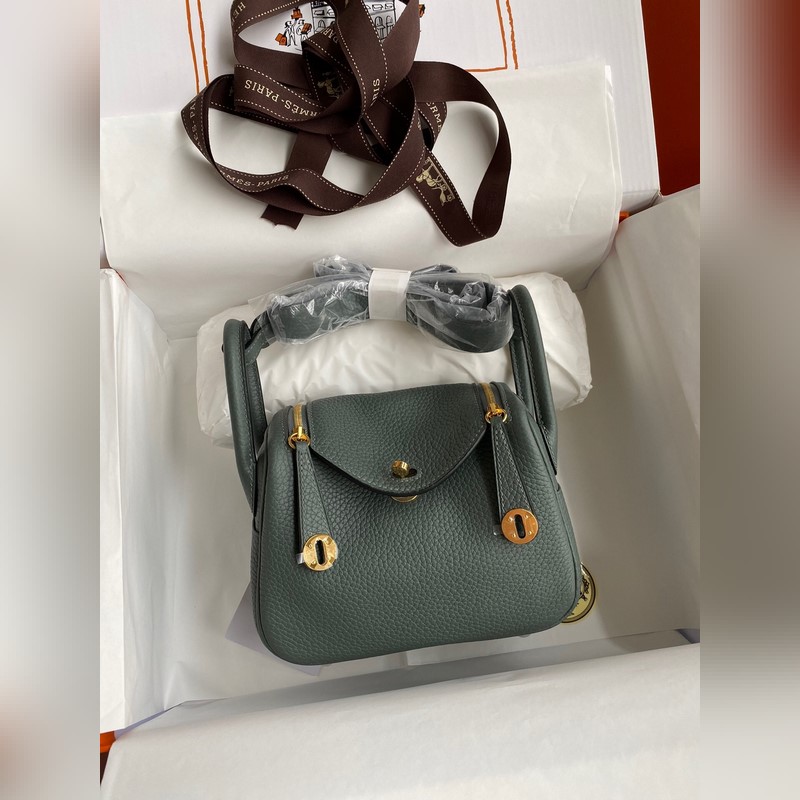Hermès Lindy -käsilaukku, maahantuotu TC-lehmännahkainen mantelinvihreä kultainen hopeasolki